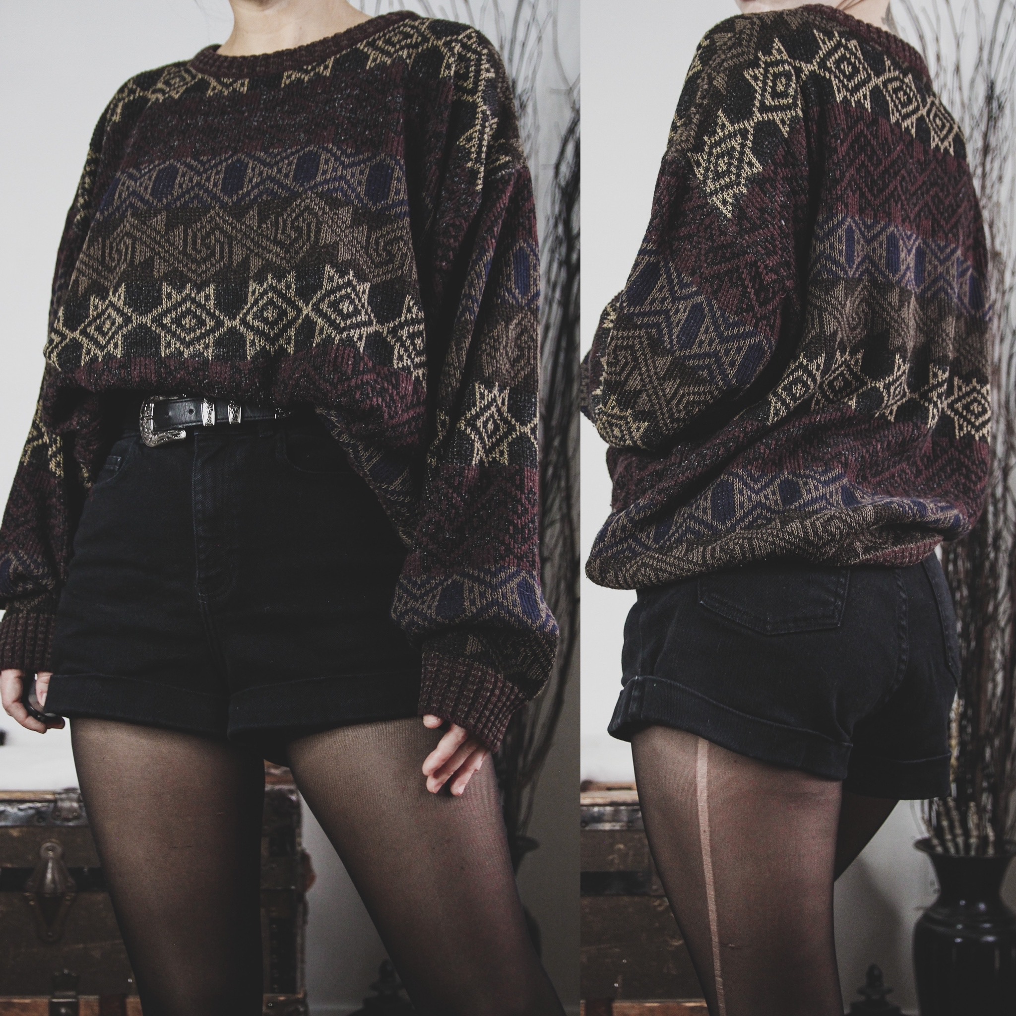 Vintage signature sweater. All Last Rites sweaters are unisex finds, straight out of the 70s, 80s and 90s! This one is a classic geometric print in shades of black, purple-burgundy, navy, beige and olive green.