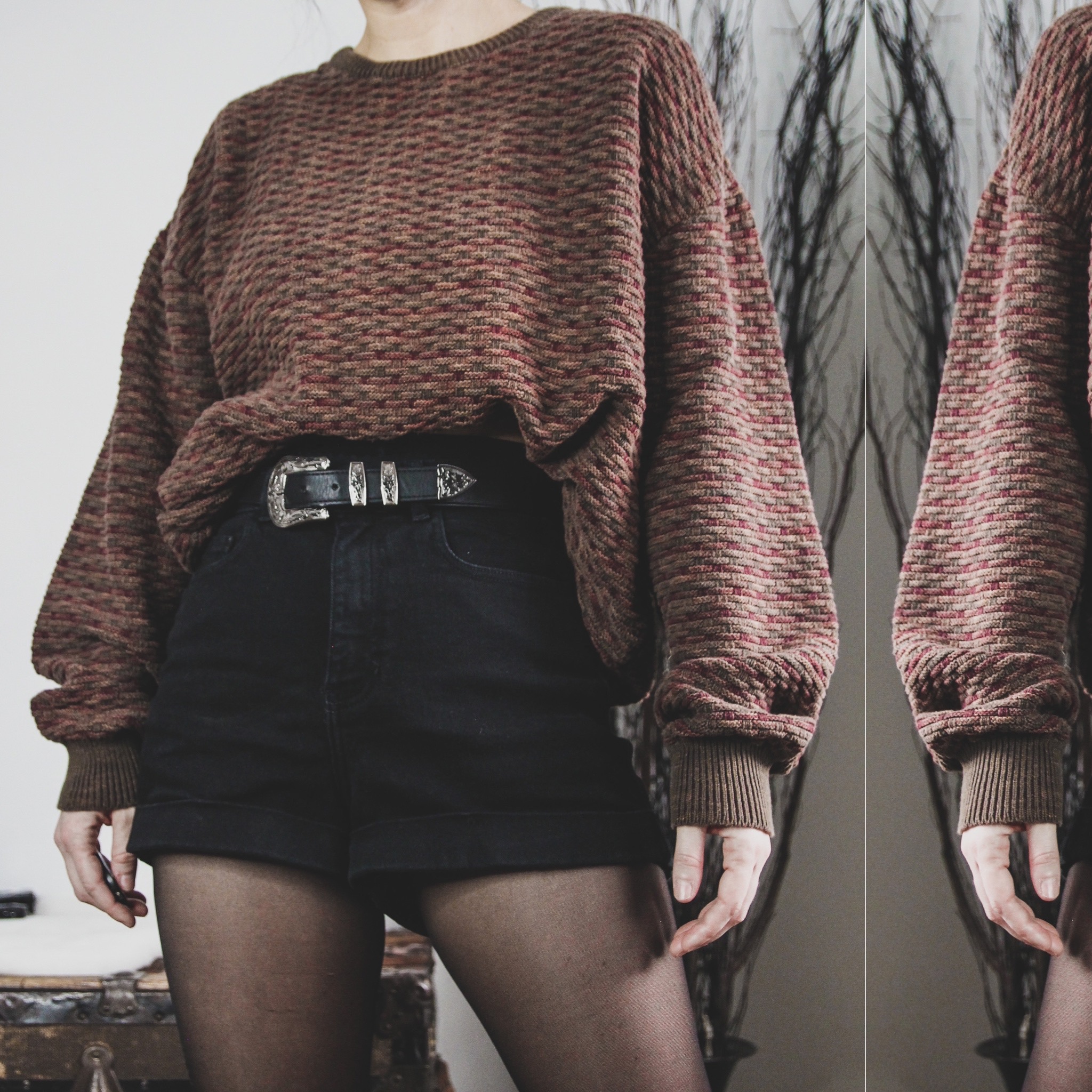 Vintage signature sweater. All Last Rites sweaters are unisex finds, straight out of the 70s, 80s and 90s! Super chunky, sturdy knit in a marled blend of olive, pumpkin orange and burgundy. 100% cotton. Perfectly broken in with little to no itch factor, unless you're very sensitive to knits. Cotton sweaters are less soft and fuzzy compared to other fabrics, but they are more warm and sturdy for tough weather, while also being breathable.