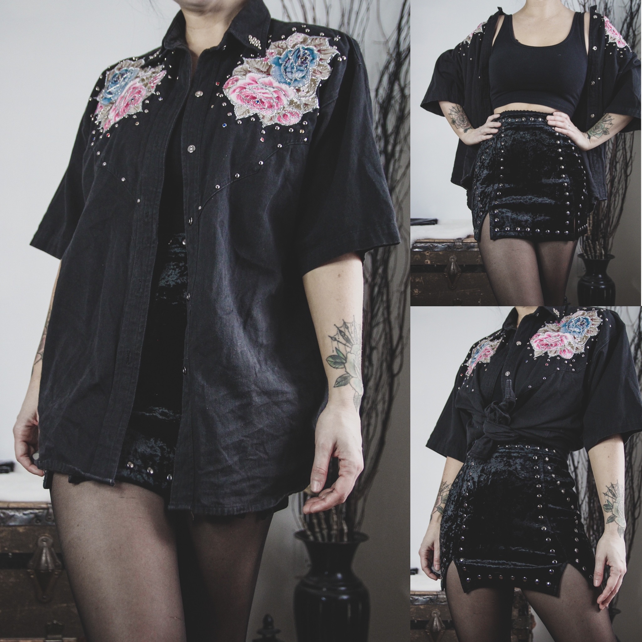 Vintage 80s bedazzled denim shirt. So unique and fun, a collector's item for sure! Faded black lightweight denim (100% cotton), no stretch. Chrome buttons down the front. FULLY bedazzled with gems and studs. Gorgeous floral embroidery with 3D metallic silver stitching, front and back. Standard length, boxy straight cut. Original shoulder pads intact but they can be easily removed if that's not your thing!