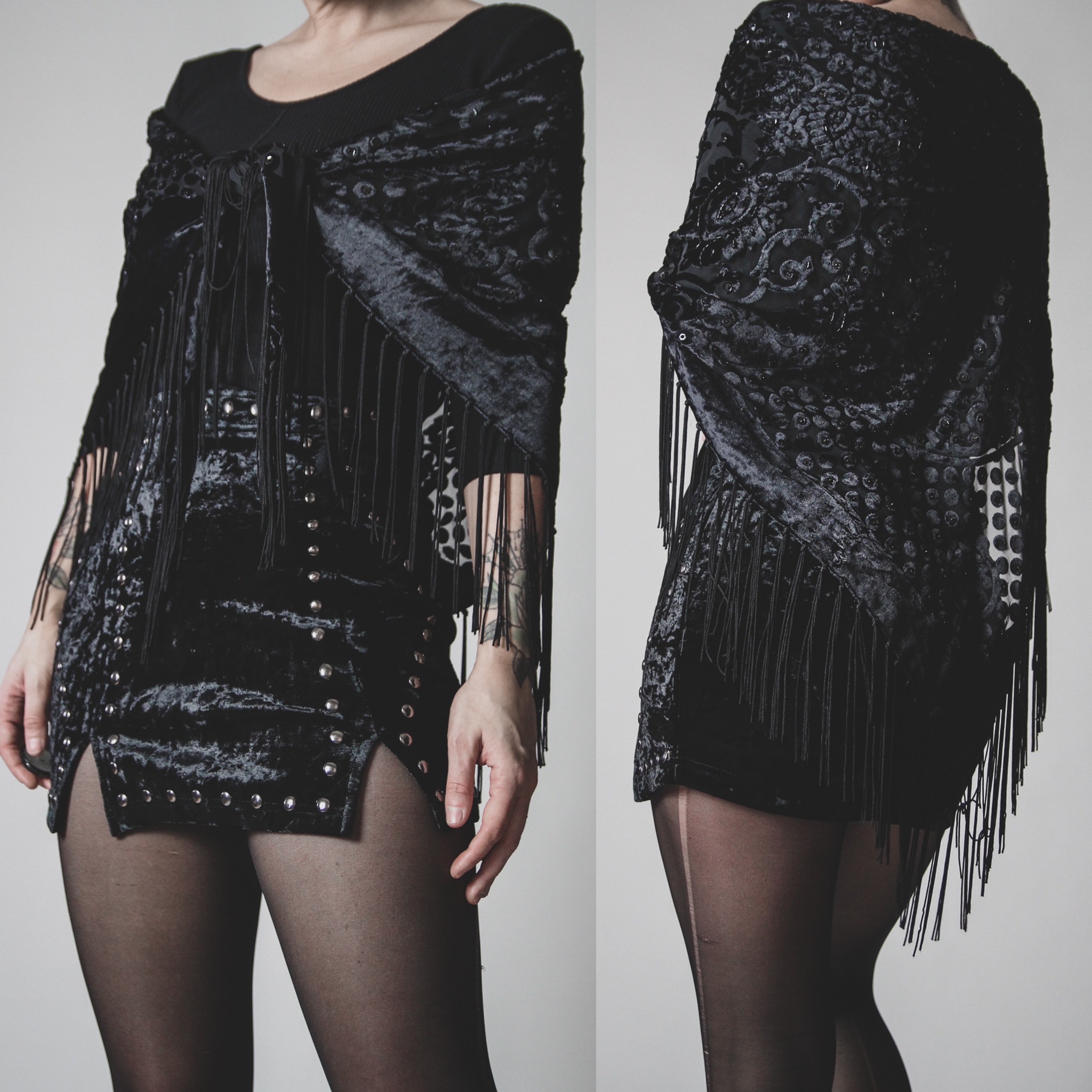 Vintage mourning shawl. All Last Rites signature shawls are one-of-a-kind silk blends with unique colors and patterns - no two are alike! This one is black-on-black with a stained glass-inspired crushed velvet burnout motif and long fringe on two ends. Gorgeous beading and sequin detailing. The perfect accent piece for any witchy look. No stretch, very delicate. Measures about 60" by 30", triangular. Stevie Nicks would be proud! One size fits most.