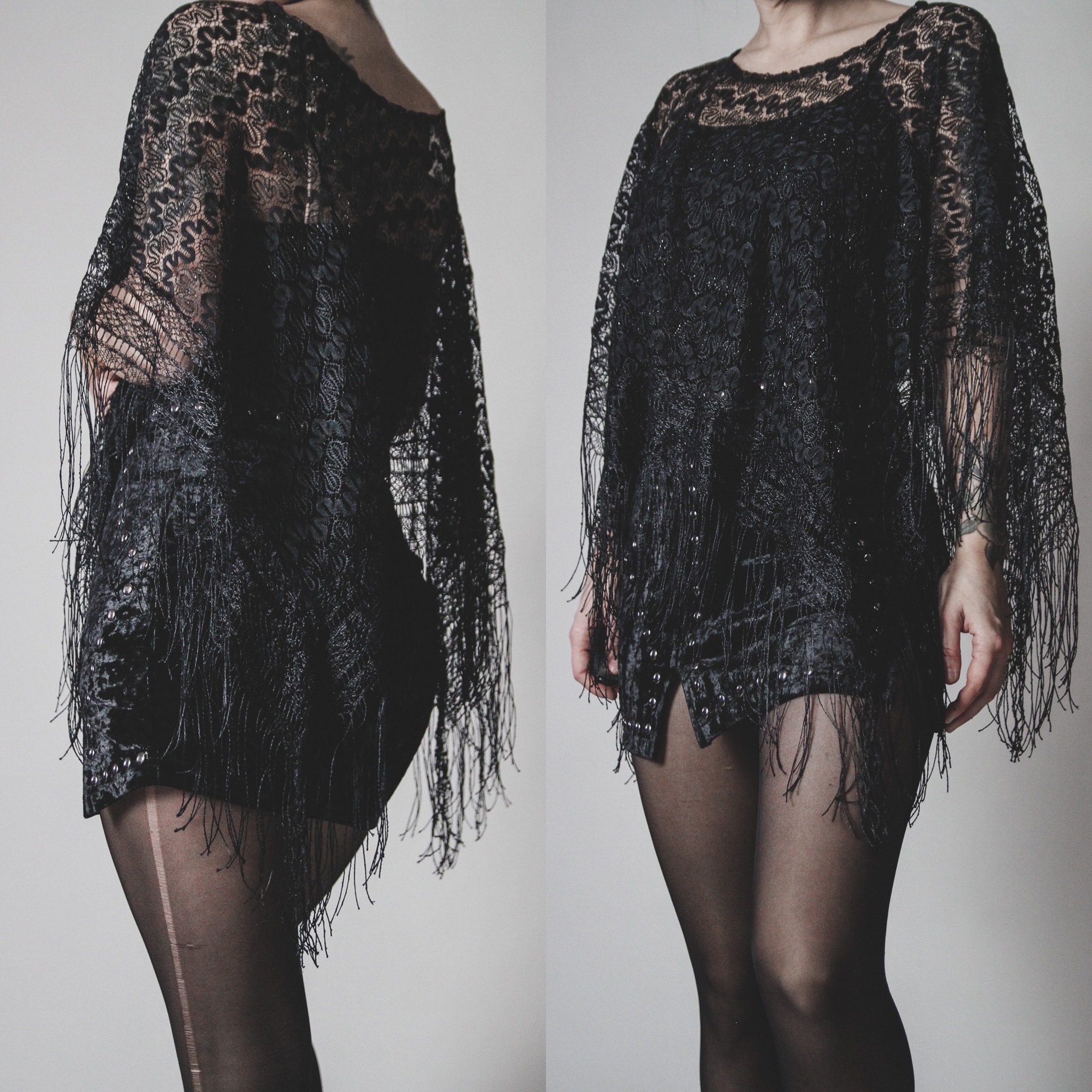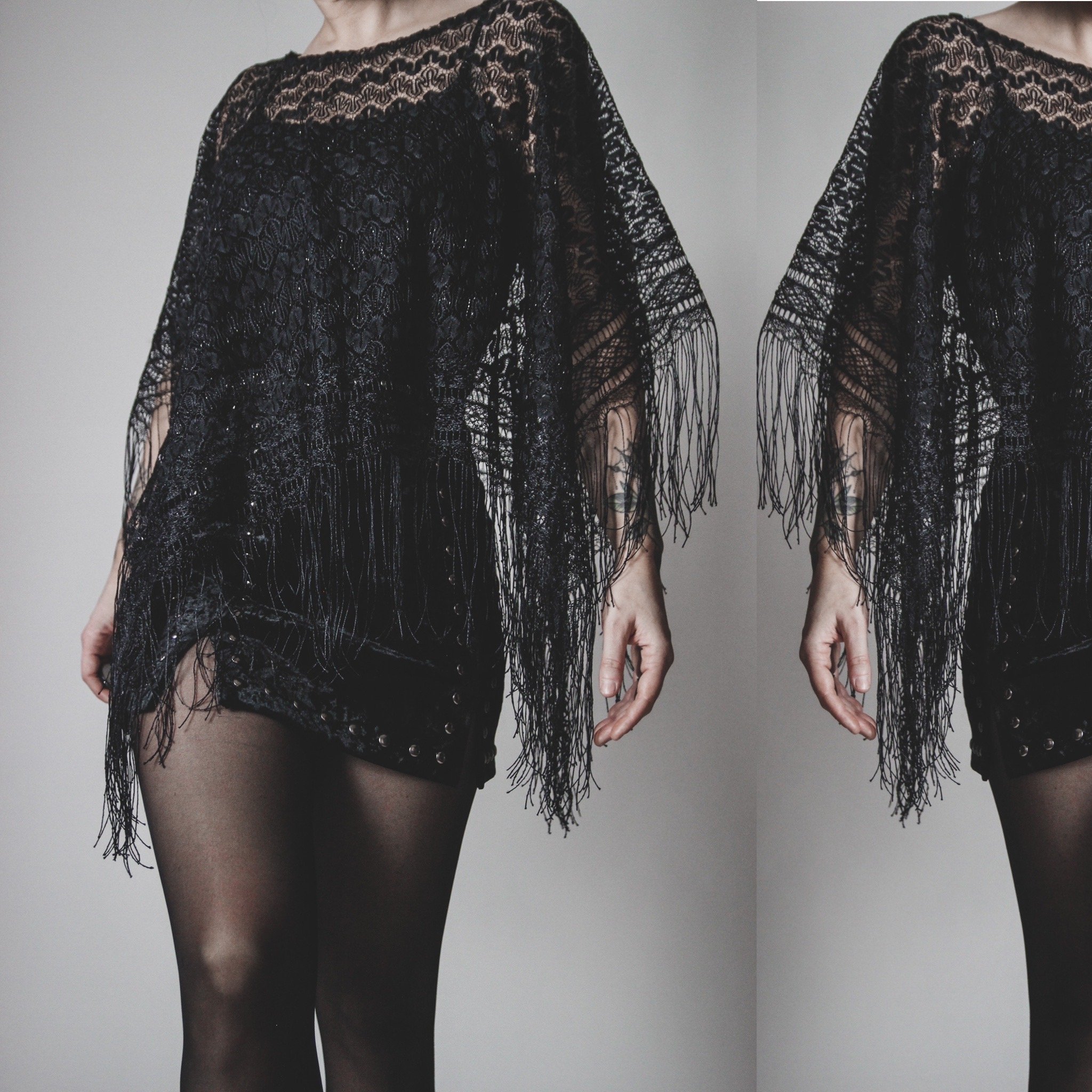 Vintage 80s black lace top with fringe. Poncho style with a neck hole and no sleeves. Sheer, delicate geometric mesh lace with fringe all around and glitter detail threading throughout. Can be worn forwards, backwards, on an angle, off-the-shoulder, even belted! Endless styling options. The perfect staple-statement piece for all your witchy looks. Fits a women's size XS to Medium. Full length on the hanger is roughly 28" shoulder to hem. No stretch, meant to drape loosely. May have a teeny snag or frayed bit here and there but no obvious imperfections that I can see. Unlined.