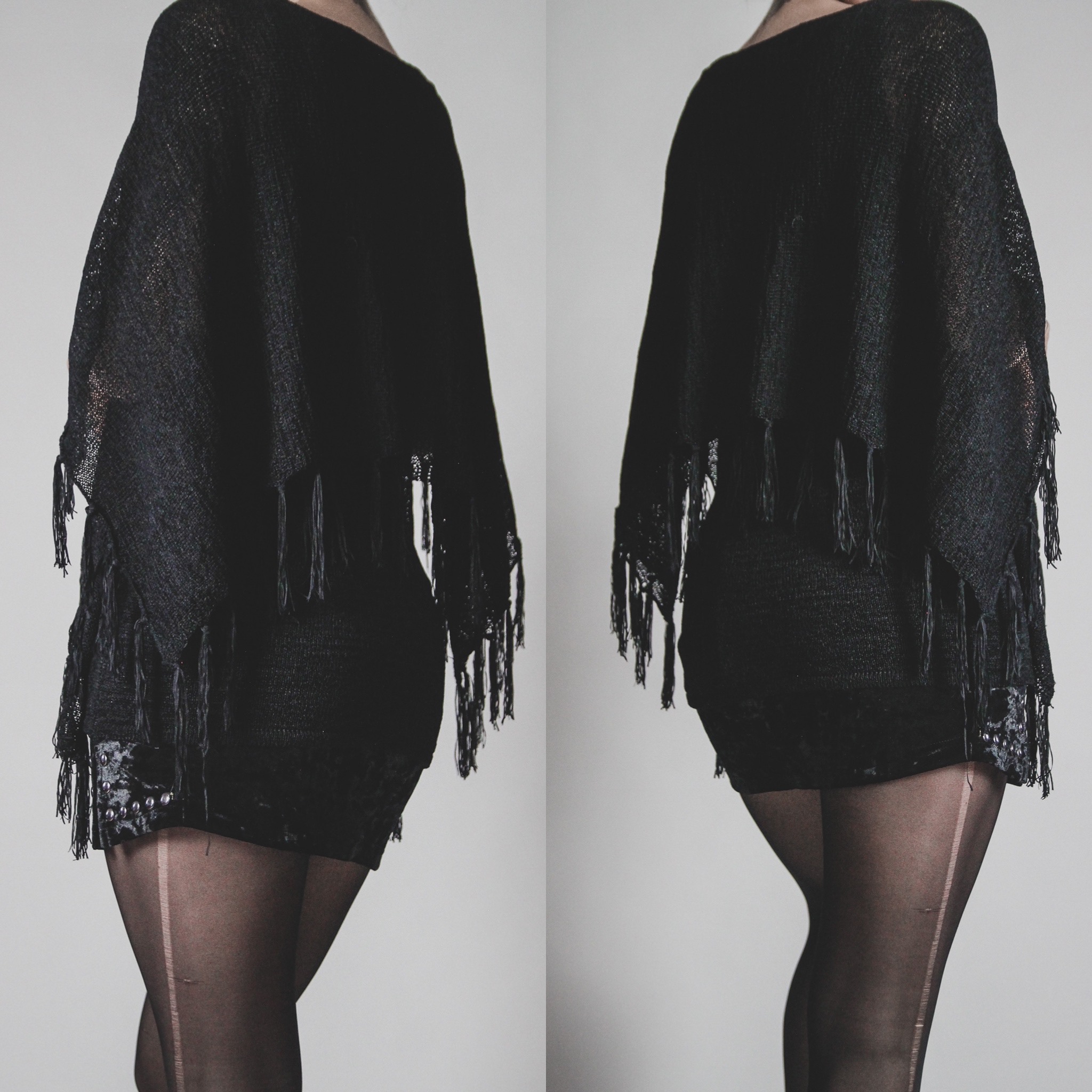 Vintage 90s knit top. Built in tank top liner with a poncho-style draped overlay and lots of fringe all around! Fabric is a slinky, stretchy poly-rayon knit with a "nubby" texture. May have a bit of itch factor if you're very sensitive to fabrics. Pull-on style.