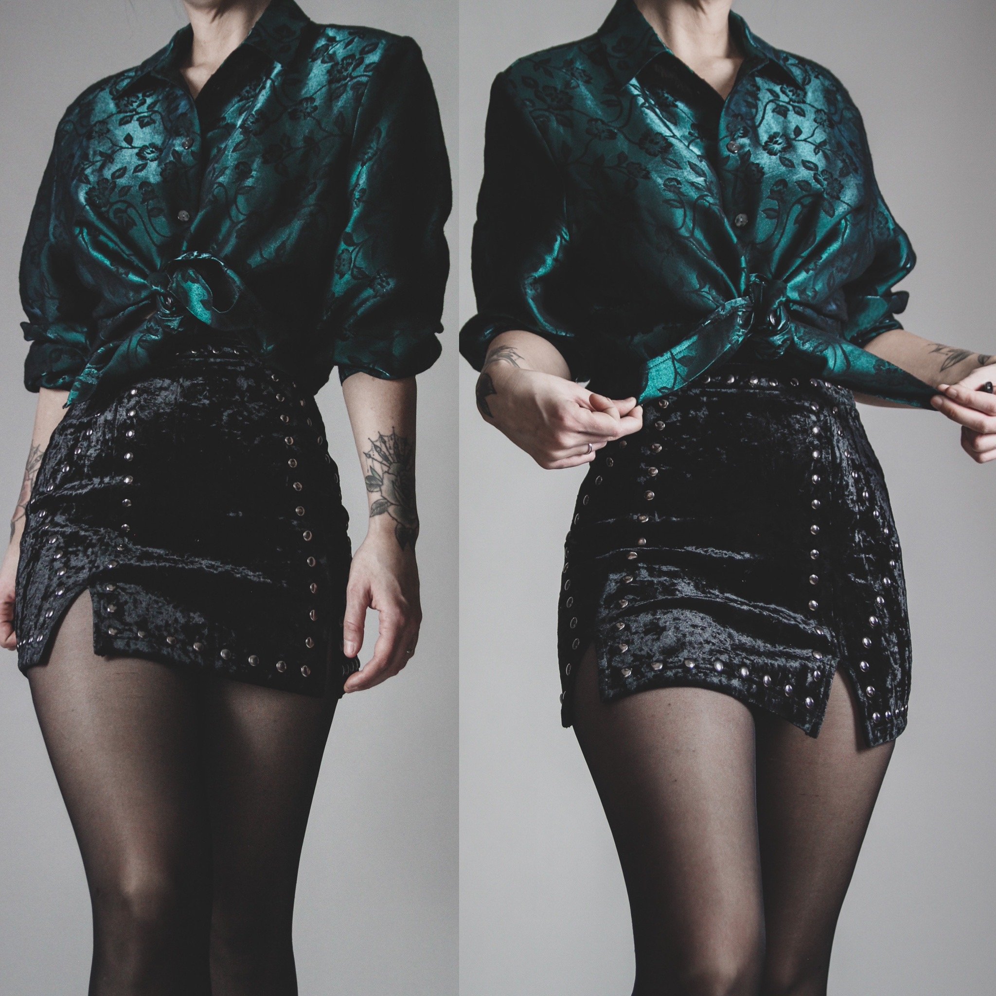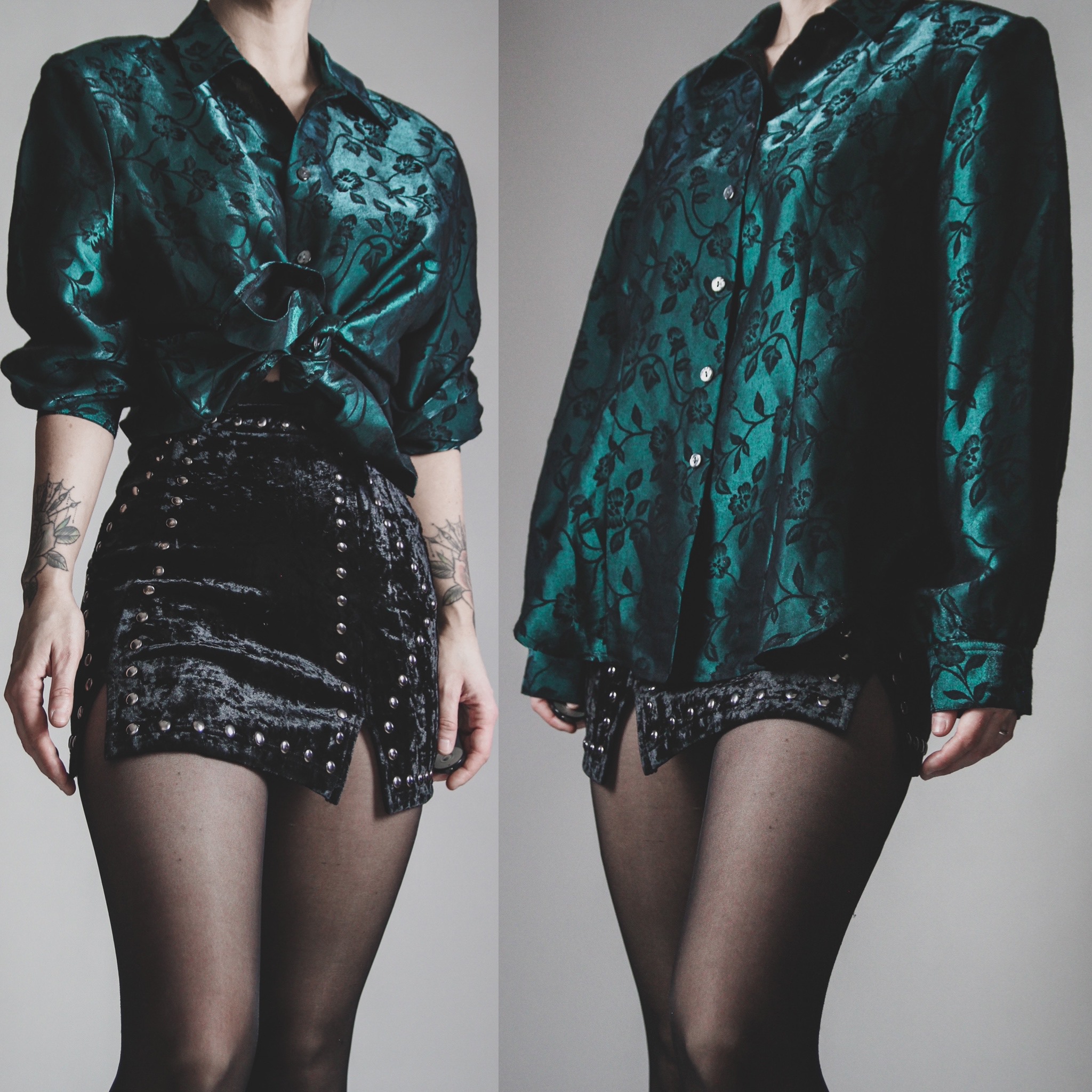Vintage 80s/90s button down blouse. Silky, soft poly-rayon blend in a gorgeous metallic emerald green, with a black floral print all over. Lightweight and versatile, great for transitional weather. Can be worn tucked in to any high waisted bottoms, knotted up at the waist, or as a throwover piece! Boxy cut, balloon sleeves and fitted cuffs. No stretch, unlined. Can be dressed up or down. Standard length, not long enough to be a shirt dress but not cropped either. Original shoulder pads intact but they can be easily removed if that's not your thing.