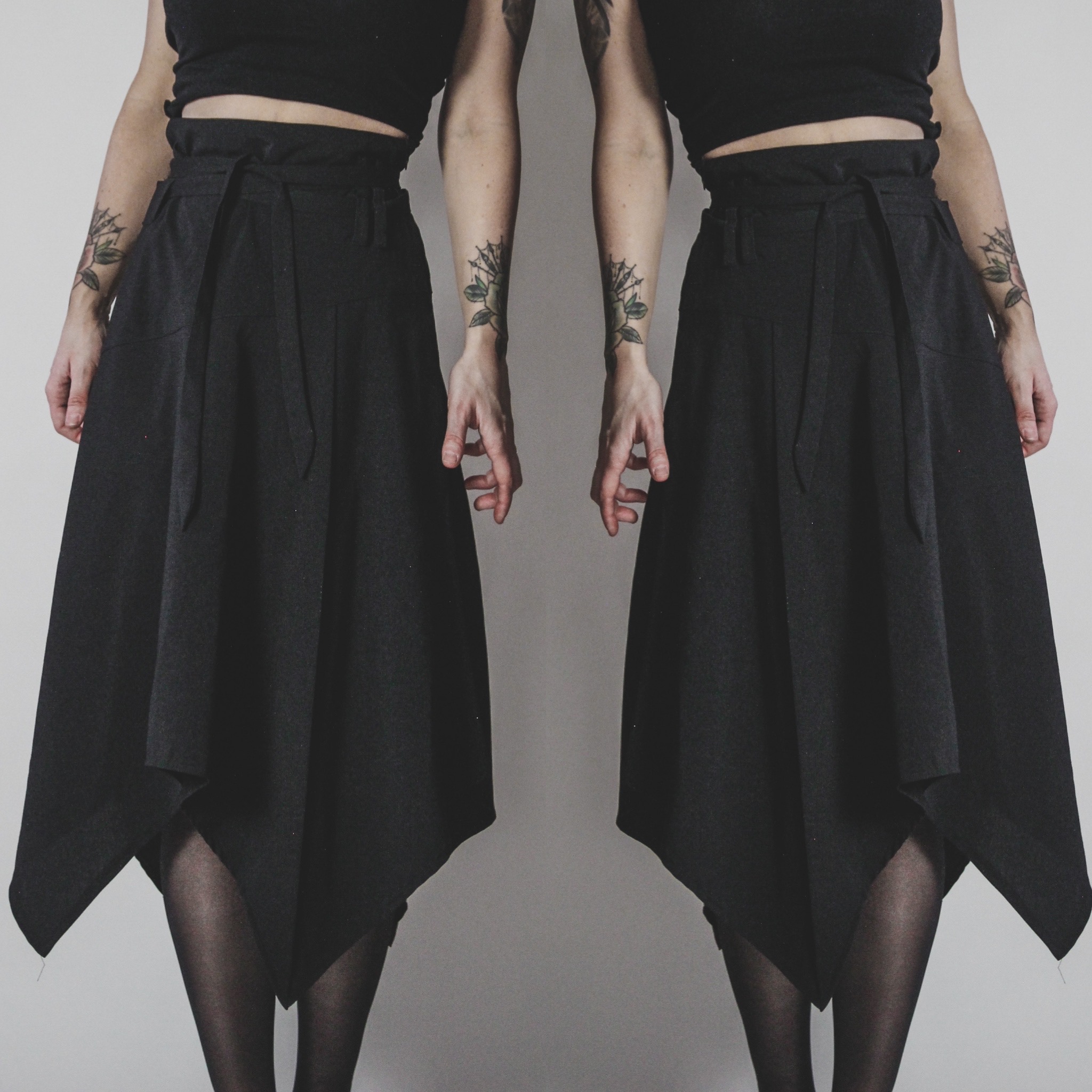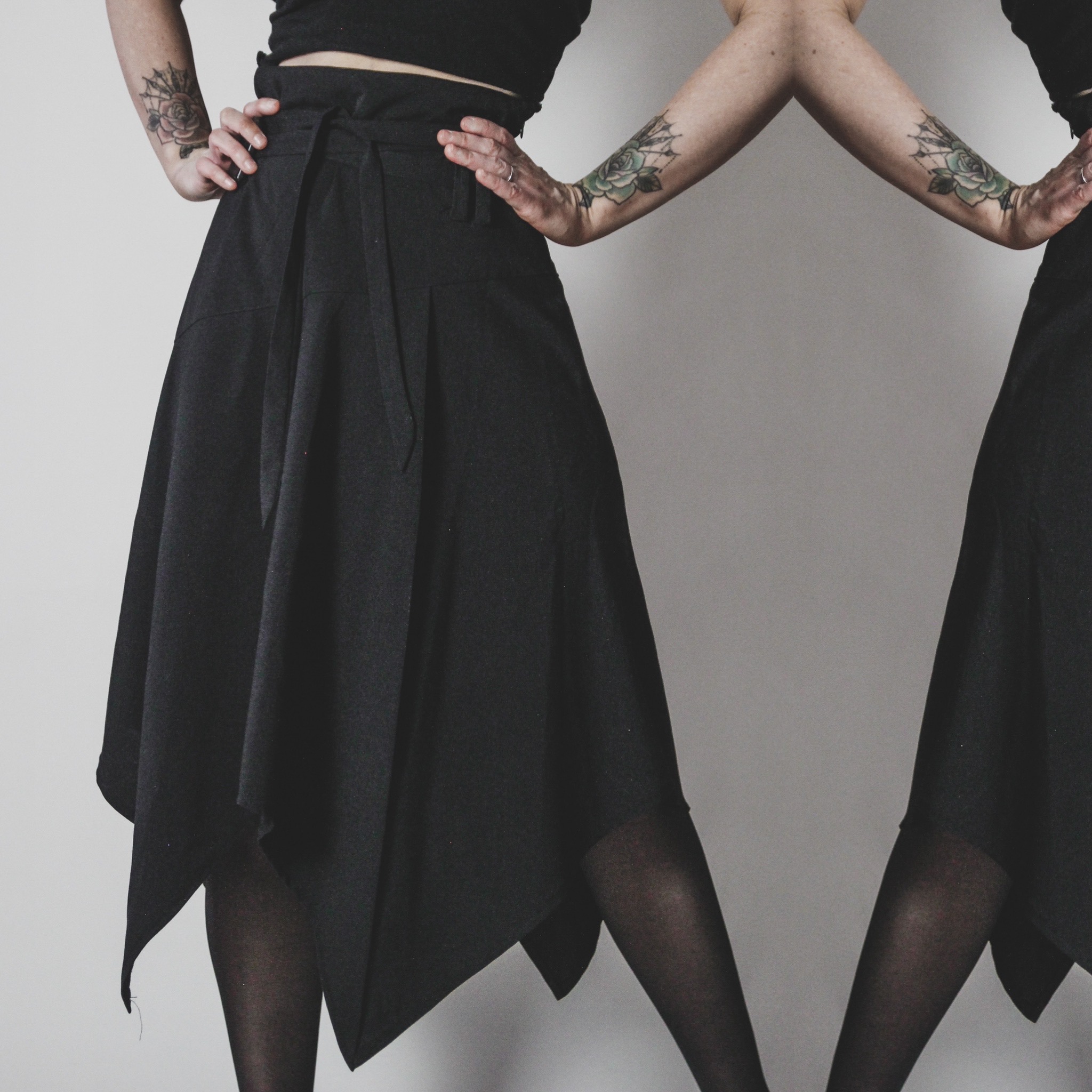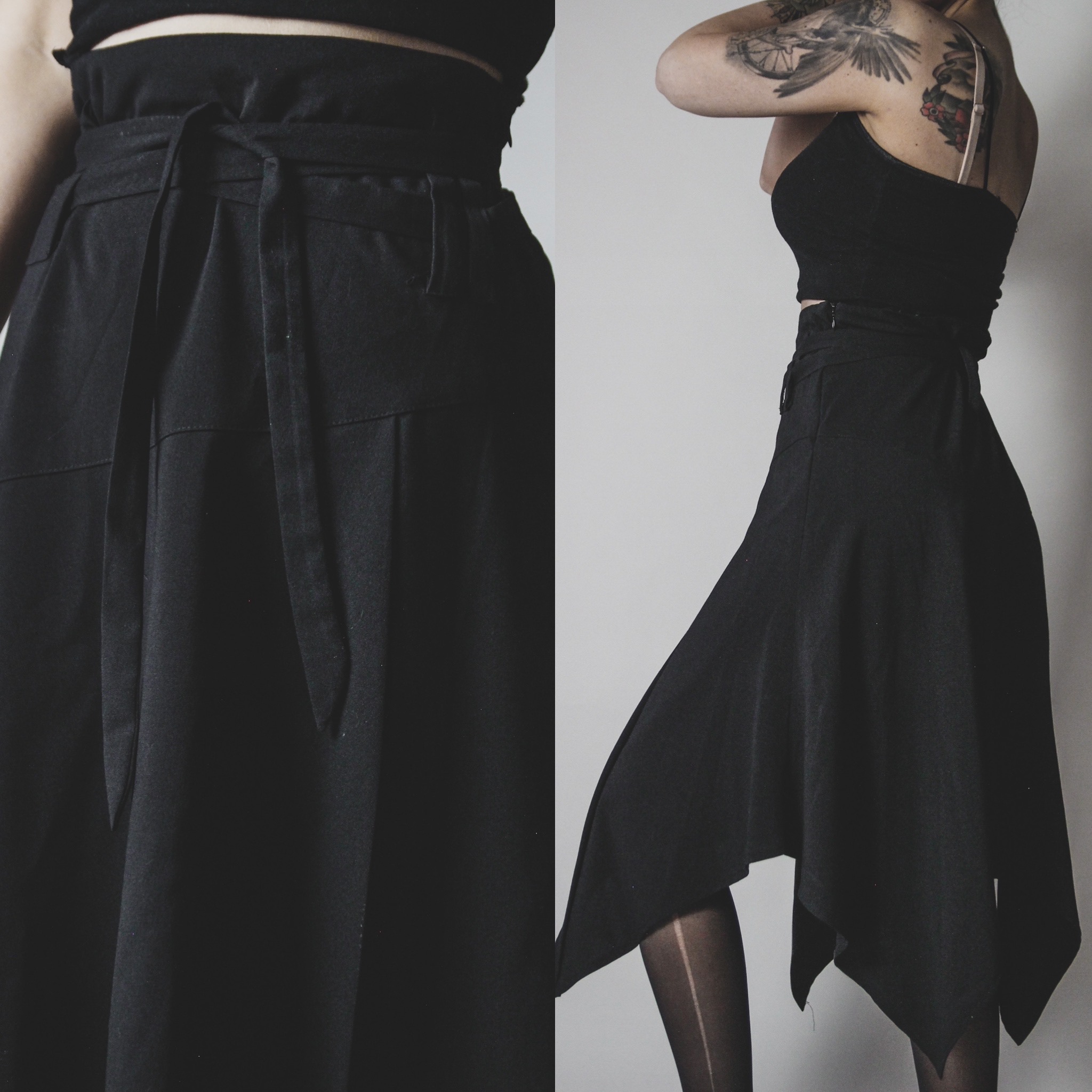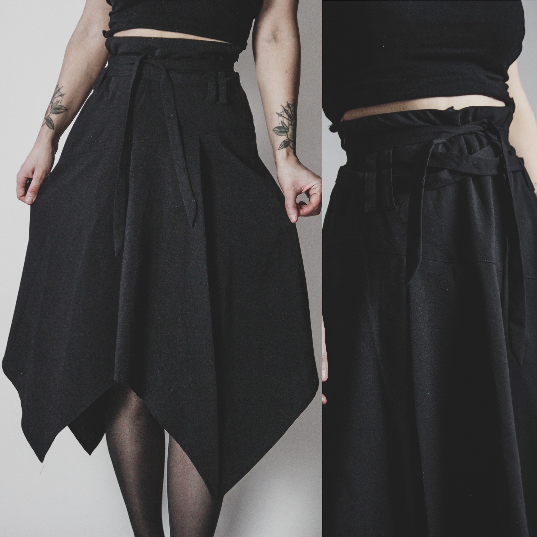 Vintage 90s handerchief-hem skirt. Side zip, no stretch, meant to be worn high waisted. Asymmetrical draped hemline. Multiple belt loops all around and a looooong removable belt tie that can be criss-crossed around for a cool paperbag waist fit, cinched as tight as you like! The perfect versatile witchy staple skirt. Unlined. Poly-rayon-spandex blend. Fabric is not really stretchy but it does have a tiny bit of "give" for comfort.