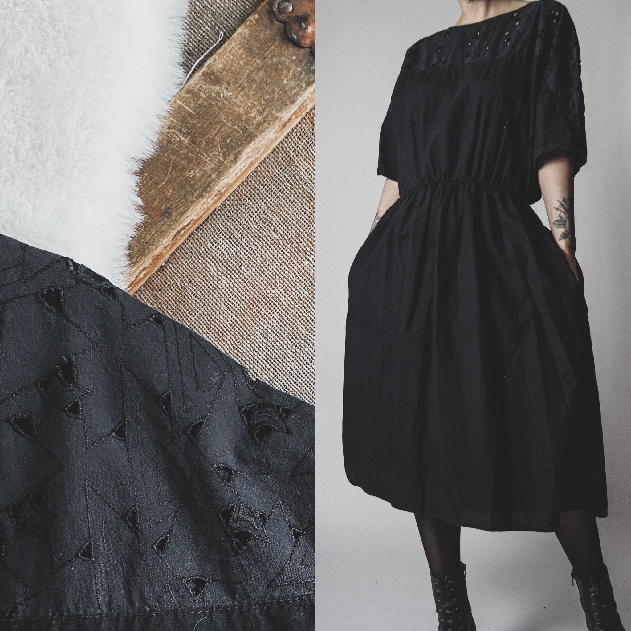 Vintage 80s day dress. Faded black with a fun geometric panel at the shoulders and tiny triangle cutouts! Batwing sleeves, stretchy elastic waist, flared skirt and ROOMY POCKETS!!! Pull-on style. Tag has been cut out but feels like cotton or a cotton-poly blend. Unlined, no stretch other than the waist.. Perfectly broken-in, this is a true well-loved vintage relic! Very comfortable and versatile, perfect for warm weather but can be layered up for all seasons. Belt not included.