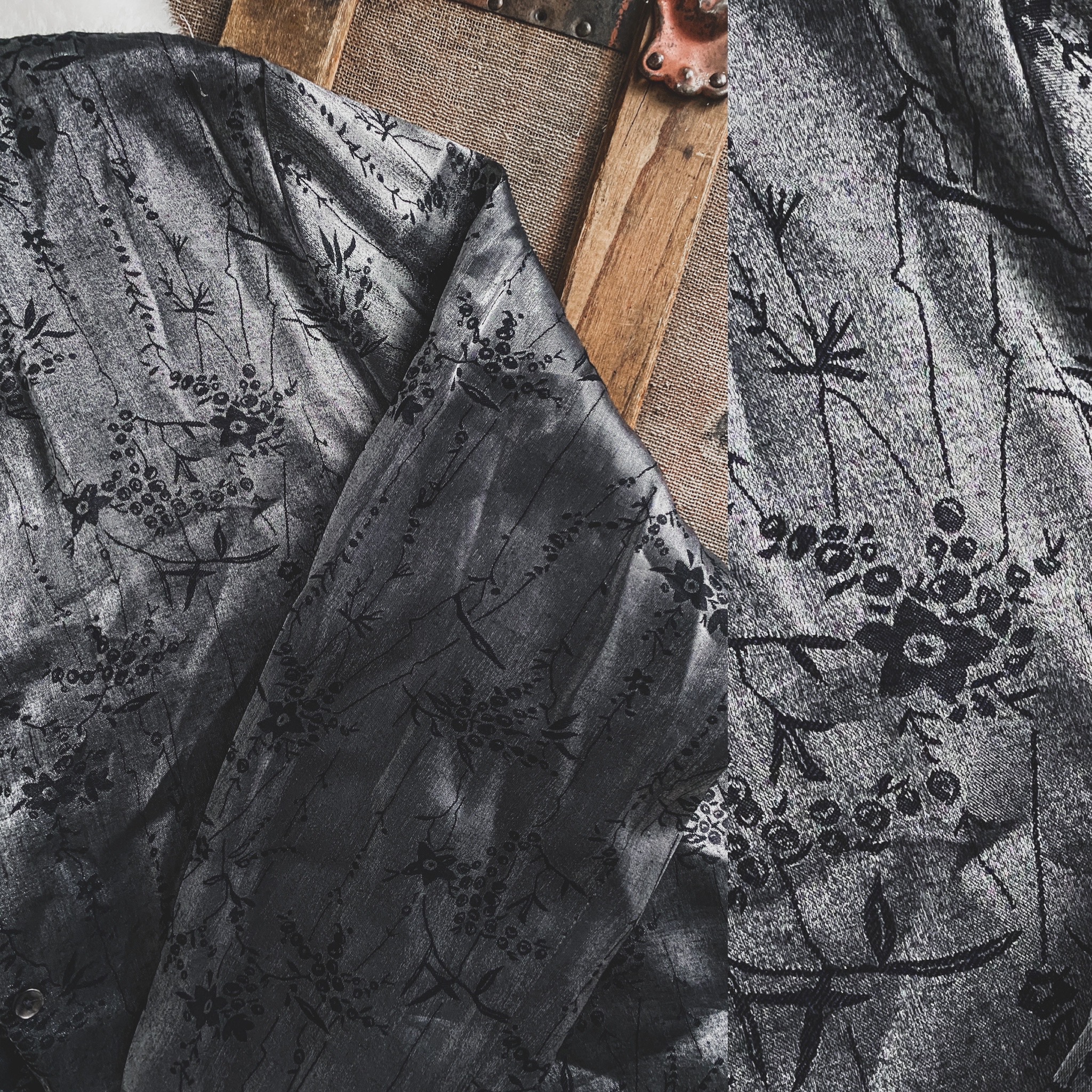 Vintage 80s/90s button down blouse. Silky, soft poly-rayon blend in a gorgeous metallic silver, with a black floral print all over. Lightweight and versatile, great for transitional weather. Can be worn tucked in to any high waisted bottoms, knotted up at the waist, or as a throwover piece! Boxy cut, loose sleeves and fitted cuffs. No stretch, unlined. Can be dressed up or down. Standard length, not long enough to be a shirt dress but not cropped either.