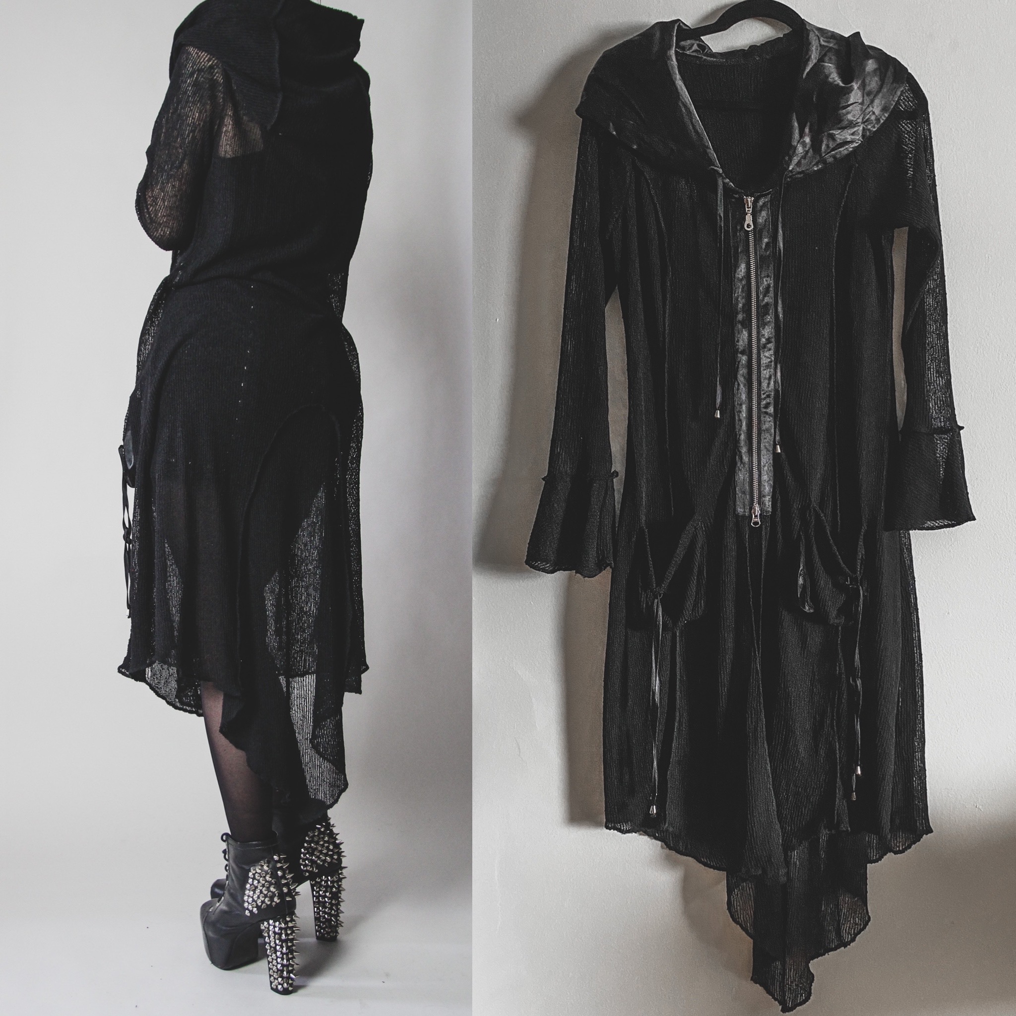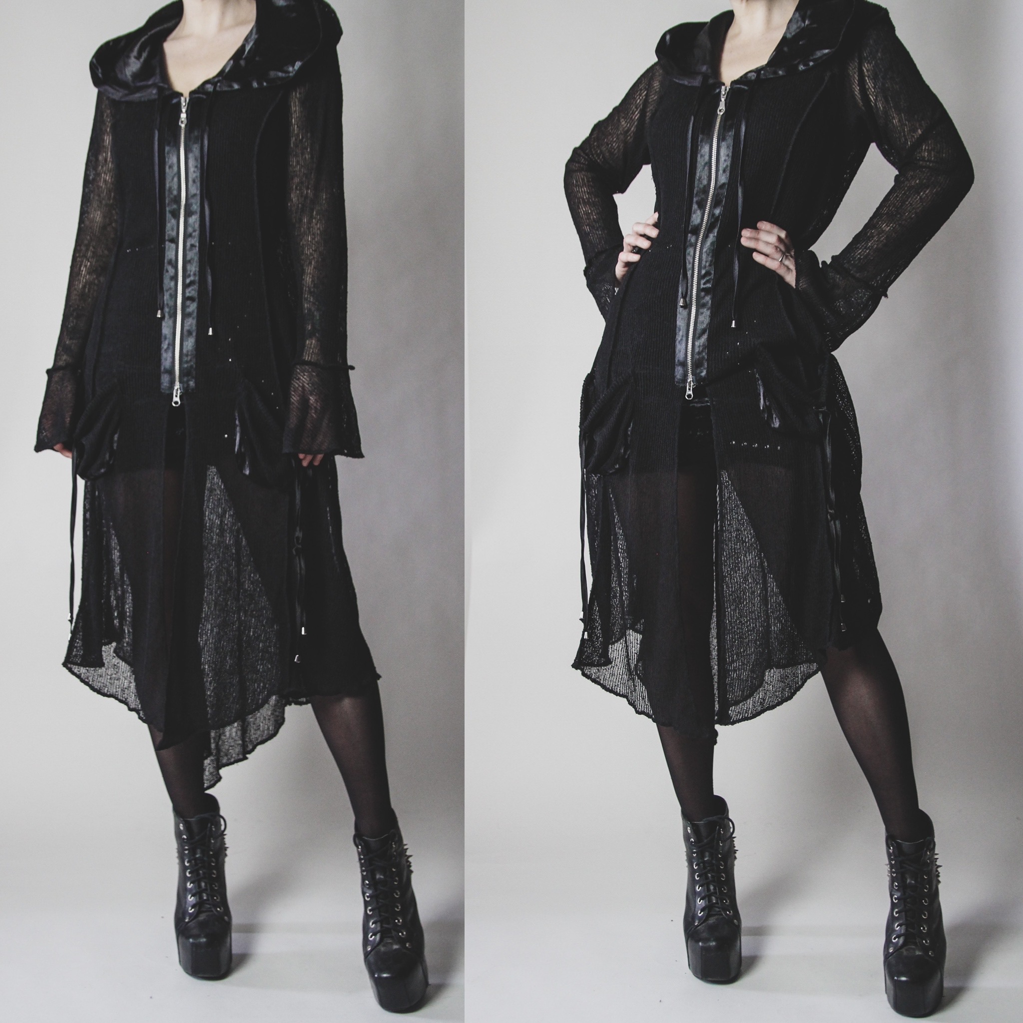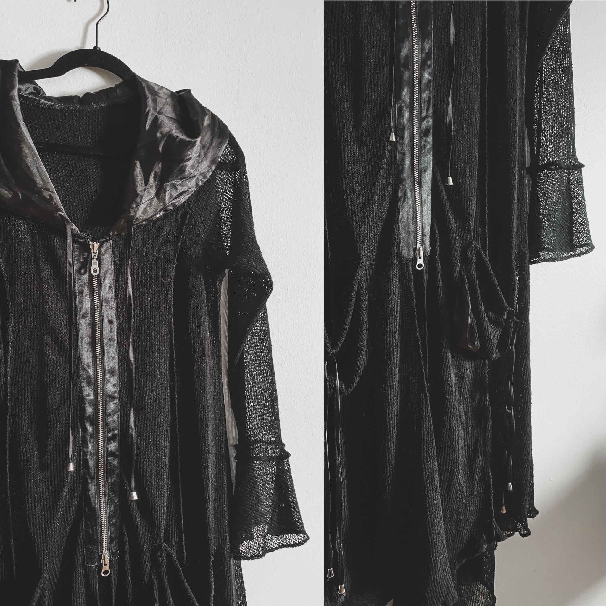 Vintage 90s mixed-media duster cardigan. This is the COOLEST find for true 90s goth vibes, she has so many fun details! Main fabric is a sheer, ribbed, mesh knit that I call "spiderweb knit" - has a bit of stretch. Satin panel down the front with an exposed silver zipper. Slouchy pouch-style front pockets with adjustable satin drawstrings! Bell sleeves. Asymmetrical high-low hem. Oversized hood, knit on the outside and lined with satin.