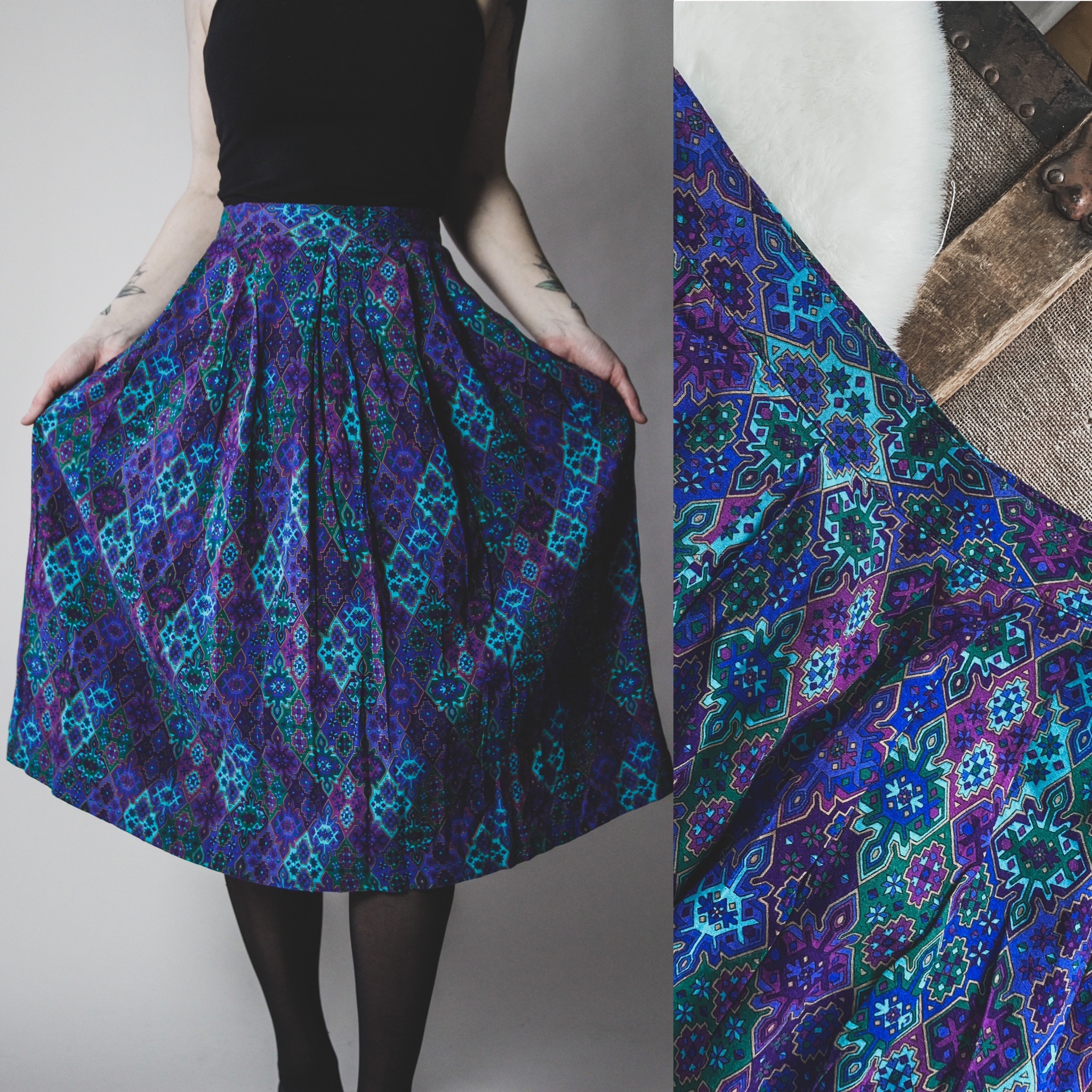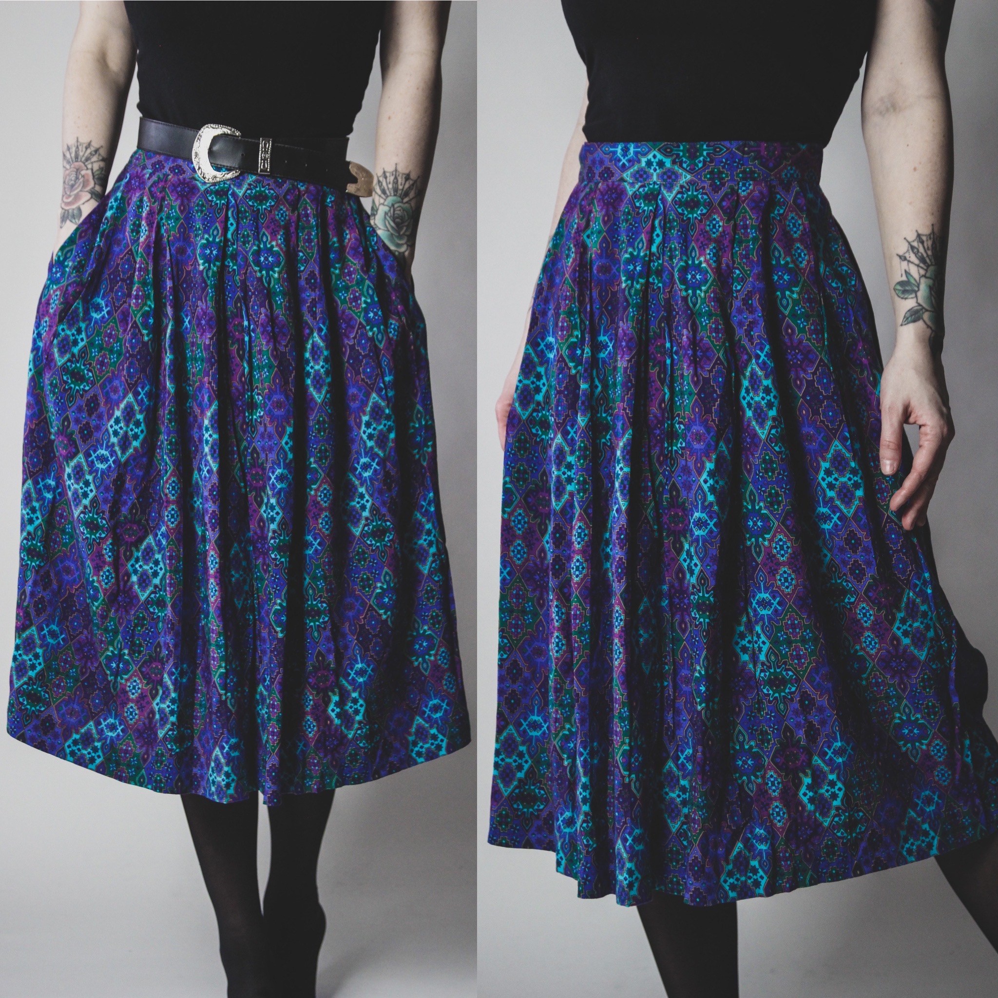 Vintage 80s midi skirt. A perfect witchy staple skirt with a fun colorful twist, and POCKETS! Shades of teal, blue, purple, green and gold. Back zip with double button closure at the waist. Meant to be worn high waisted. Pleated A-line cut. No stretch whatsoever. Soft, silky 100% rayon fabric, super comfortable. Unlined.