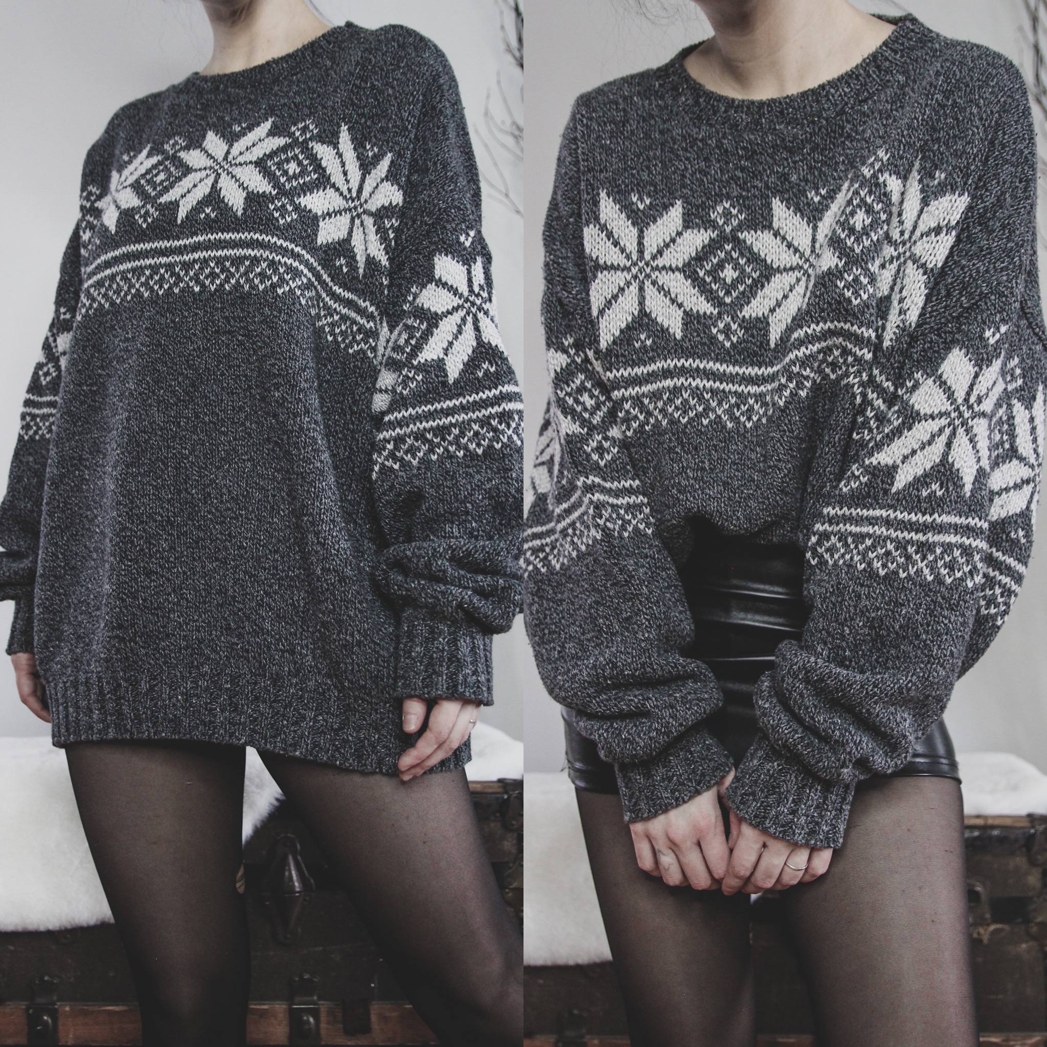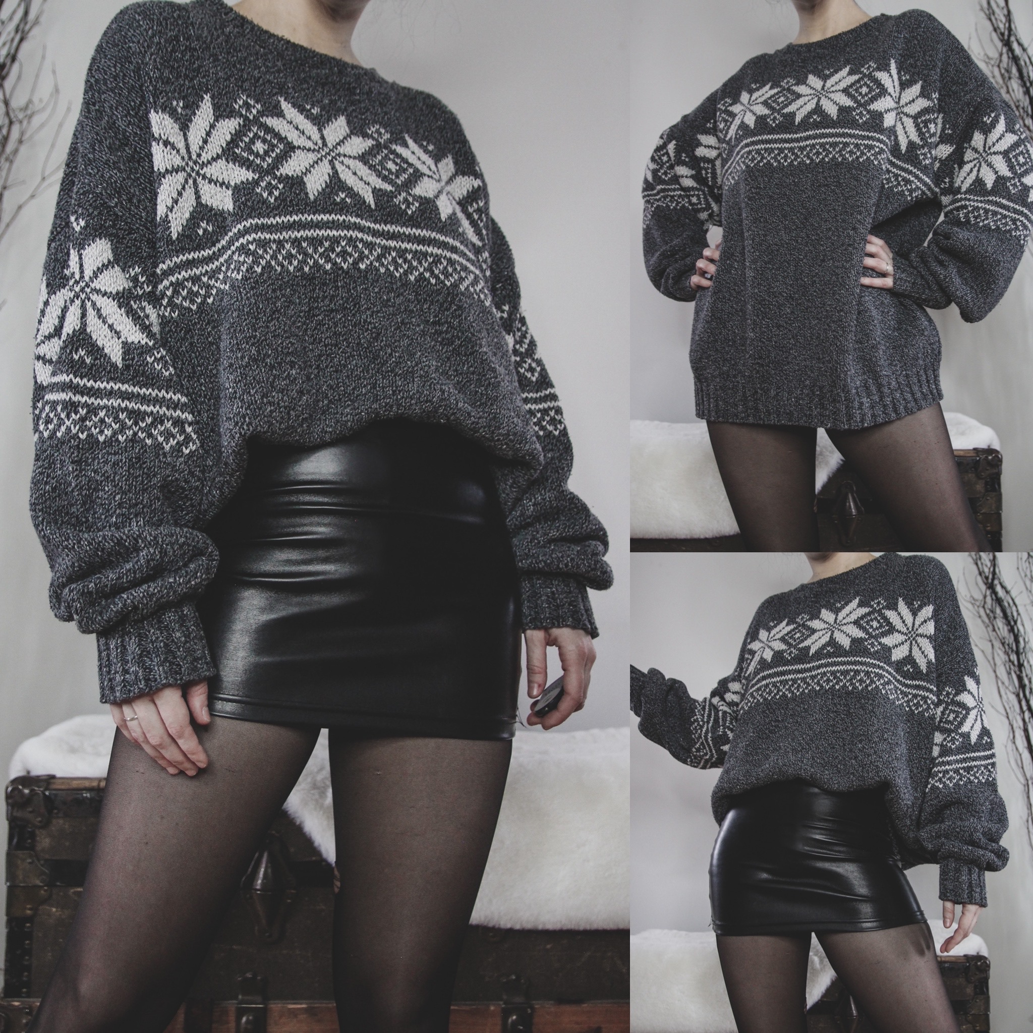 Vintage signature sweater. All Last Rites sweaters are one-of-a-kind unisex finds, straight out of the 70s, 80s and 90s! This one is a heavy, chunky knit in marled gray with a white fair isle snowflake design. 80/20 cotton-acrylic blend. Perfectly broken in, slouchy and cozy. Minimal itch factor unless you're extra-sensitive to knit fabrics, but easy to layer up with a turtleneck or thermal underneath! Crew neck, loose balloon sleeves, and a boxy roomy cut. Has a couple of former holes that have been stitched up.