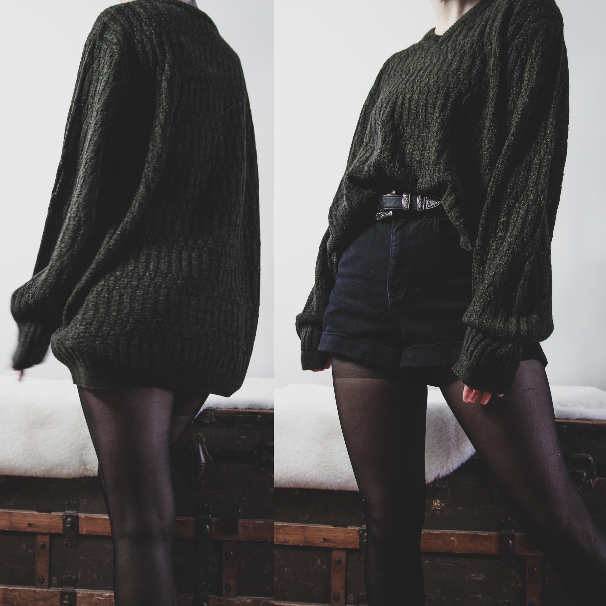 Vintage signature sweater. All Last Rites sweaters are one-of-a-kind unisex finds, straight out of the 70s, 80s and 90s! This one is a midweight chunky cable knit in shades of marled olive and black. Fabric tag has completely faded, but the fabric feels like an acrylic blend. Perfectly broken in, slouchy and cozy. May have a tiny bit of itch factor if you're very sensitive to knits, but the roomy fit makes it easy to layer up with a turtleneck or thermal underneath! V-neck, balloon sleeves, and a boxy cut.