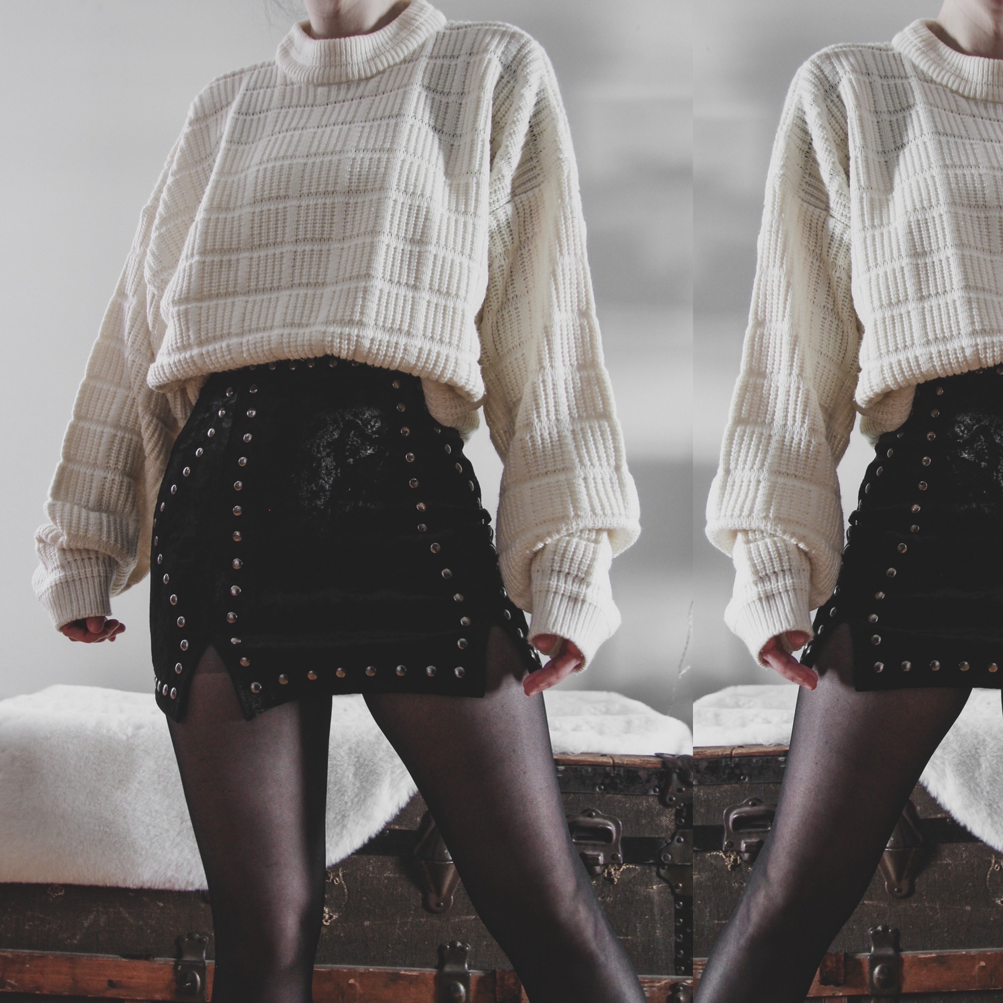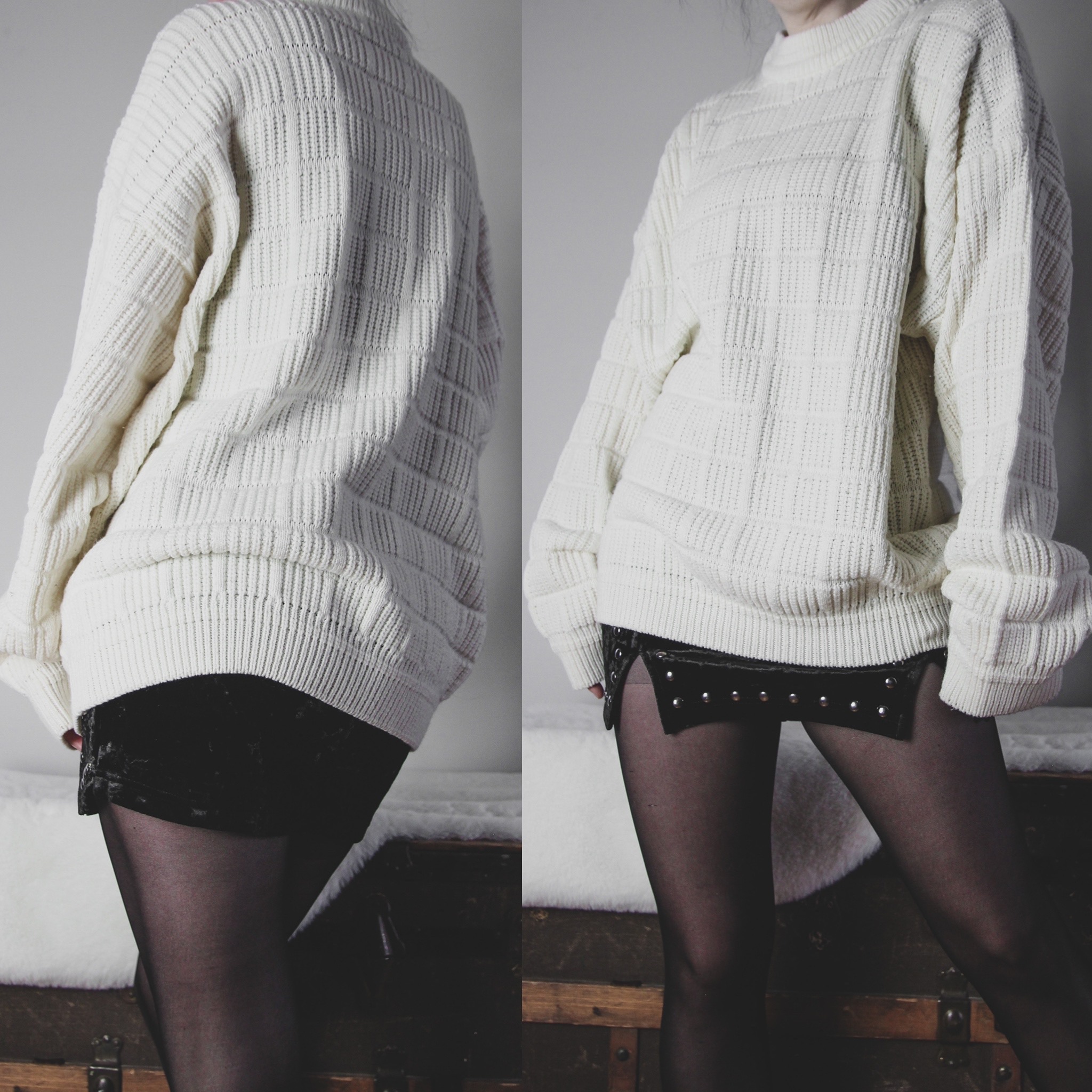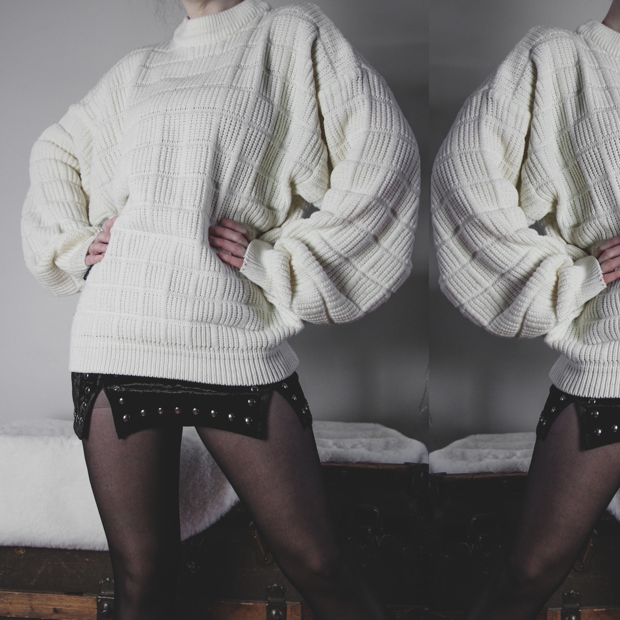 Vintage signature sweater. All Last Rites sweaters are one-of-a-kind unisex finds, straight out of the 70s, 80s and 90s! This one is a heavy, chunky cable knit in a soft cream shade. Definitely off-white / ivory, not true snow white. 100% acrylic. Perfectly broken in, slouchy and cozy. The fabric on this one is more structured and less soft and fuzzy, so it will *definitely* have some itch factor if you're sensitive to knits. Layer up with a turtleneck or thermal underneath and you'll be fine! Mock neck, massive balloon sleeves, and a roomy cut with a fitted hem for that slouchy bubble shape.