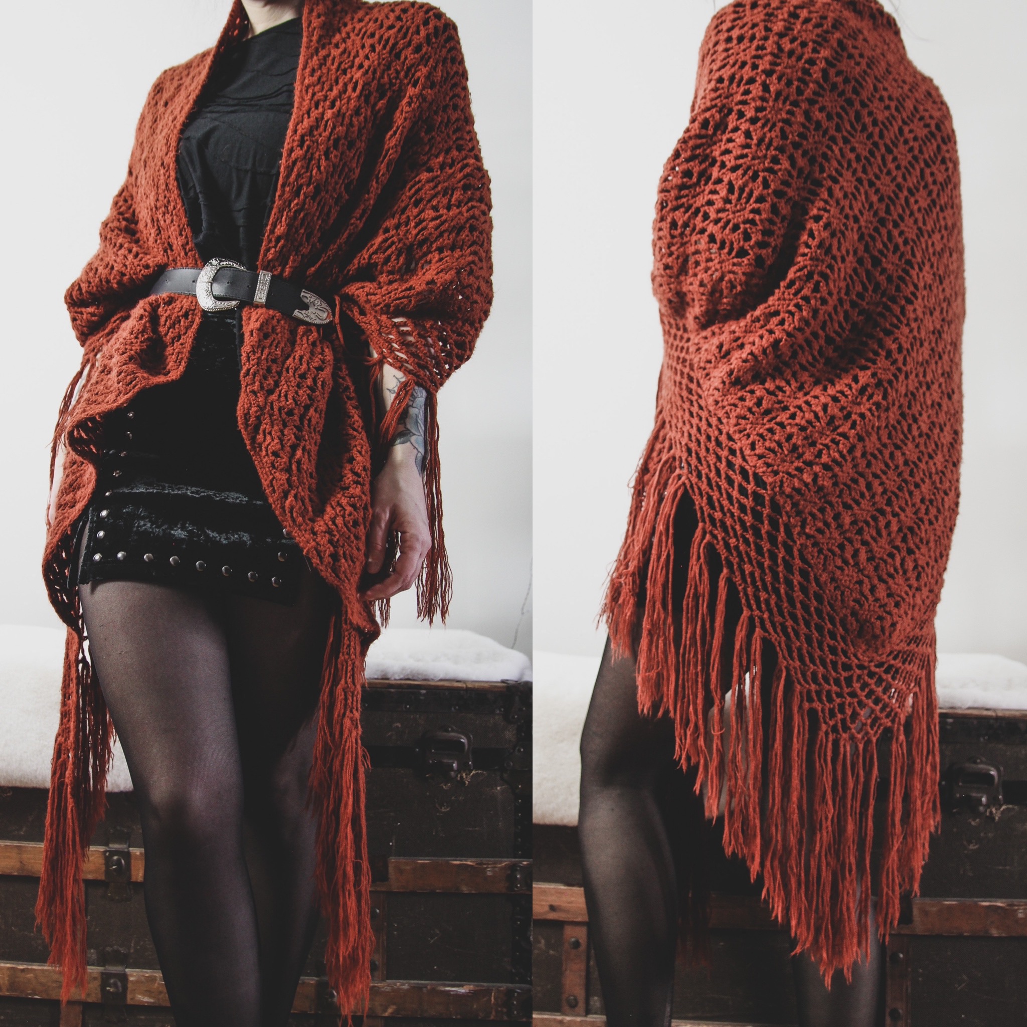 Vintage pumpkin orange knit shawl. This is one for the books! A perfect fall color, so chunky and cozy. No evidence of tags, likely handmade in the 70s based on the retro floral pattern. Massive oversize style - triangular, measures roughly 104" by 52" (!!!!) including fringe. Feels like an acrylic or possibly wool blend. These are SO hard to find and so fun to style! One size fits most, belt not included.