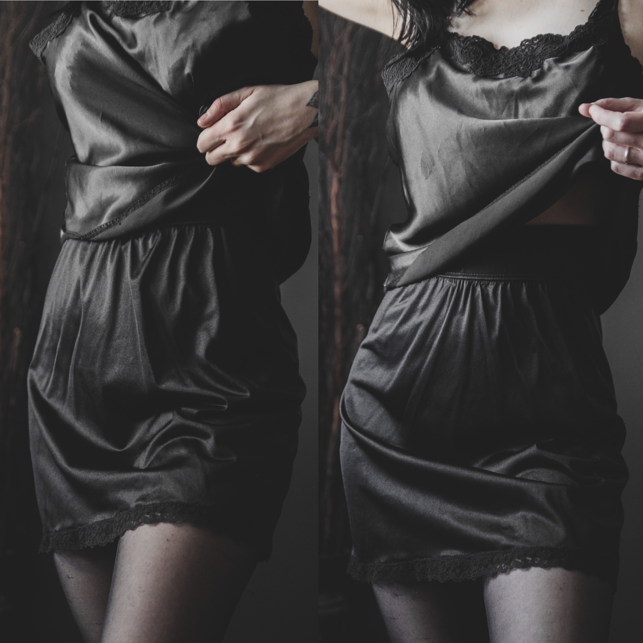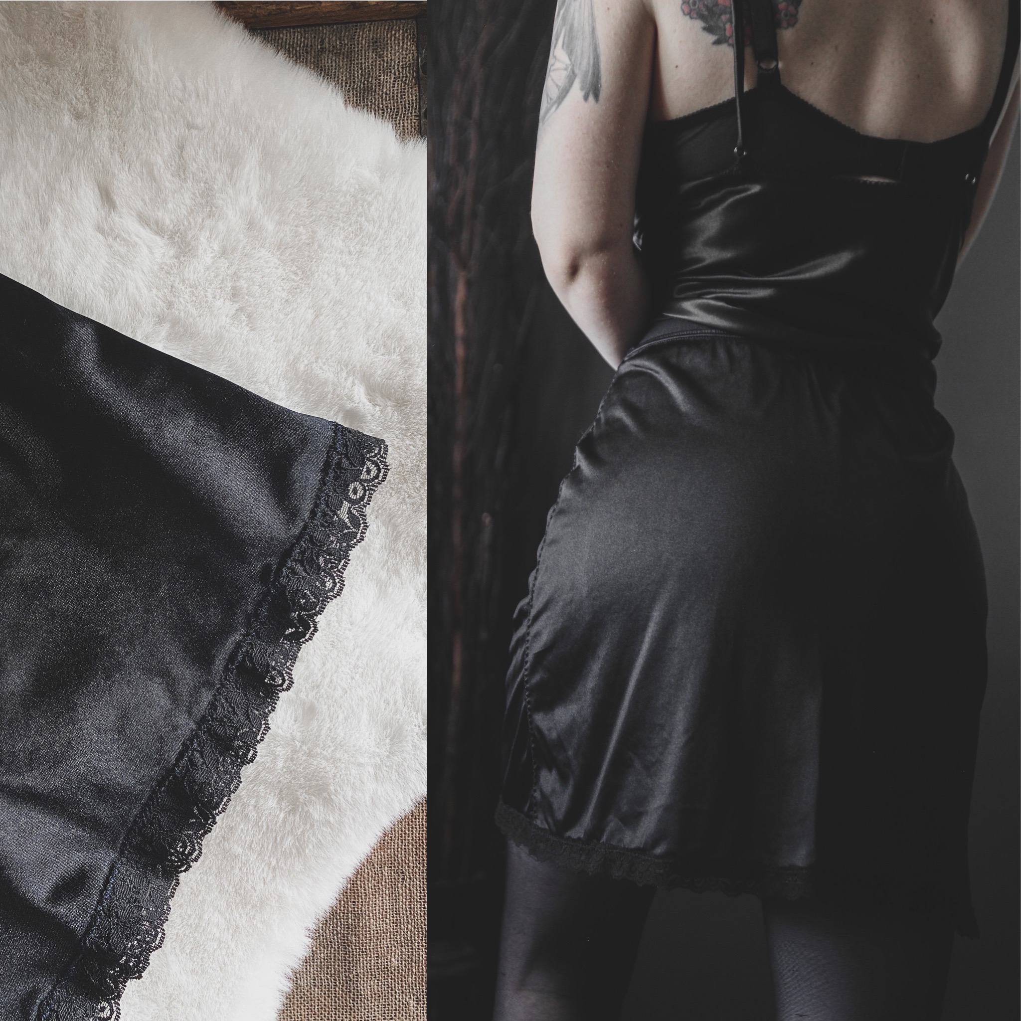 Vintage 70s/80s nylon satin slip skirt. Perfect for wearing under your favorite dresses and skirts, or style it alone! No stretch but has an elastic waistband. High waist cut, not quite bodycon - more of a slight flared skater fit. 16" long.