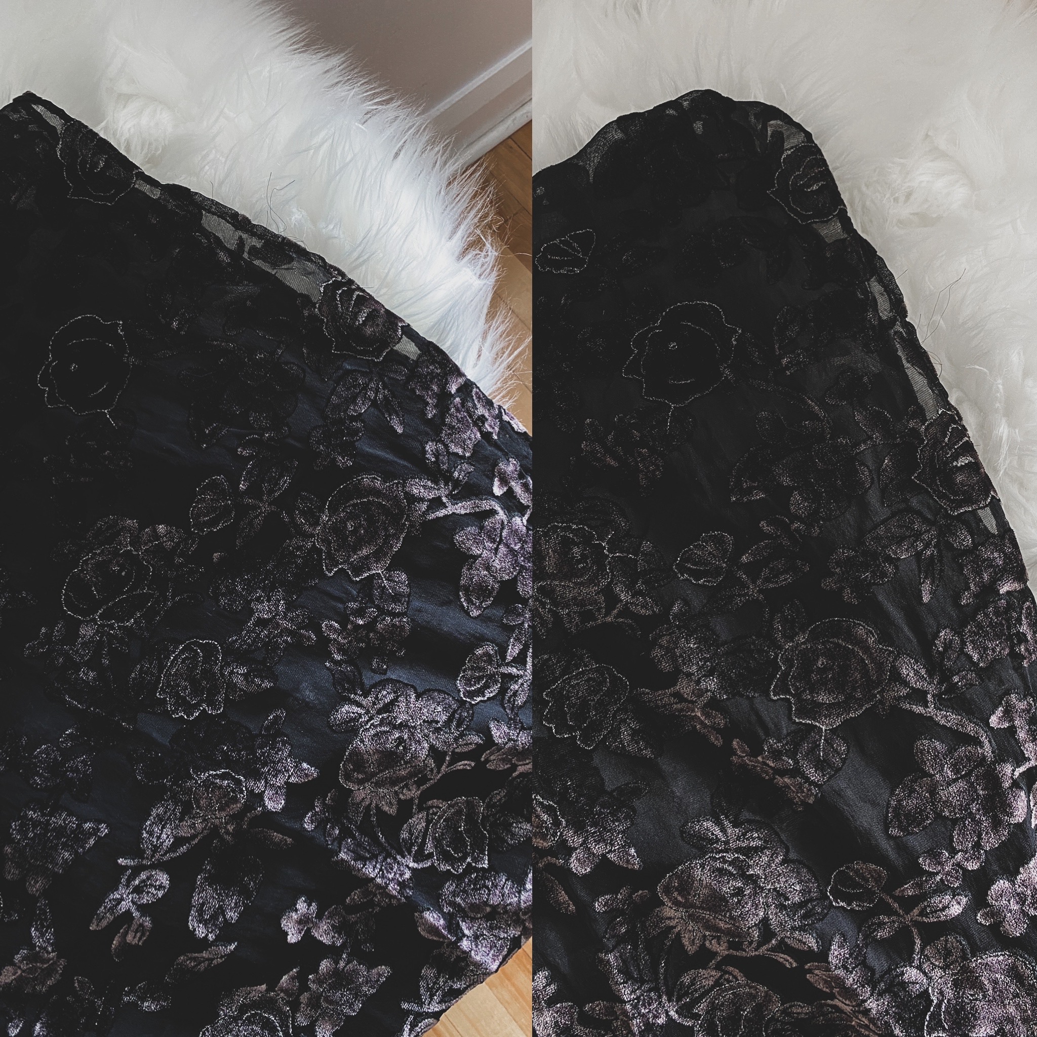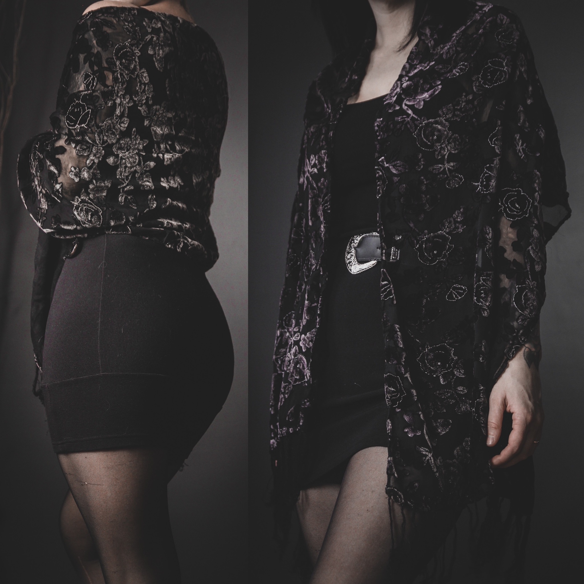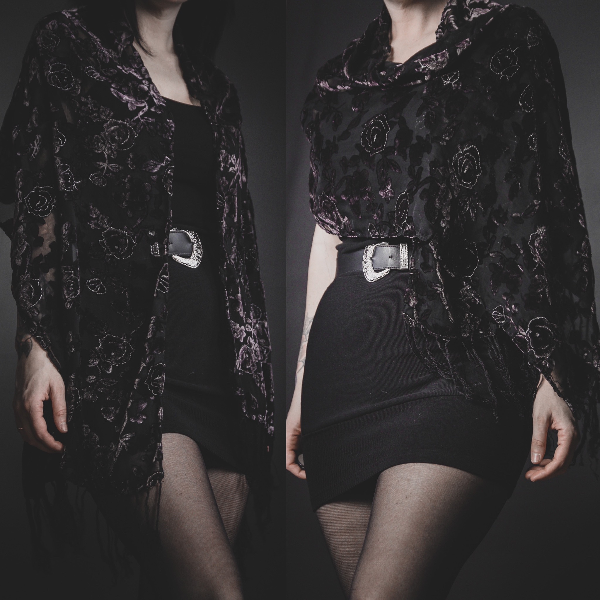 Vintage 80s signature velvet shawl. All Last Rites signature shawls are one of a kind silk blends with unique colors and patterns. This one has sheer black backing with a gorgeous burnout floral print in a muted silvery-purple velvet. May look more purple in photos but it is definitely closer to a "warm" silver. Subtle glitter detailing all over and fringe at both ends.