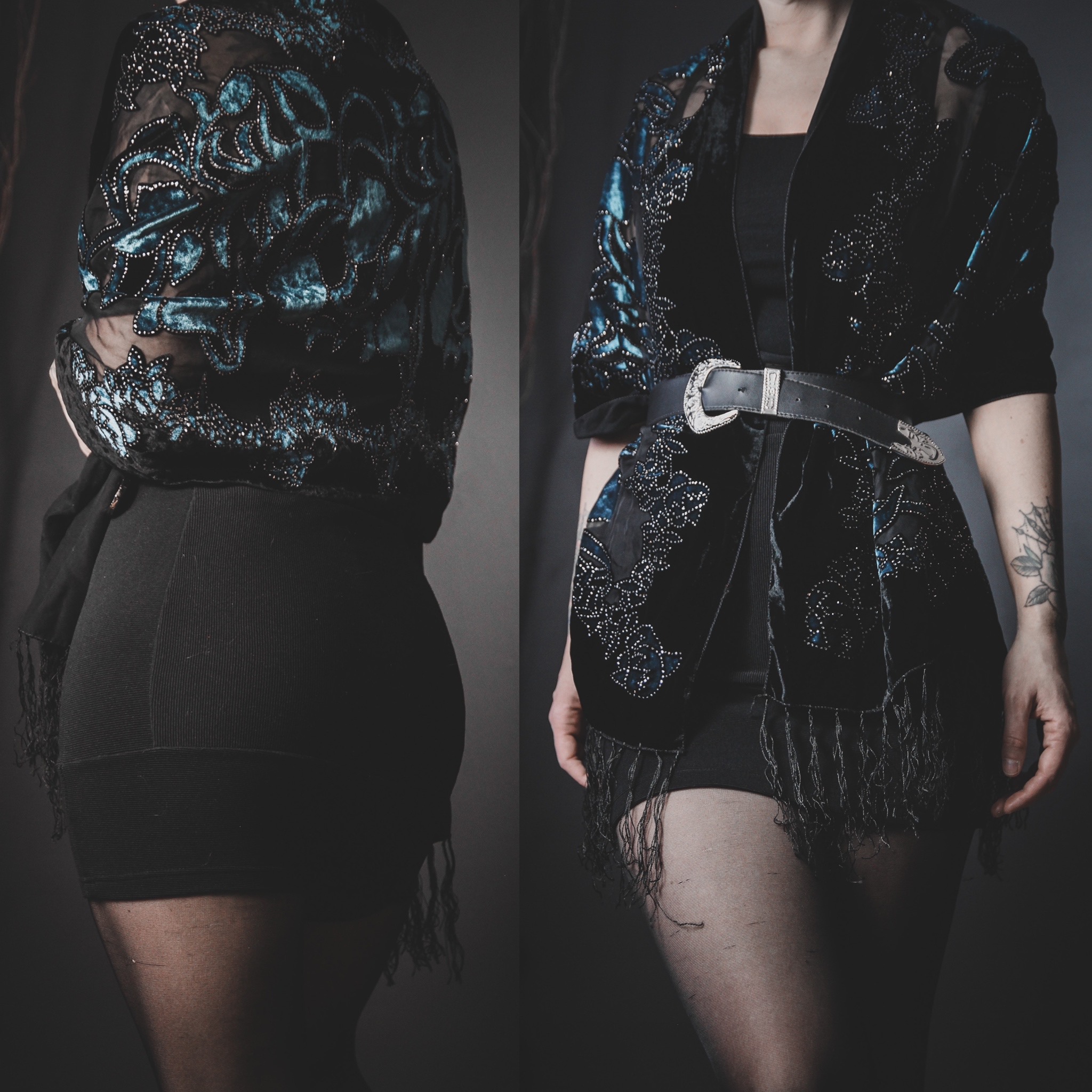 Vintage 80s signature velvet shawl. All Last Rites signature shawls are one of a kind silk blends with unique colors and patterns. This one has sheer black backing with a gorgeous burnout floral print in a bright turquoise blue velvet. INSANELY SPARKLY silver glitter detailing all over and fringe on both ends. The level of sparkle on this one is like nothing I've ever seen, and the blue color is to die for.