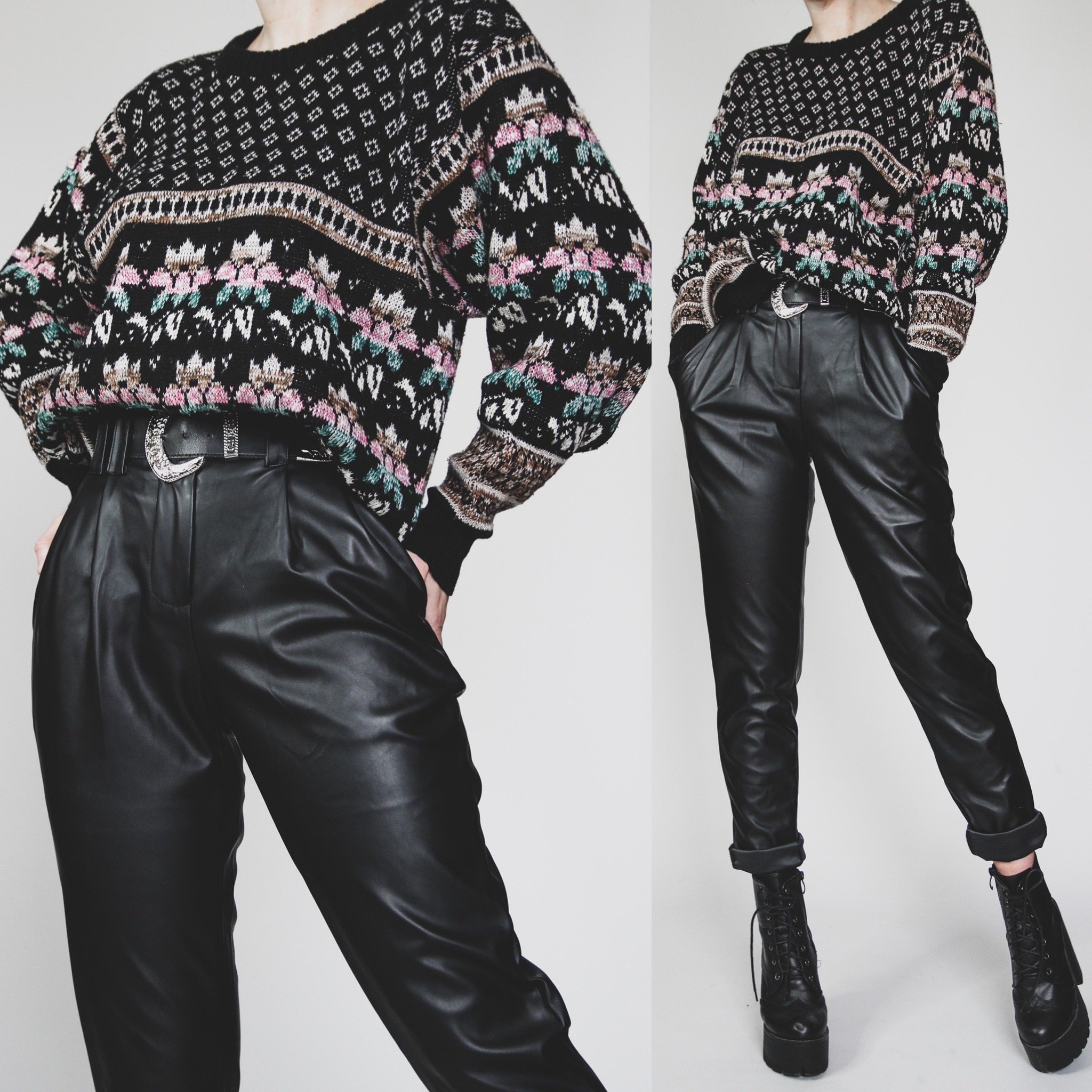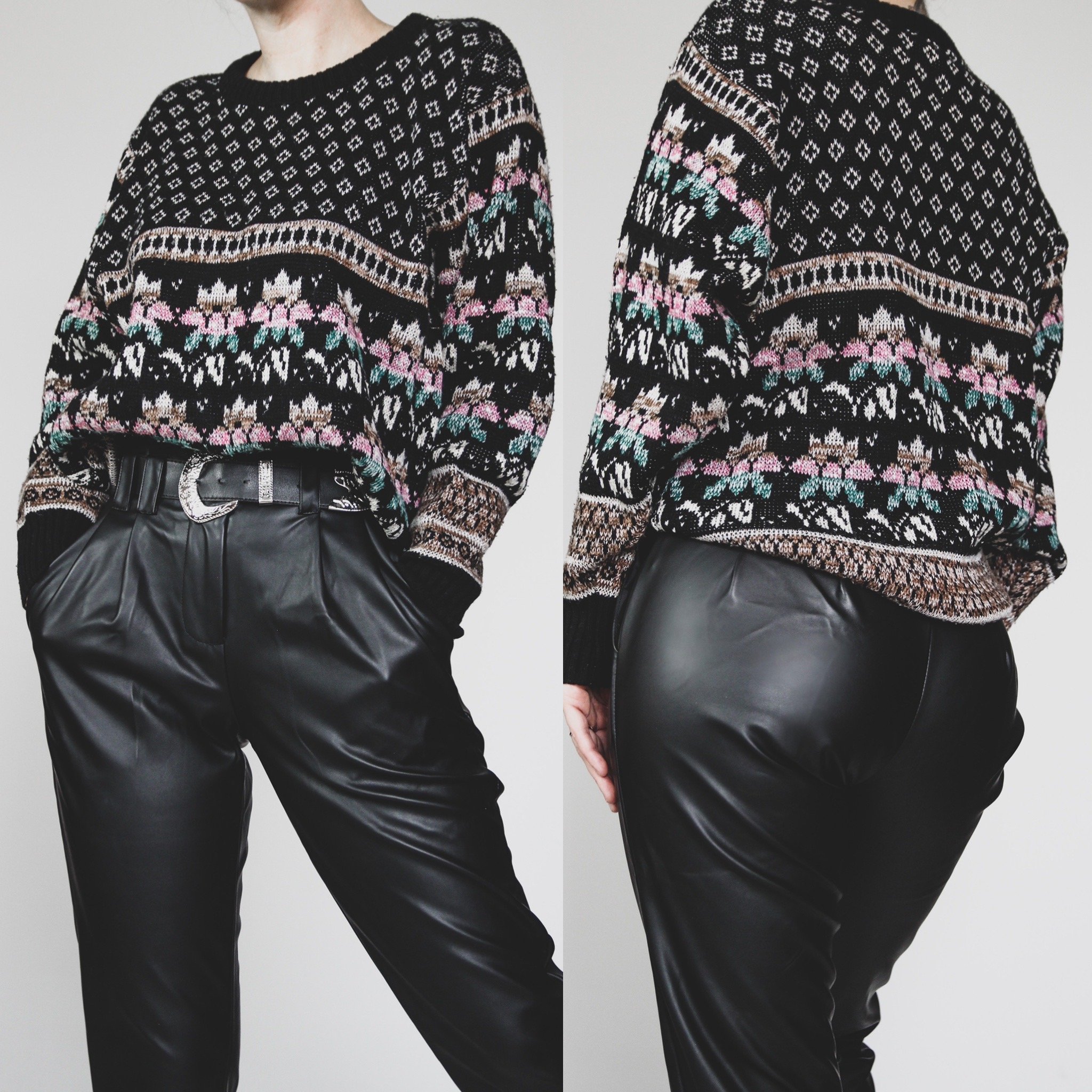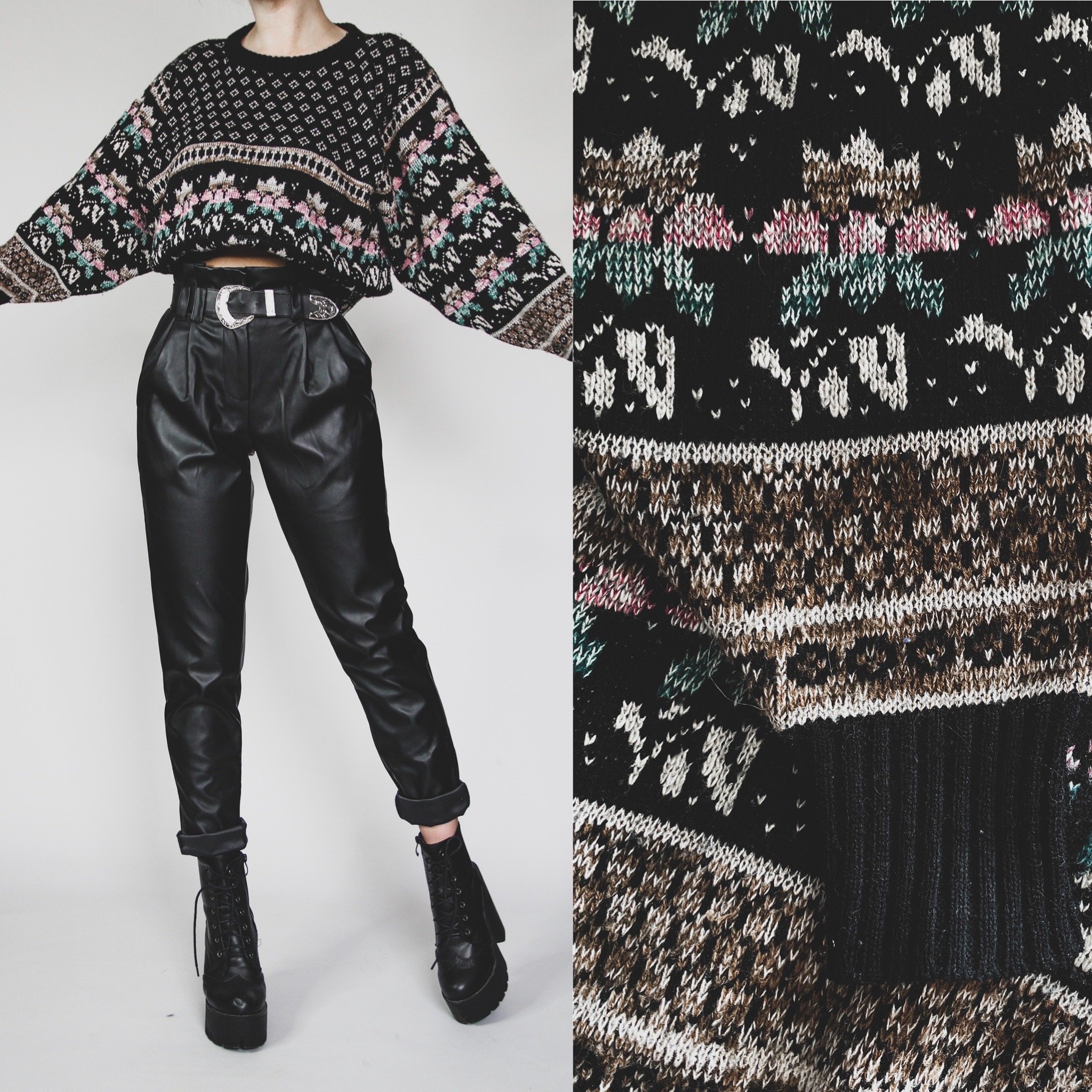 Vintage signature sweater. All Last Rites sweaters are one-of-a-kind unisex finds, straight out of the 70s, 80s and 90s! This one is a chunky knit with a beautiful floral print and gold metallic detailing all over. 100% acrylic. Perfectly broken in, slouchy and cozy, easy to tuck in or wear long. This one will definitely have some itch factor if you're sensitive to knits, but the roomy fit makes it easy to layer up with a turtleneck or thermal underneath! Crew neck, balloon sleeves, and a boxy cut.
