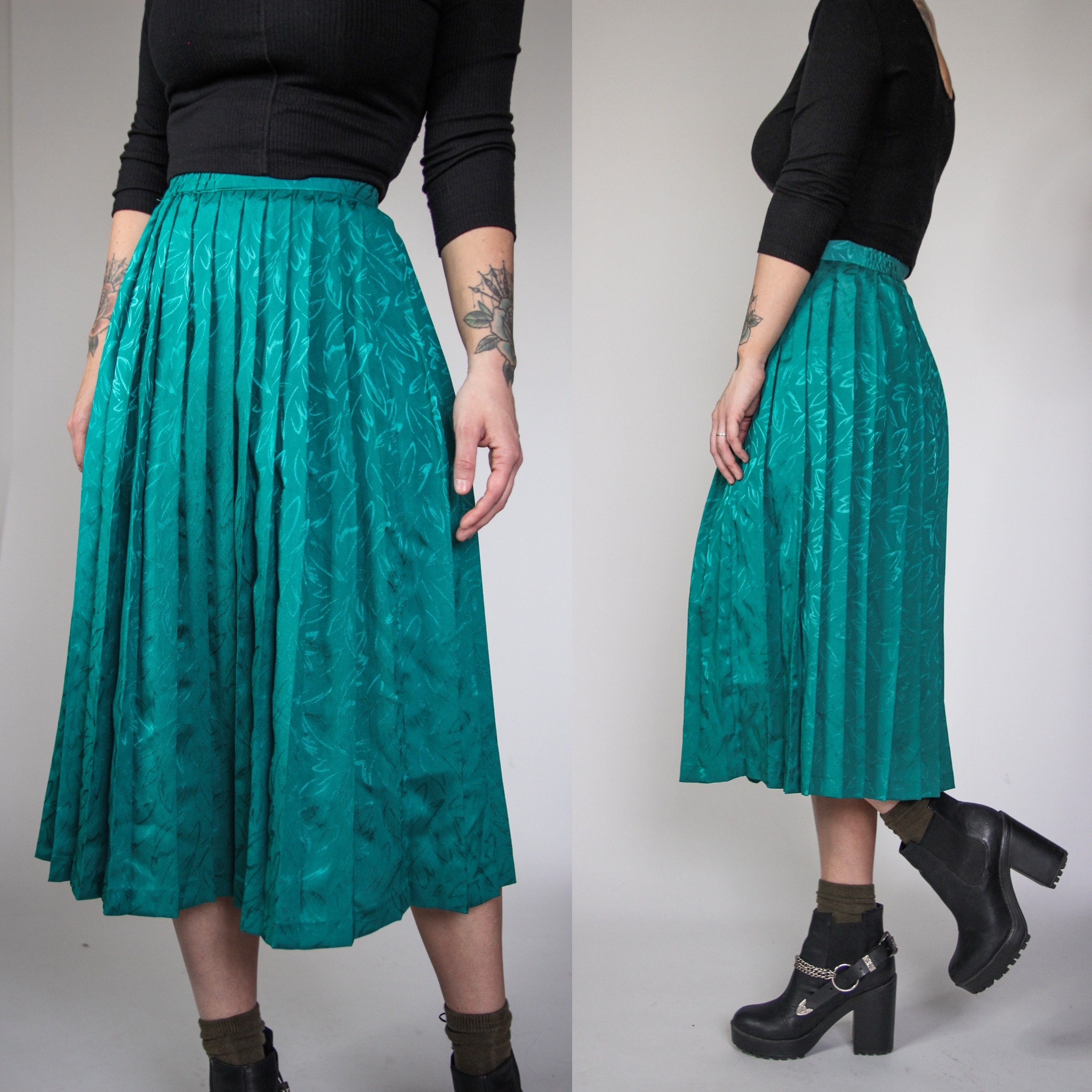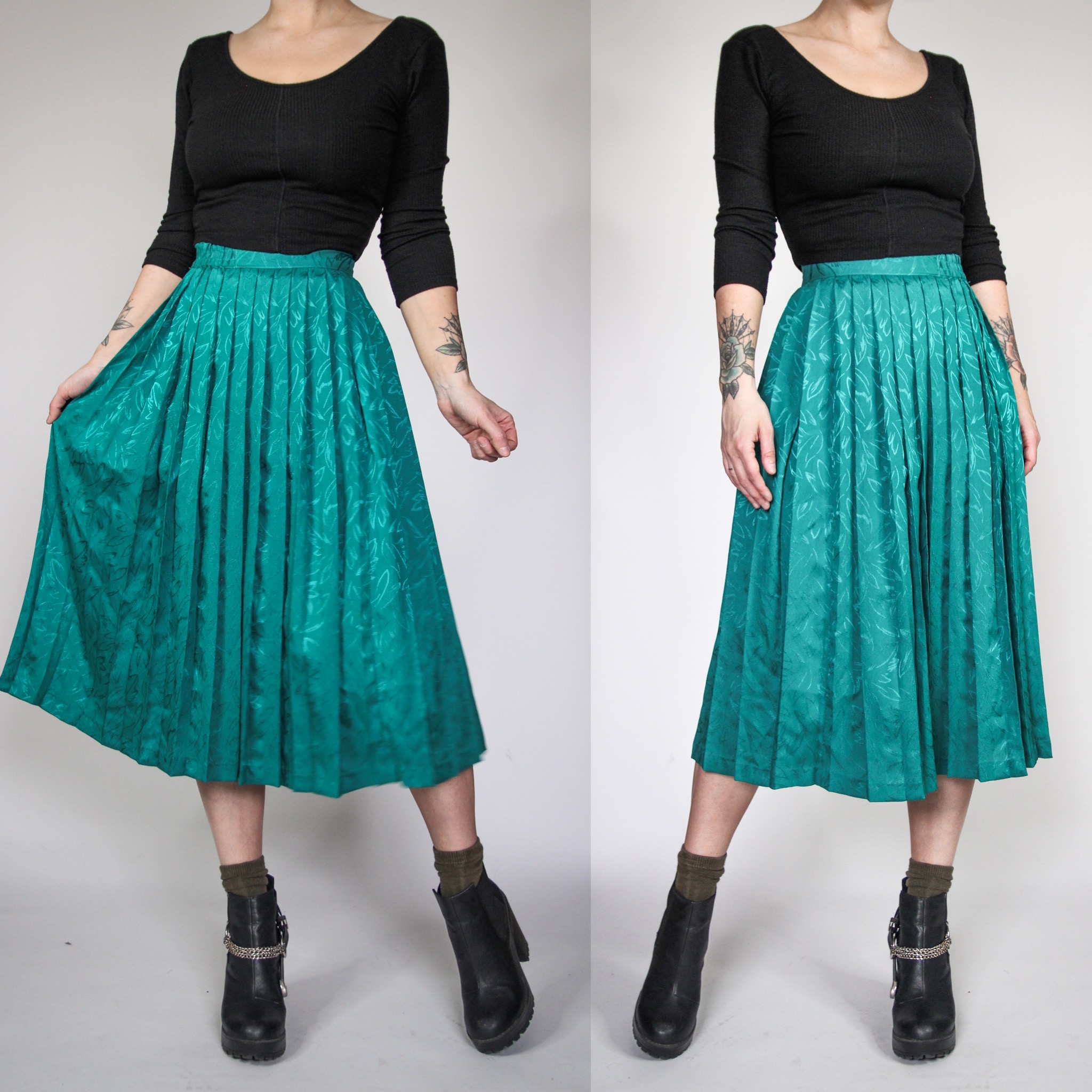Vintage 80s pleated midi skirt. Stunning bright teal-green shade with a shiny floral print. Meant to be worn high waisted. Fabric is a lightweight and swishy embossed poly satin. Back zip with button closure at the top. Unlined, no stretch. Will hit between knee and ankle on most people, depending on your height. Model is 5'2" for reference.