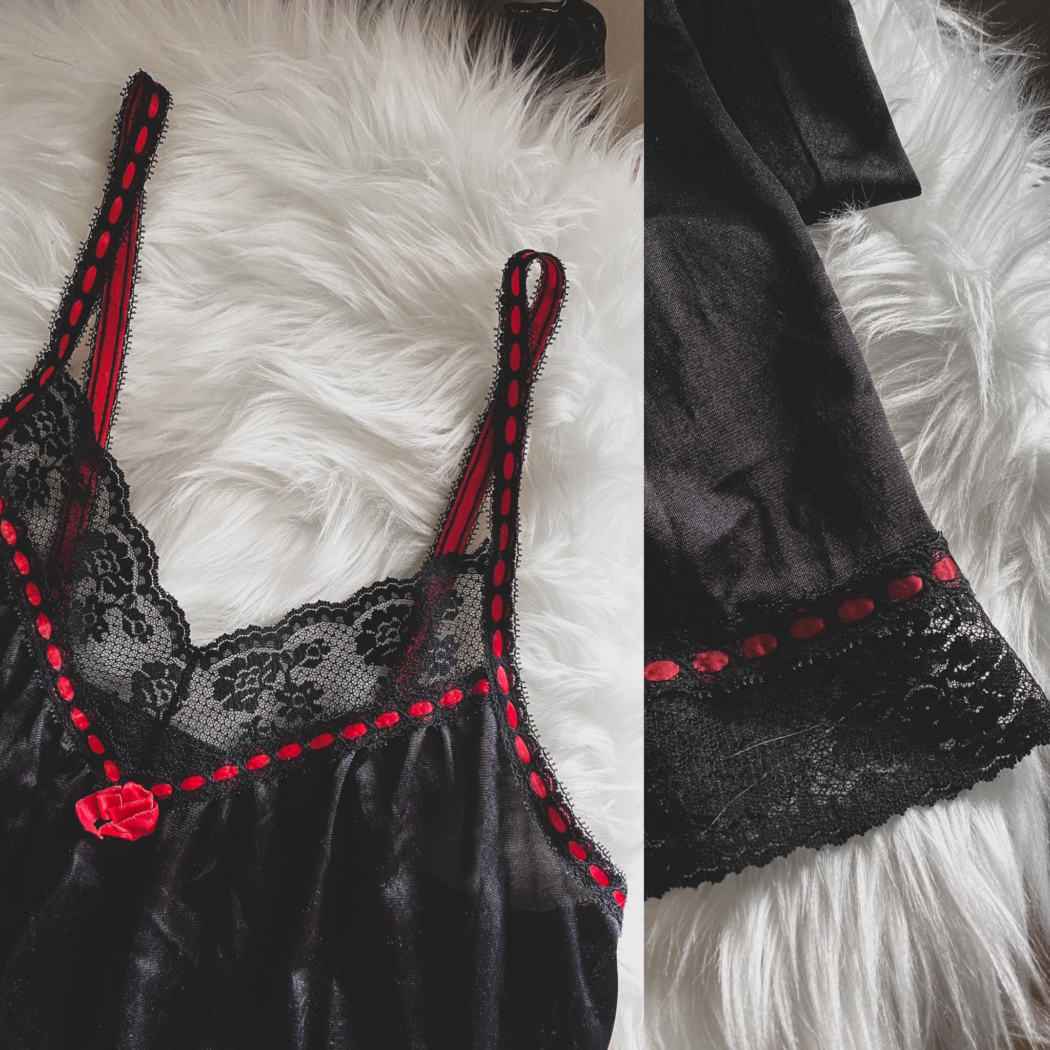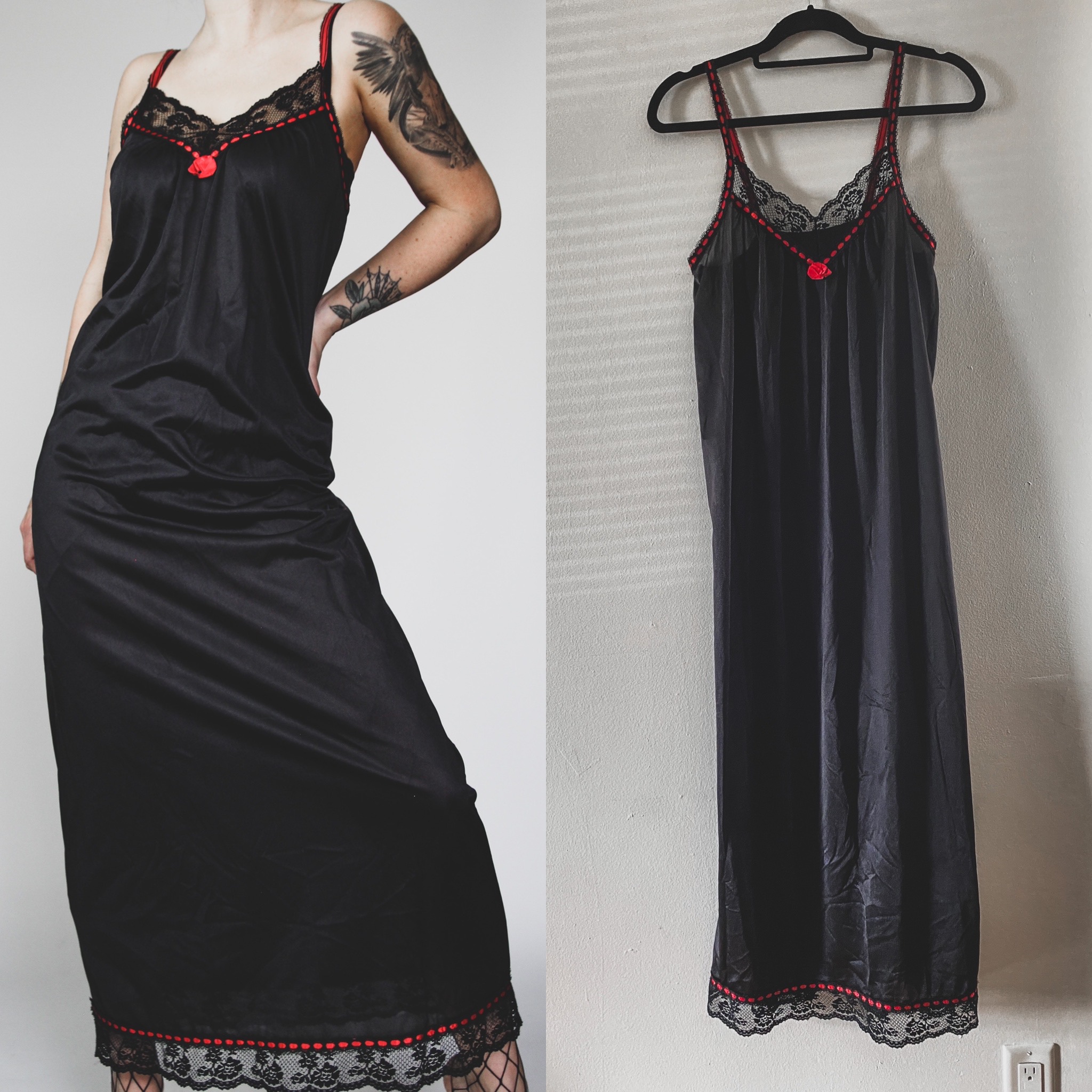 Vintage 80s black and red lingerie nightgown. Soft, semi-sheer black satin, likely a nylon blend. Lace trim, ribbon straps and matching trim at the hem. Straight cut. Unlined, no stretch, pull-on style.