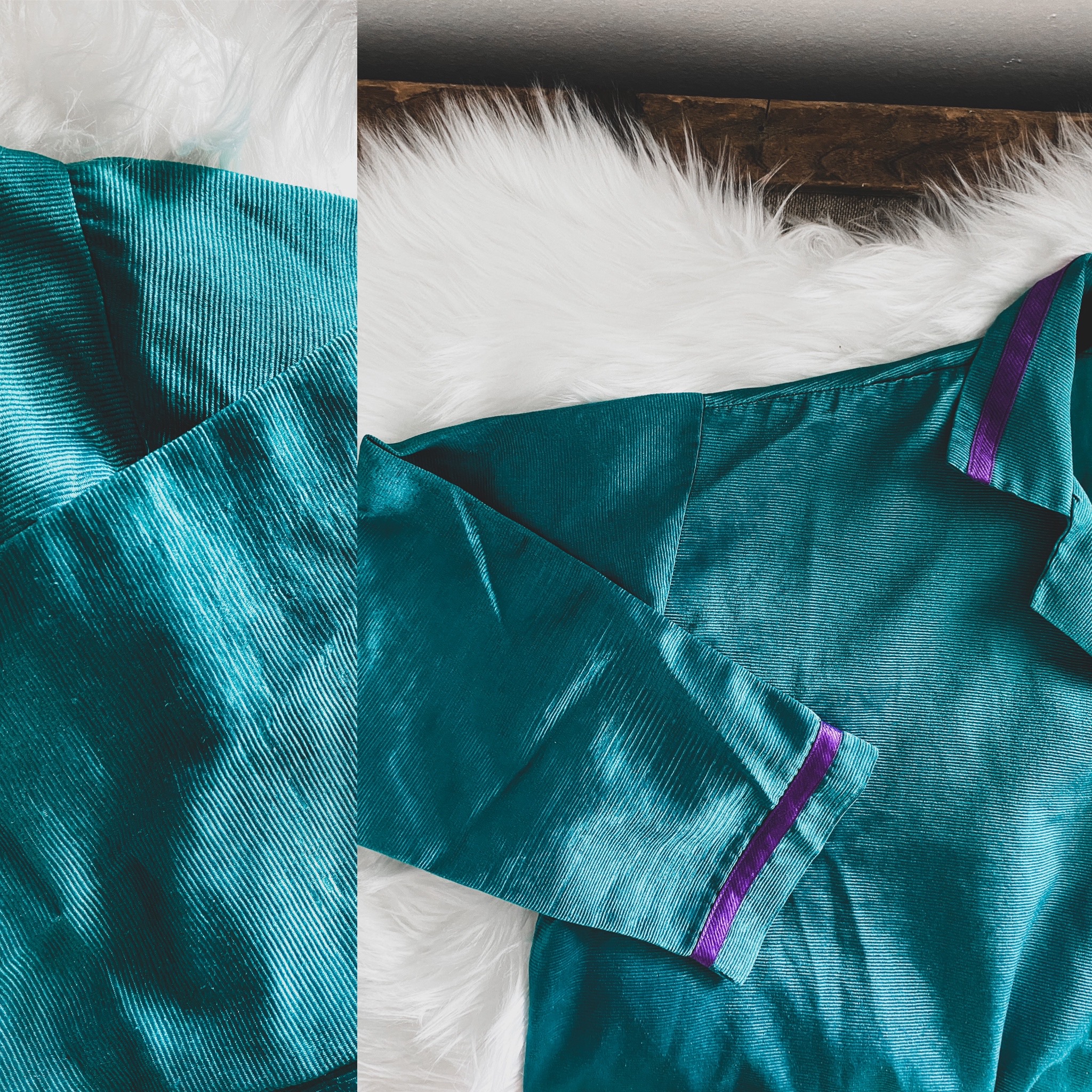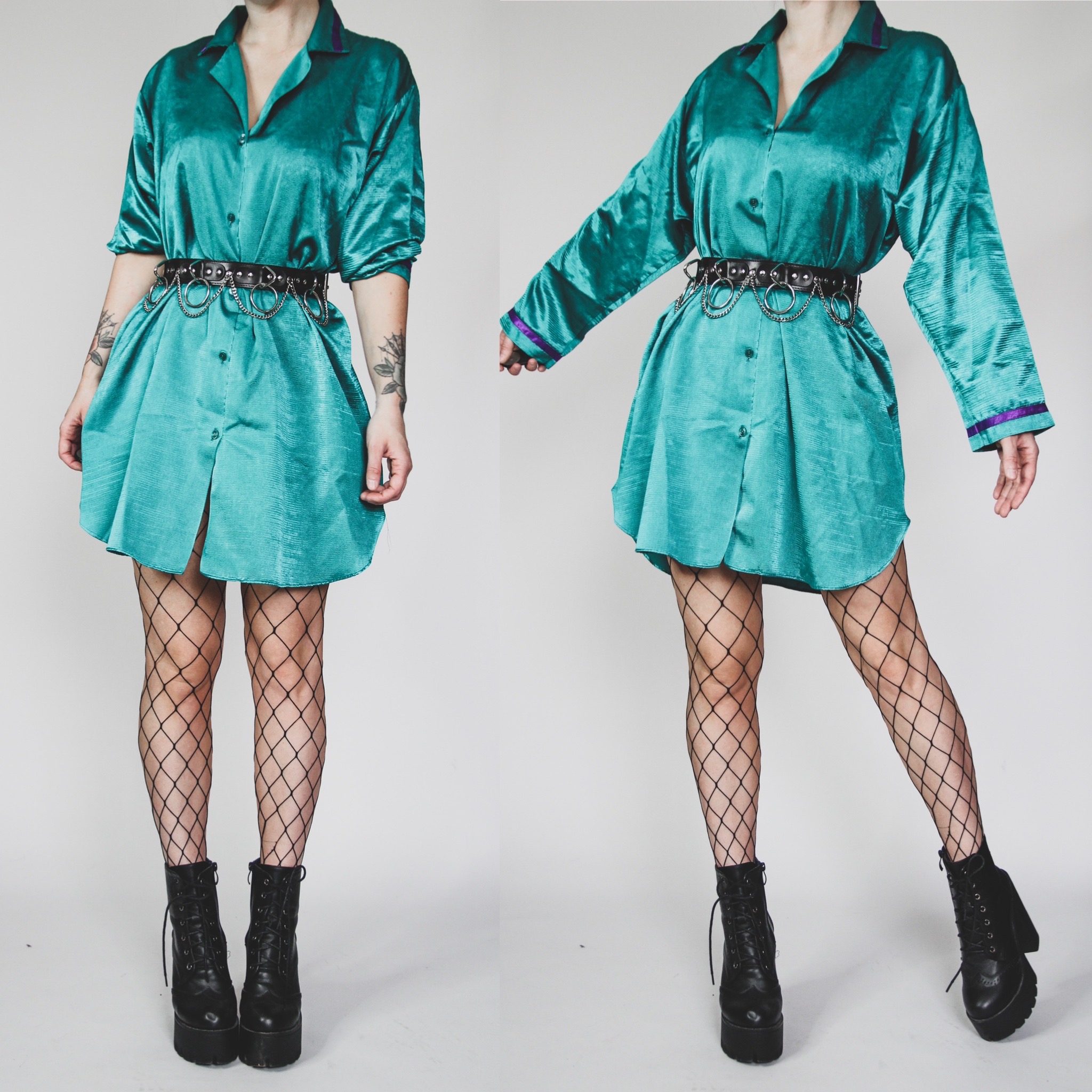Vintage 80s shiny shirt dress. Gorgeous bright teal shade with contrasting purple trim on the collar and cuffs. Loose sleeves and a boxy cut with functional buttons down the front. This can be styled as a shirt dress on more petite figures, or a blouse or throwover piece on taller/curvier figures - lots of styling options! No stretch, unlined. Fabric may show a tiny bit of wear due to age.