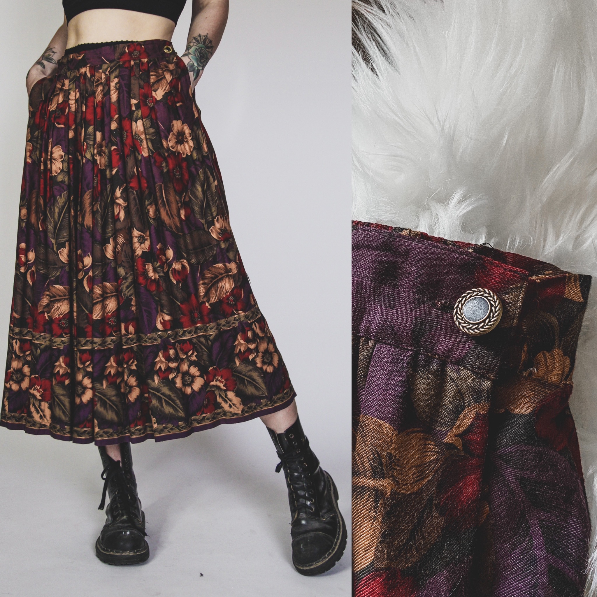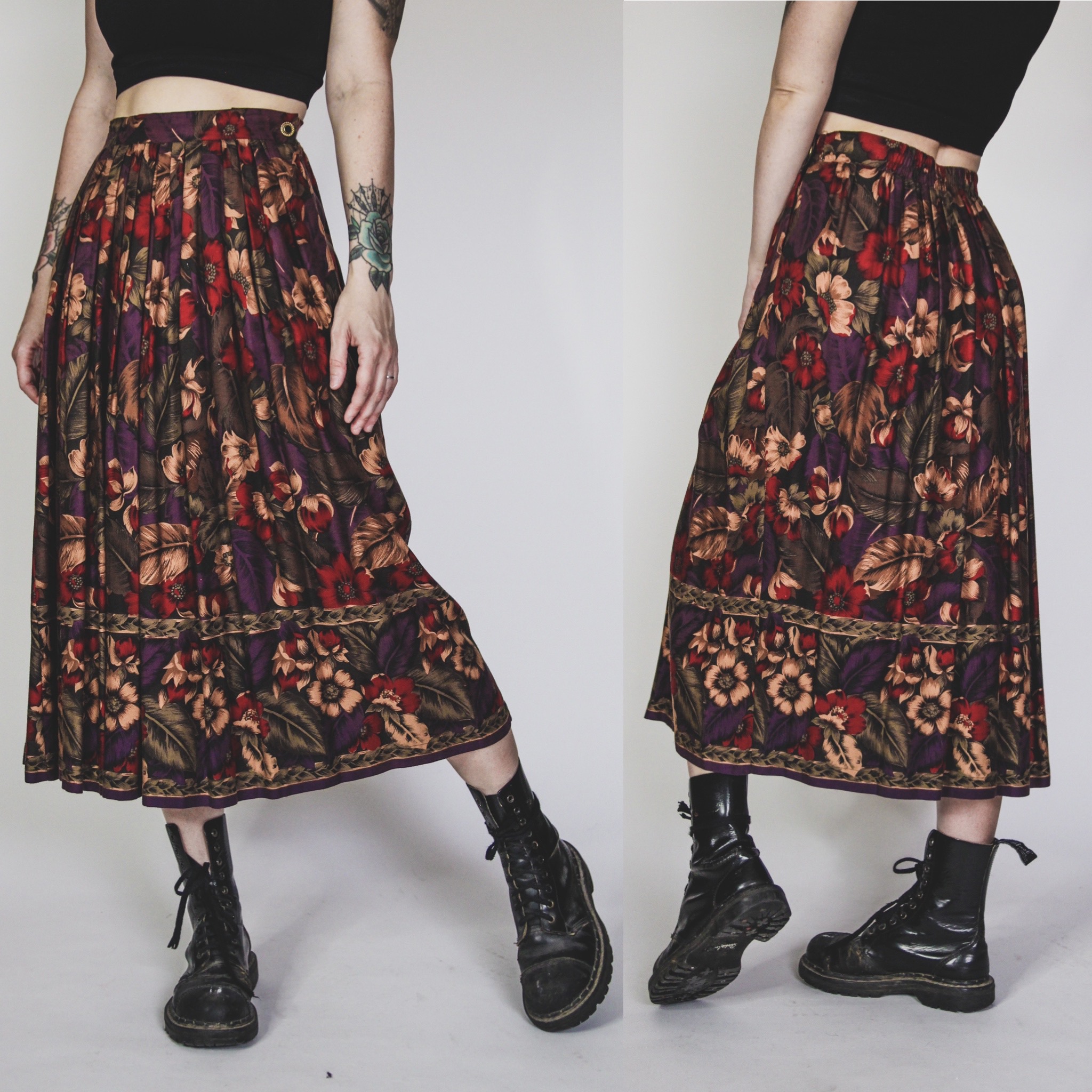 Vintage 80s/90s dark floral print skirt. This one is so hard to let go of! She has POCKETS on both sides. Double button closure at the side of the waist - one hidden button and one gold & black statement button on the outside. Waist is elastic and ruched in the back, not extremely stretchy so please refer to measurements. Pleated a-line cut with lots of movement. Fabric is a super soft cotton or cotton-poly blend, very well loved and may show a bit of wear due to age.