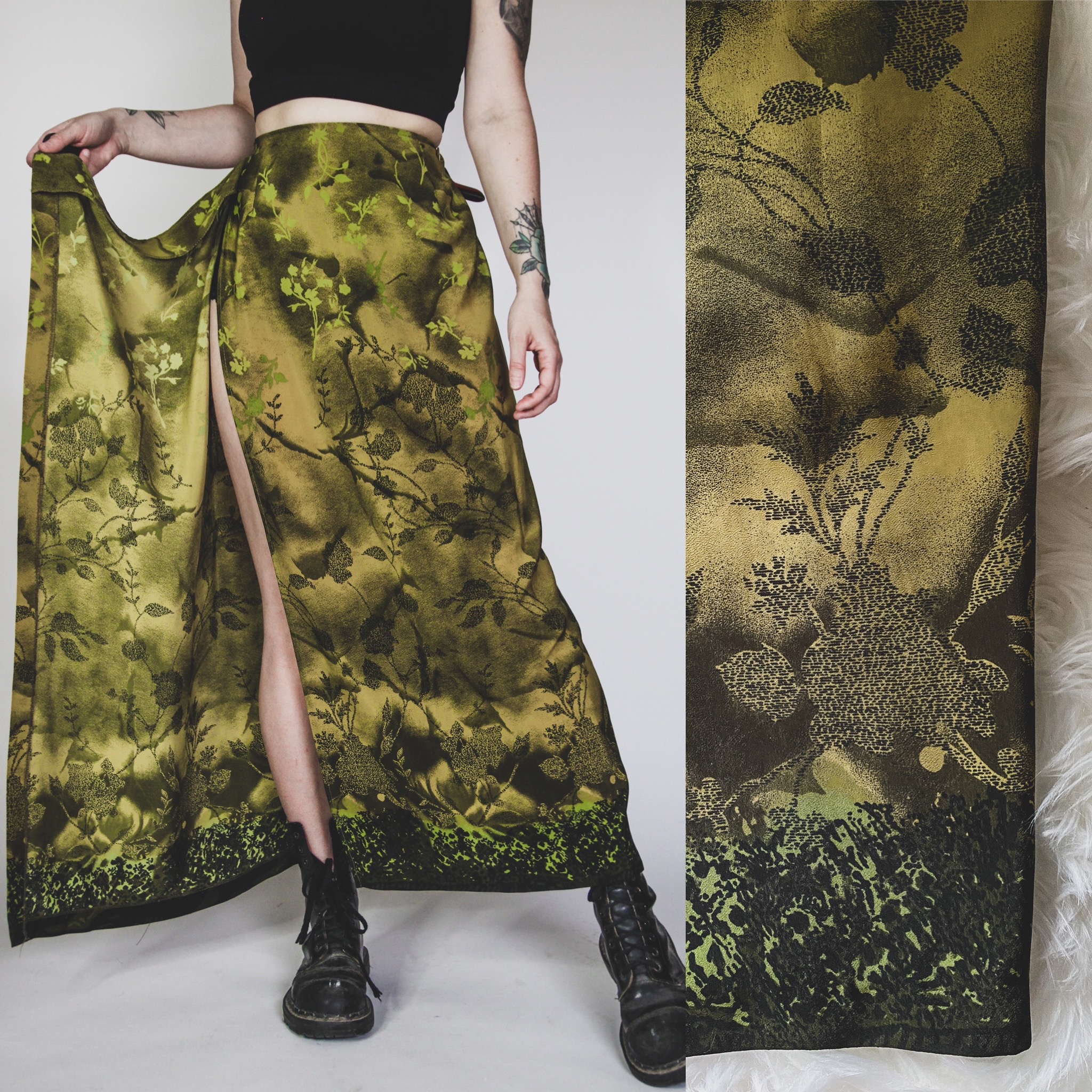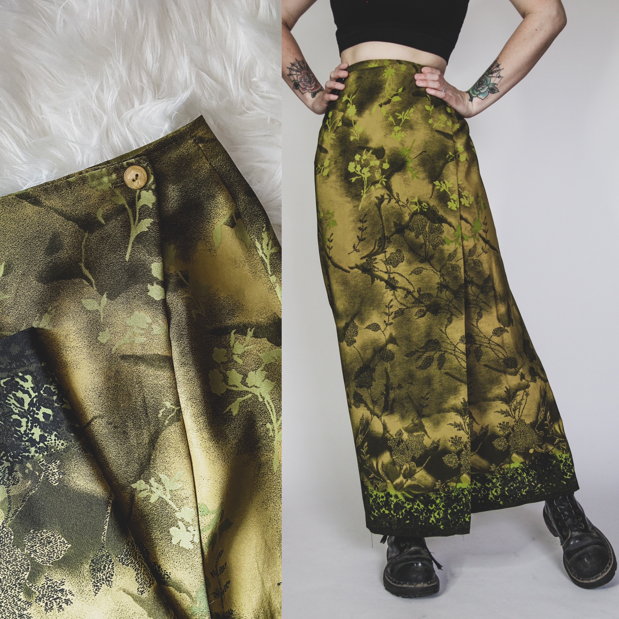 Vintage 90s/Y2K dark floral print skirt. Such a pretty breezy find for summer! Foldover wrap-front style with a double button closure at the waist, one button on each side. Can be worn high or mid waisted. No stretch whatsoever, meant to drape loosely. 100& polyester, very lightweight and flowy. Unlined.