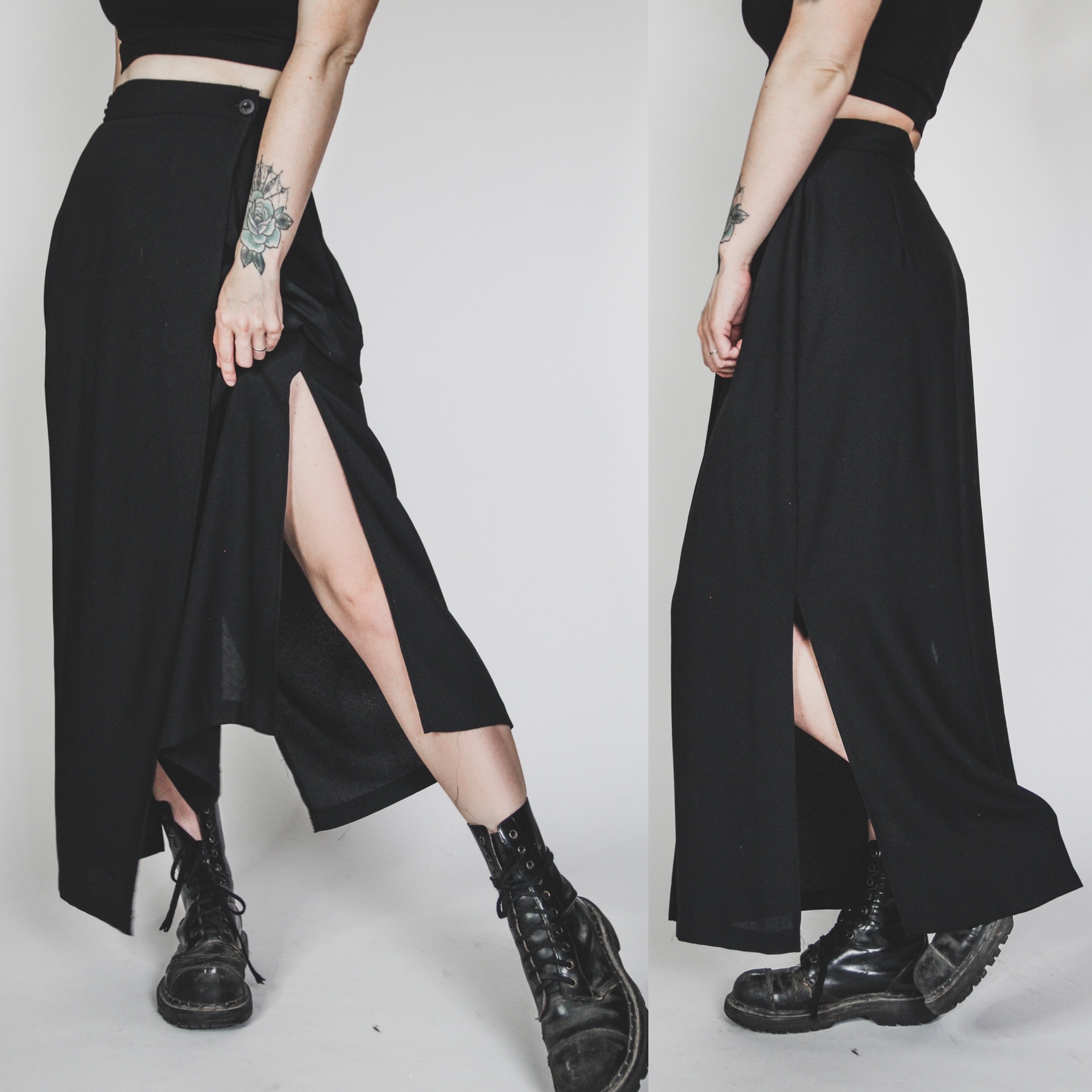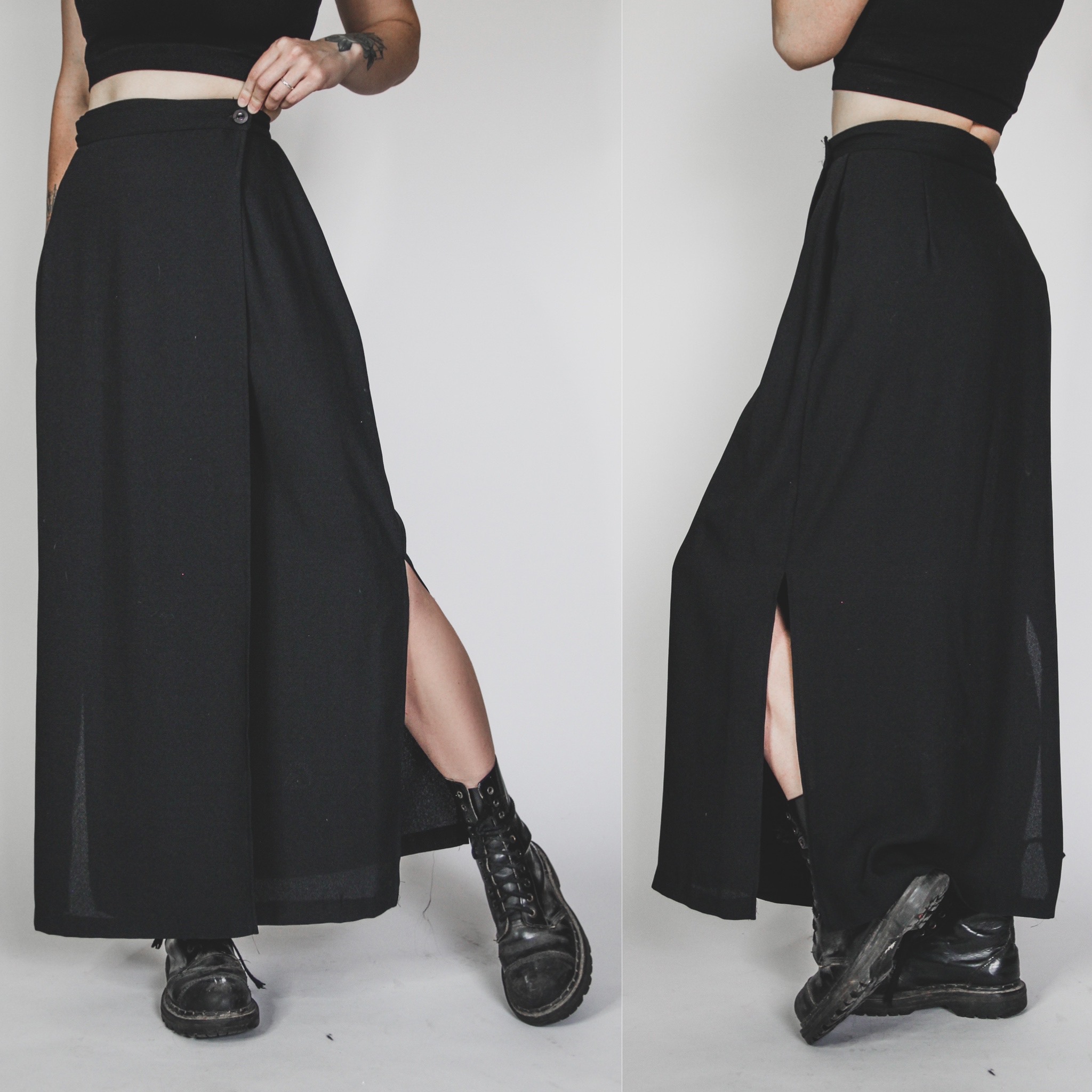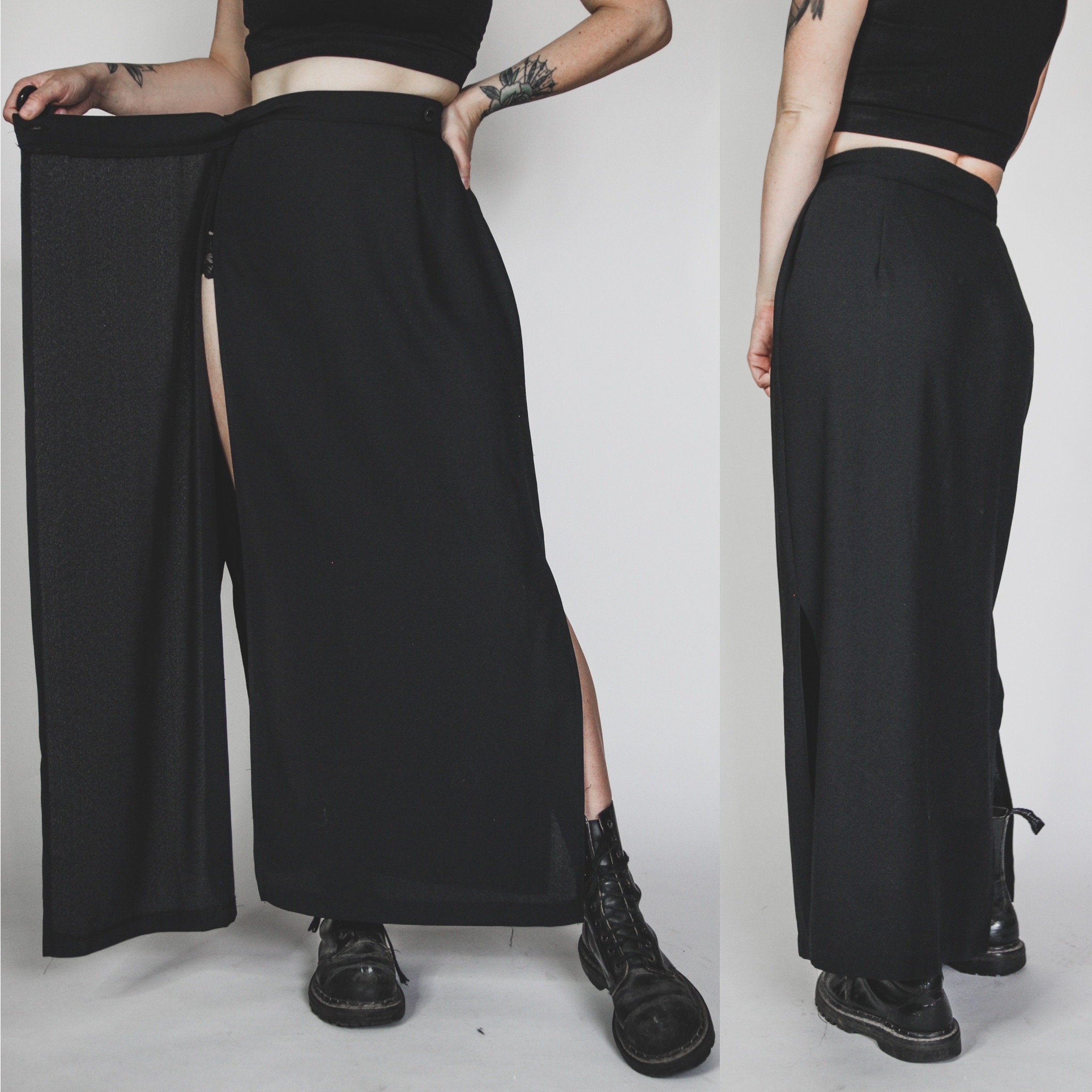 Vintage 90s witchy black wrap skirt. Open-front foldover wrap style. Two buttons at the waist, one on each side. The wrap style gives it lots of room to show leg and move comfortably, great for hot weather! Meant to be worn high waisted. Fabric is a flowy but sturdy polyester. Unlined, no stretch whatsoever.