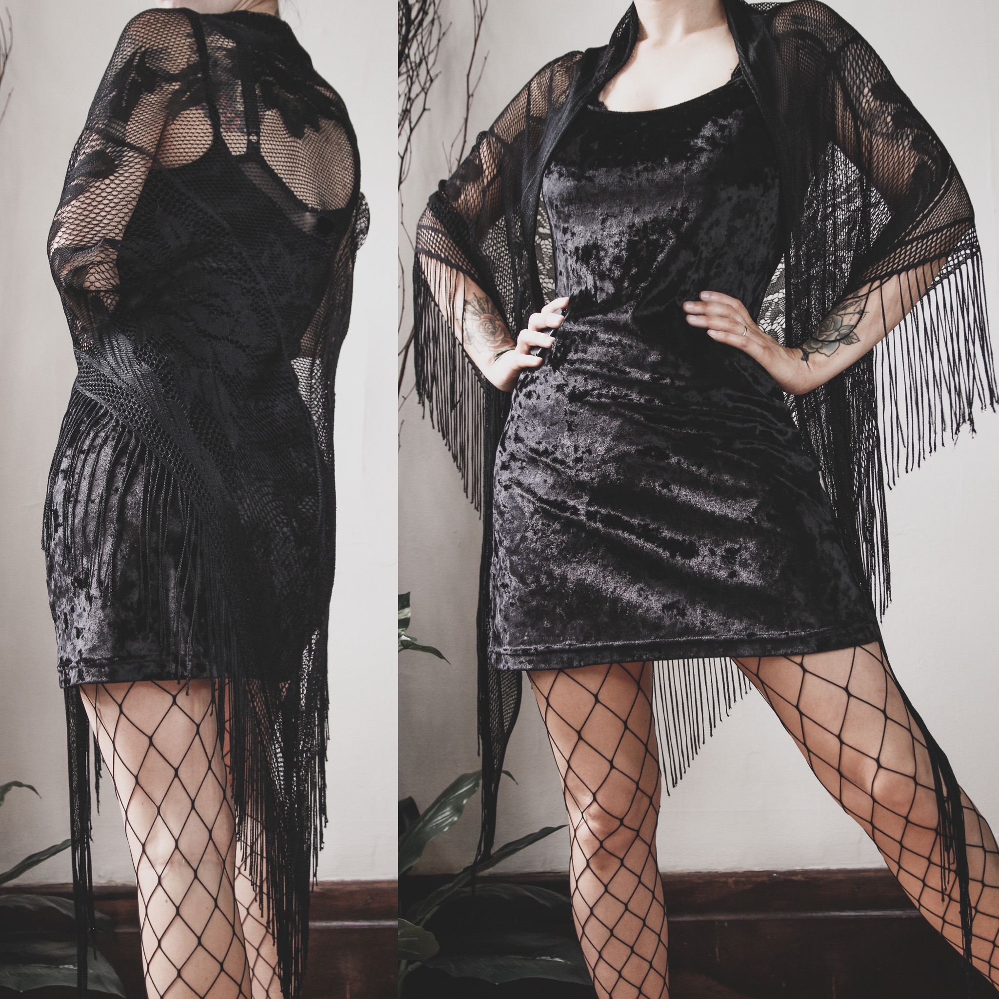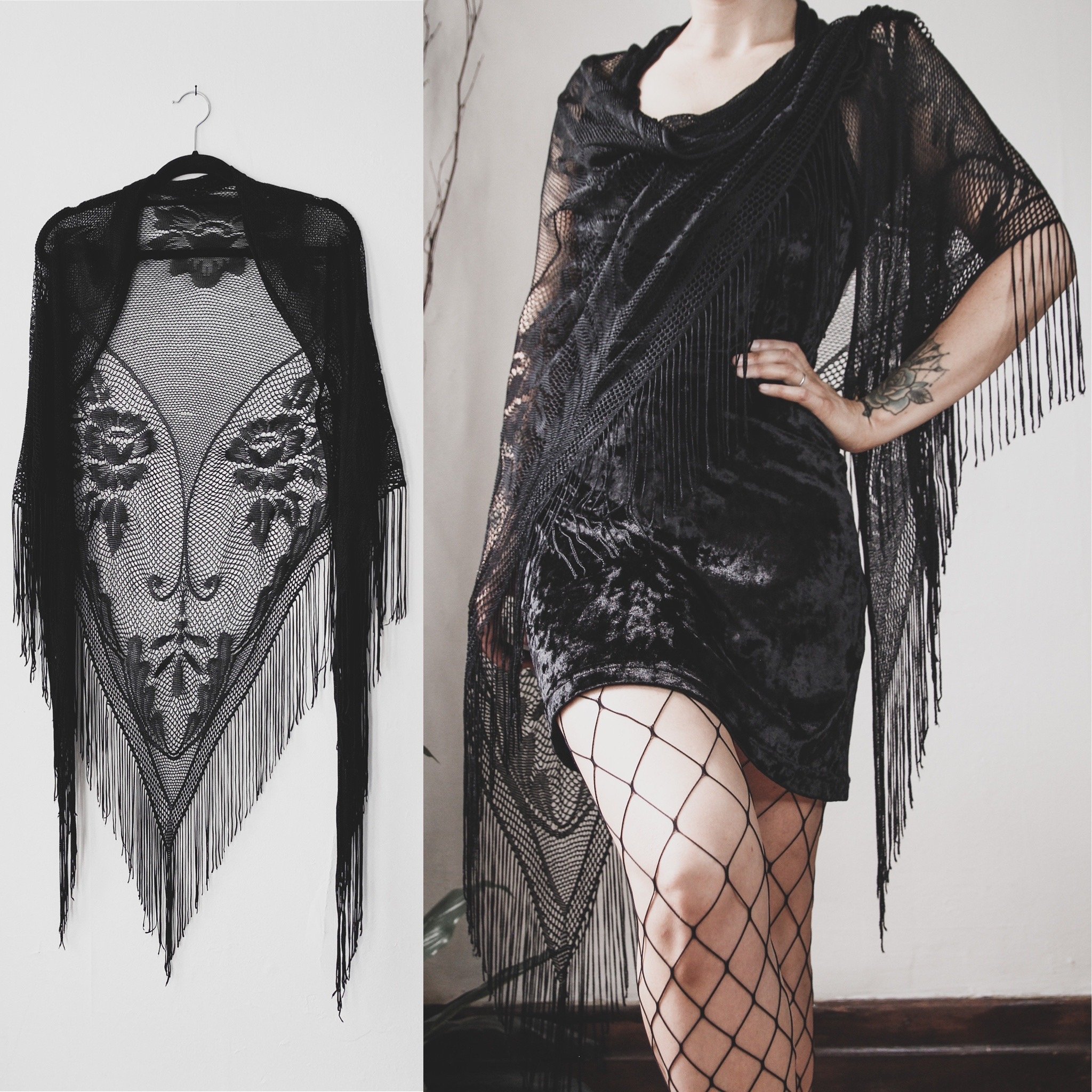 This one is triangular, in deep black 100% viscose rayon fabric, with a beautiful Victorian-inspired floral lace motif and luxe fringe on two sides.