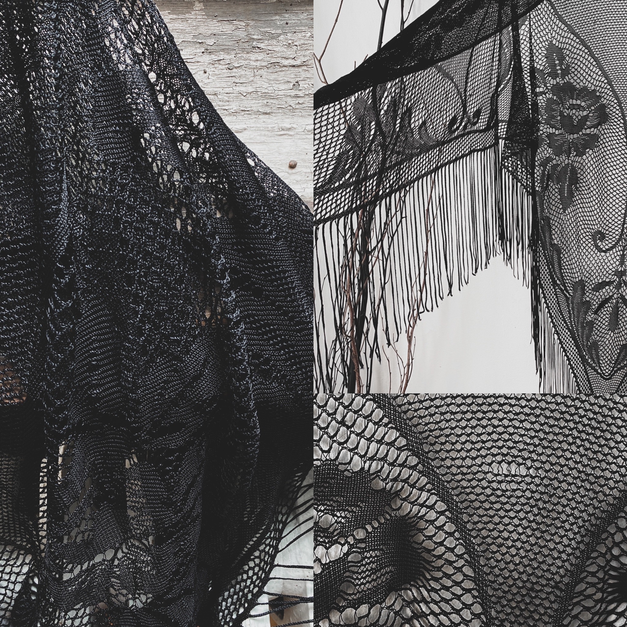 Vintage lace fringed shawl. This is a Last Rites signature piece in a XXL oversize style for extra drama. All Last Rites signature shawls are one of a kind with unique colors, patterns and lace! No two are alike.