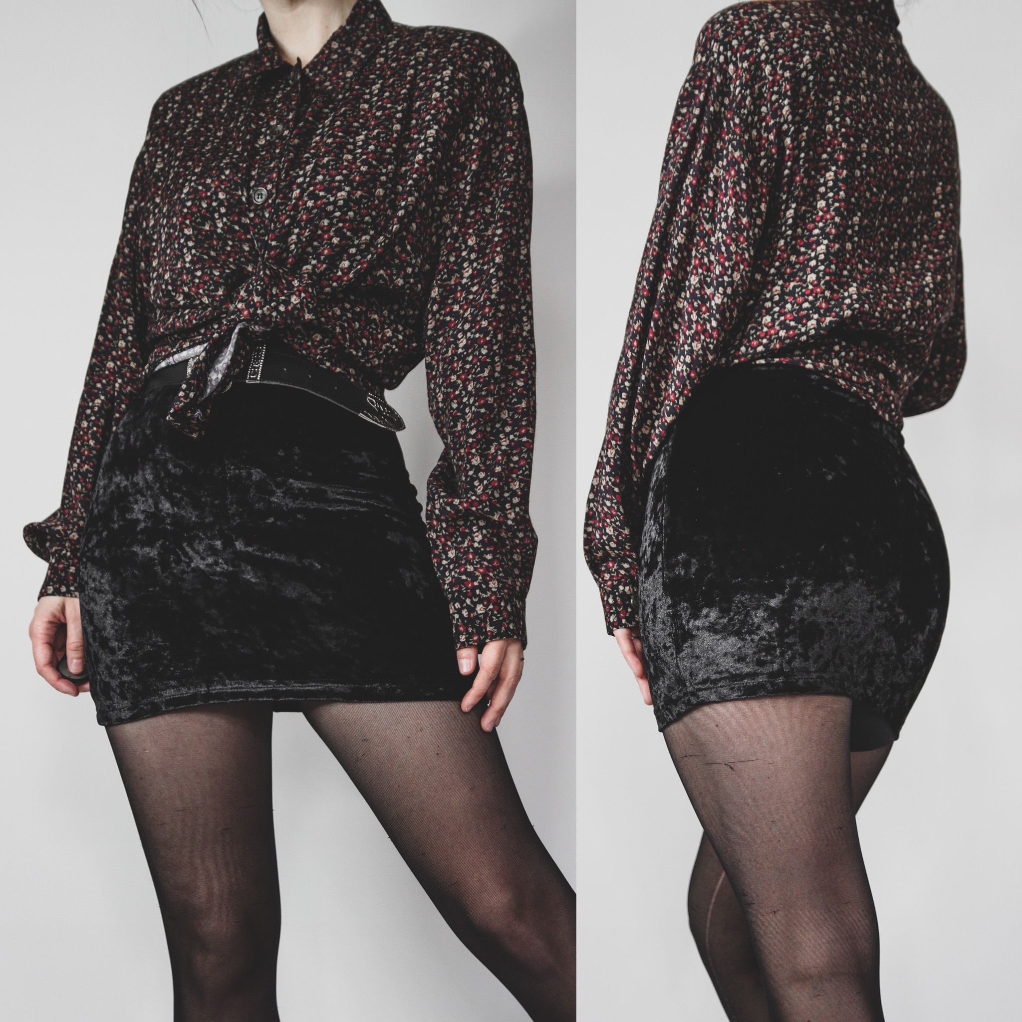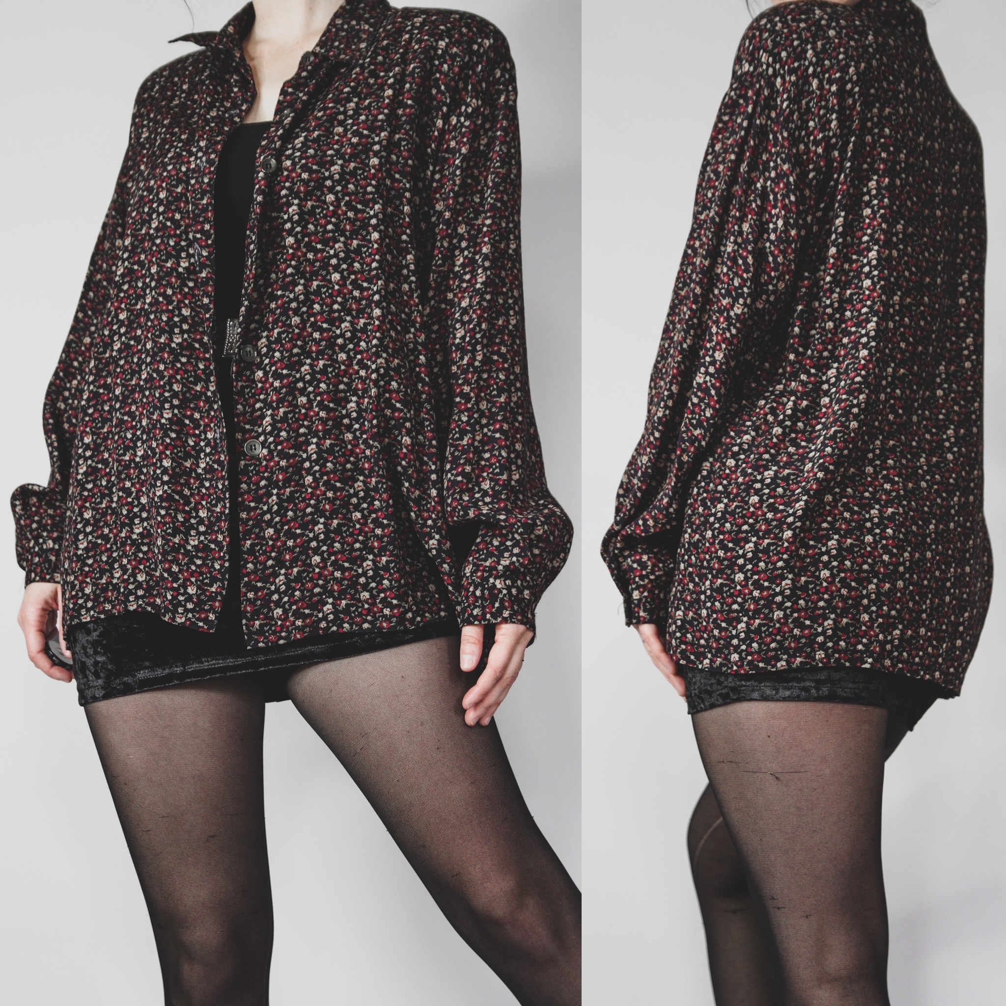 Vintage 80s floral blouse. Lightweight, soft 100% rayon fabric. Print is a dainty floral in shades of olive green and burgundy on black. Boxy cut, button down, sleeves are wider at the top and taper towards the wrist. Unlined, no stretch, no itch factor. Original shoulder pads are intact but can be easily removed if they're not your thing!
