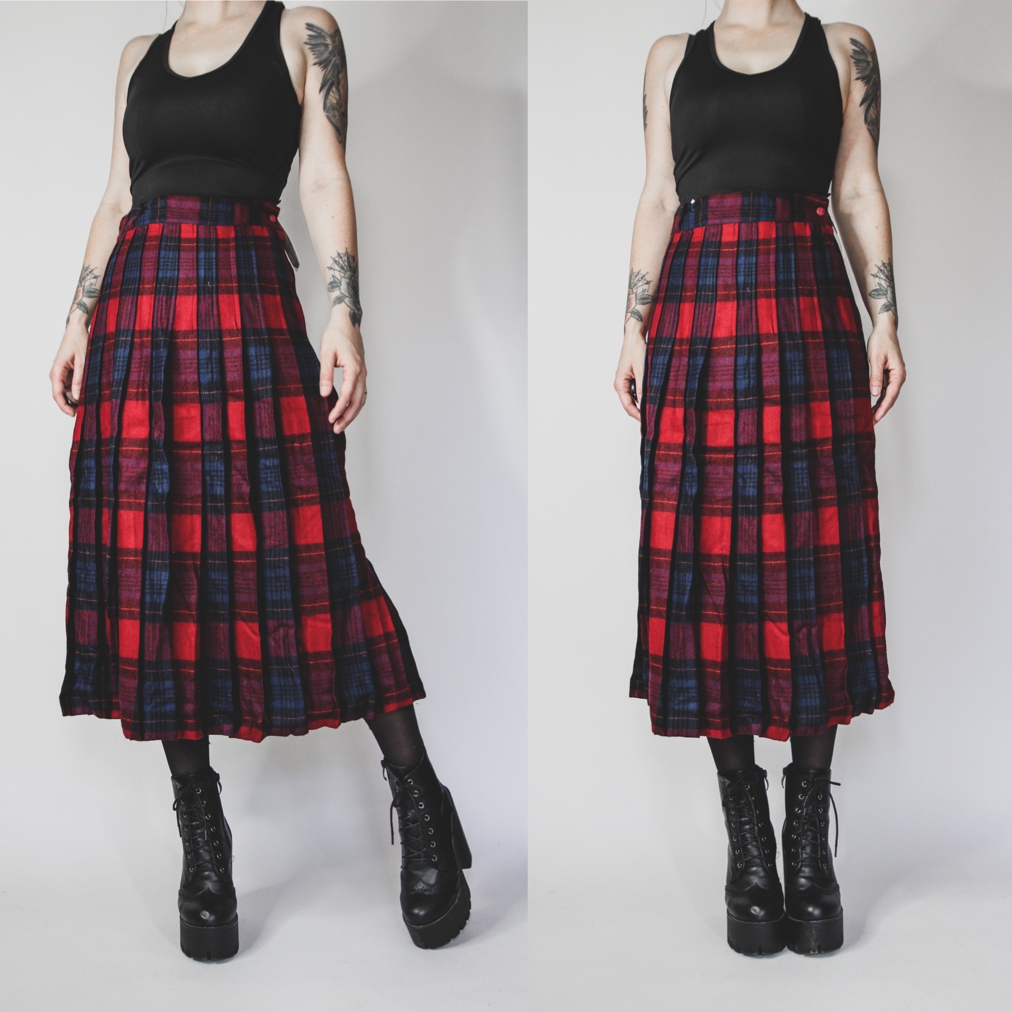 Vintage 80s deadstock Caroll Paris plaid skirt. Original tags attached and she retailed for $124 back in the day! Wool-viscose-poly blend, no stretch whatsoever. Unlined, will definitely have some itch factor if you're sensitive to wool or knits. Pleated, structured cut in a classic tartan (blue, black, red and burgundy). Back zip with button closure at the top, and a wide waistband with belt loops!