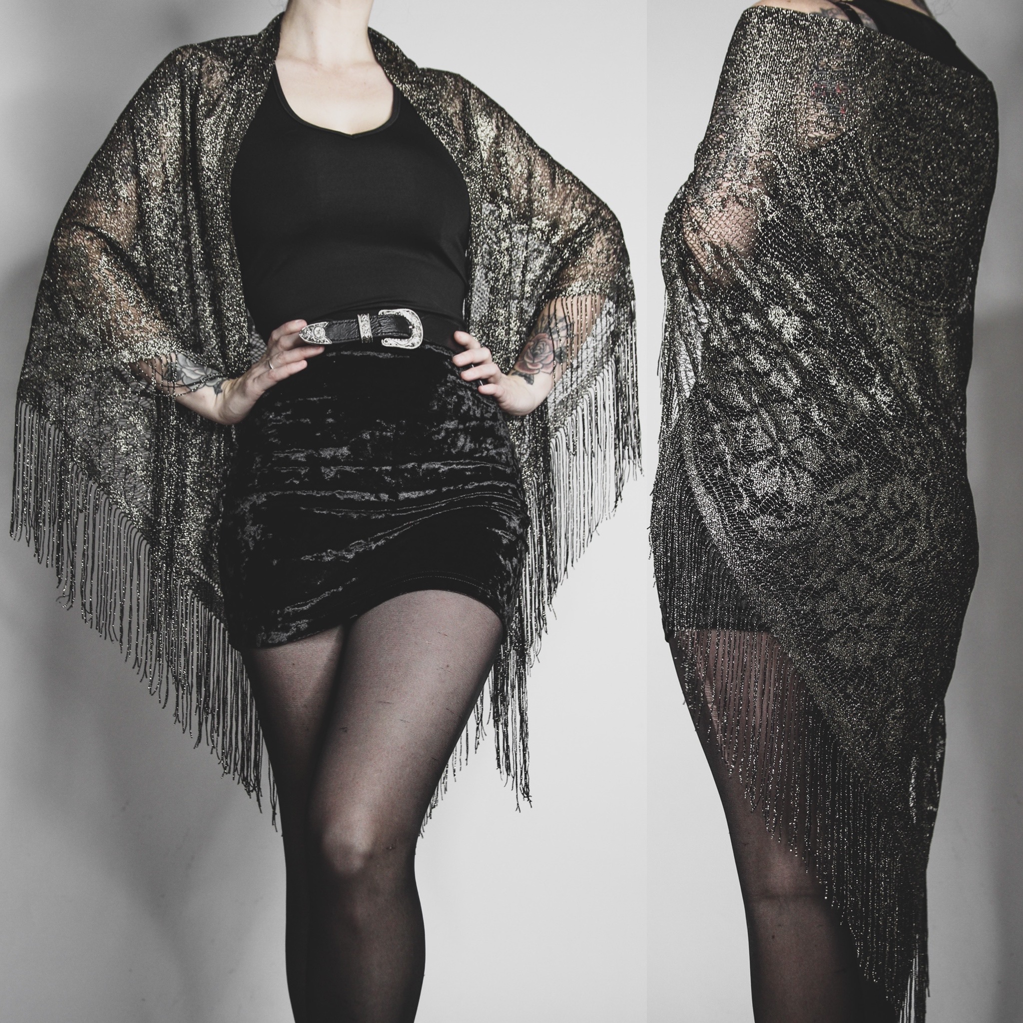 Vintage black & gold metallic lace shawl. Extra-oversized style, delicate mesh lace. Triangular with fringe on two sides. Gorgeous floral motif. Can be styled all year round. Stevie Nicks would be proud!