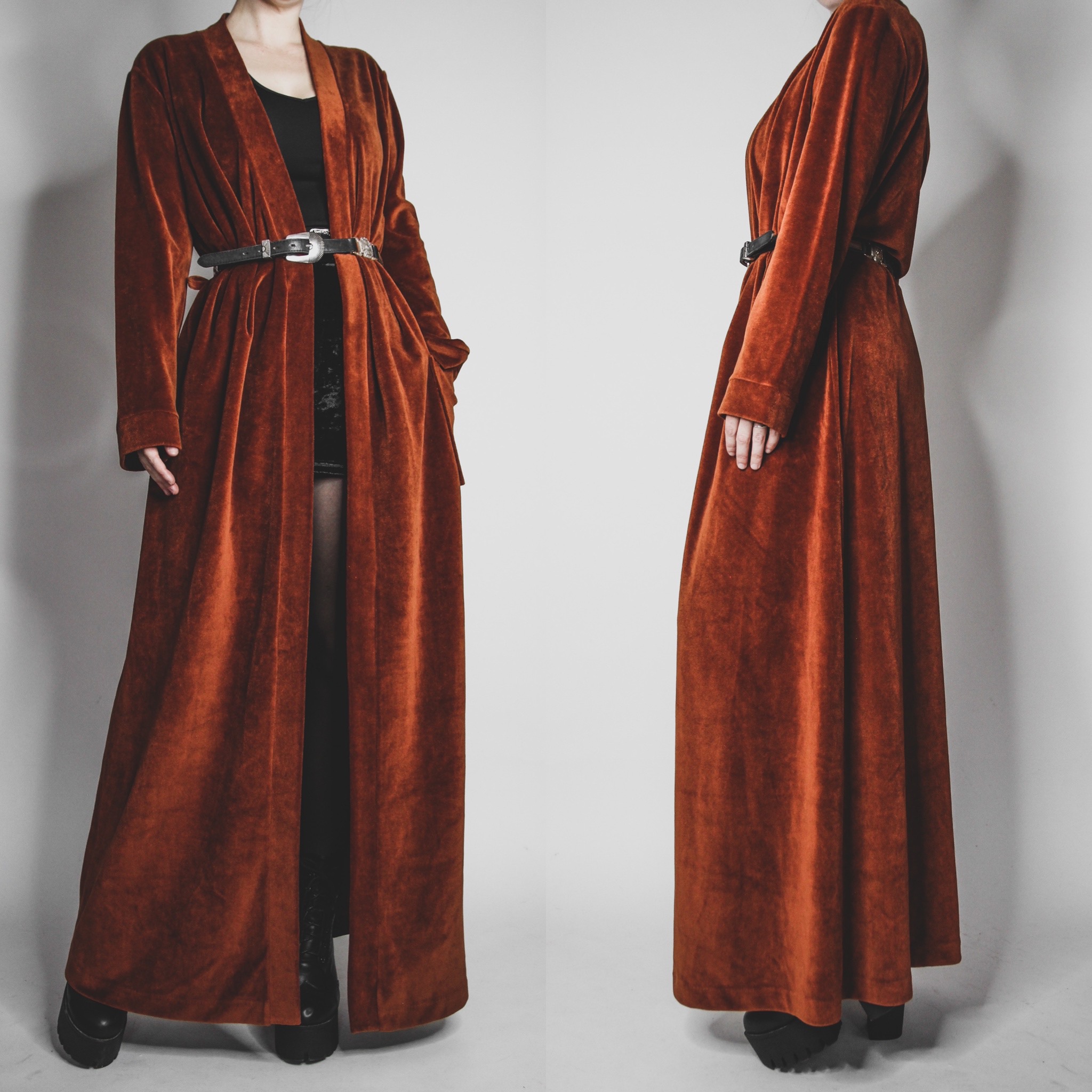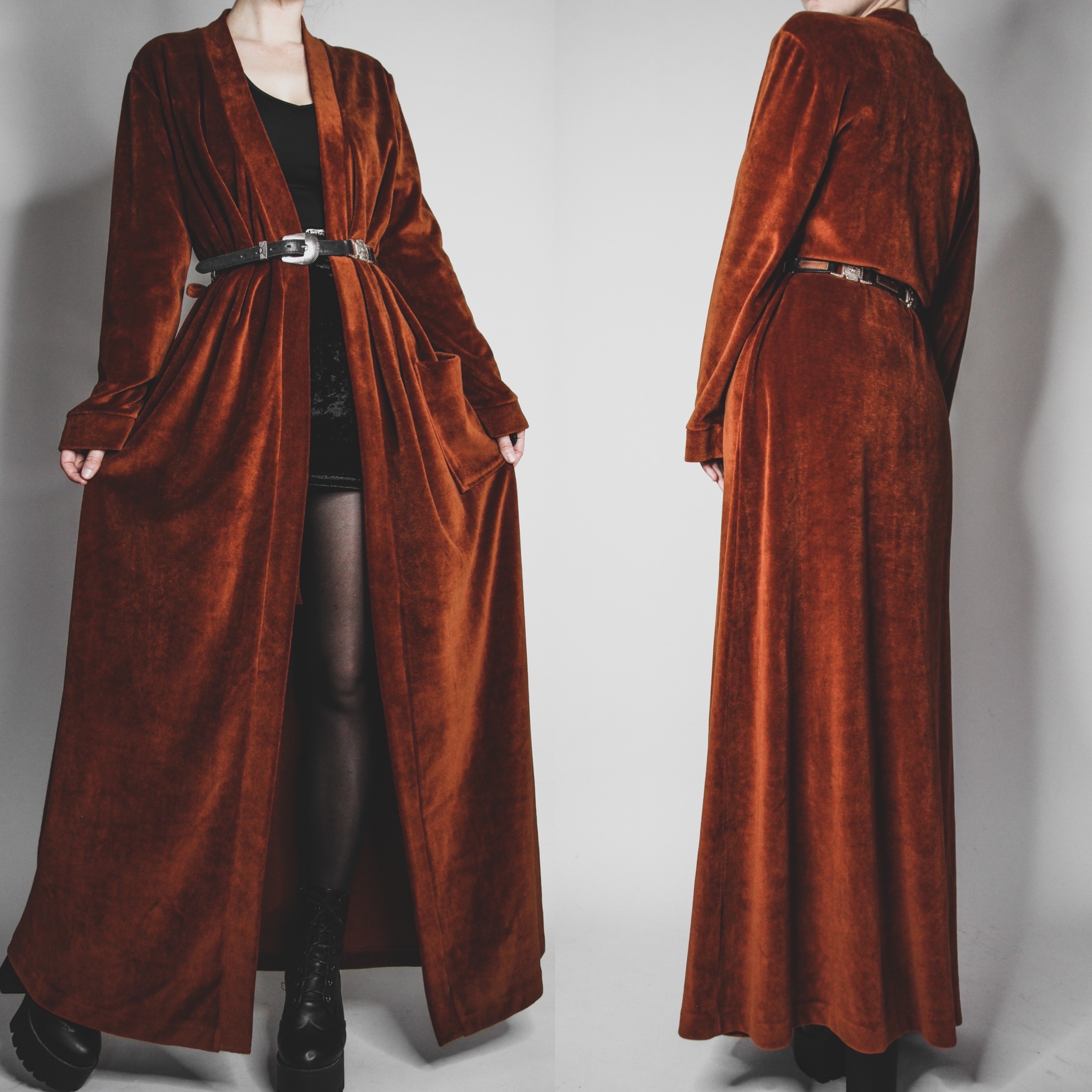 Vintage pumpkin orange robe. Tags have been removed, exact age and fabric unknown, but feels like a knit cotton terry blend. Outside is an ultra-soft velour. Not stretchy but has a bit of "give" for comfort and movement. Hidden tie on the inside at the hip and belt loops on the outside - outer belt is not included but you can easily add your own! One small hole in the back, barely noticeable and does not affect wear. Perfect fall loungewear but can also be worn as daywear in place of a cardigan or jacket. Cozy fall vibes just in time for October!