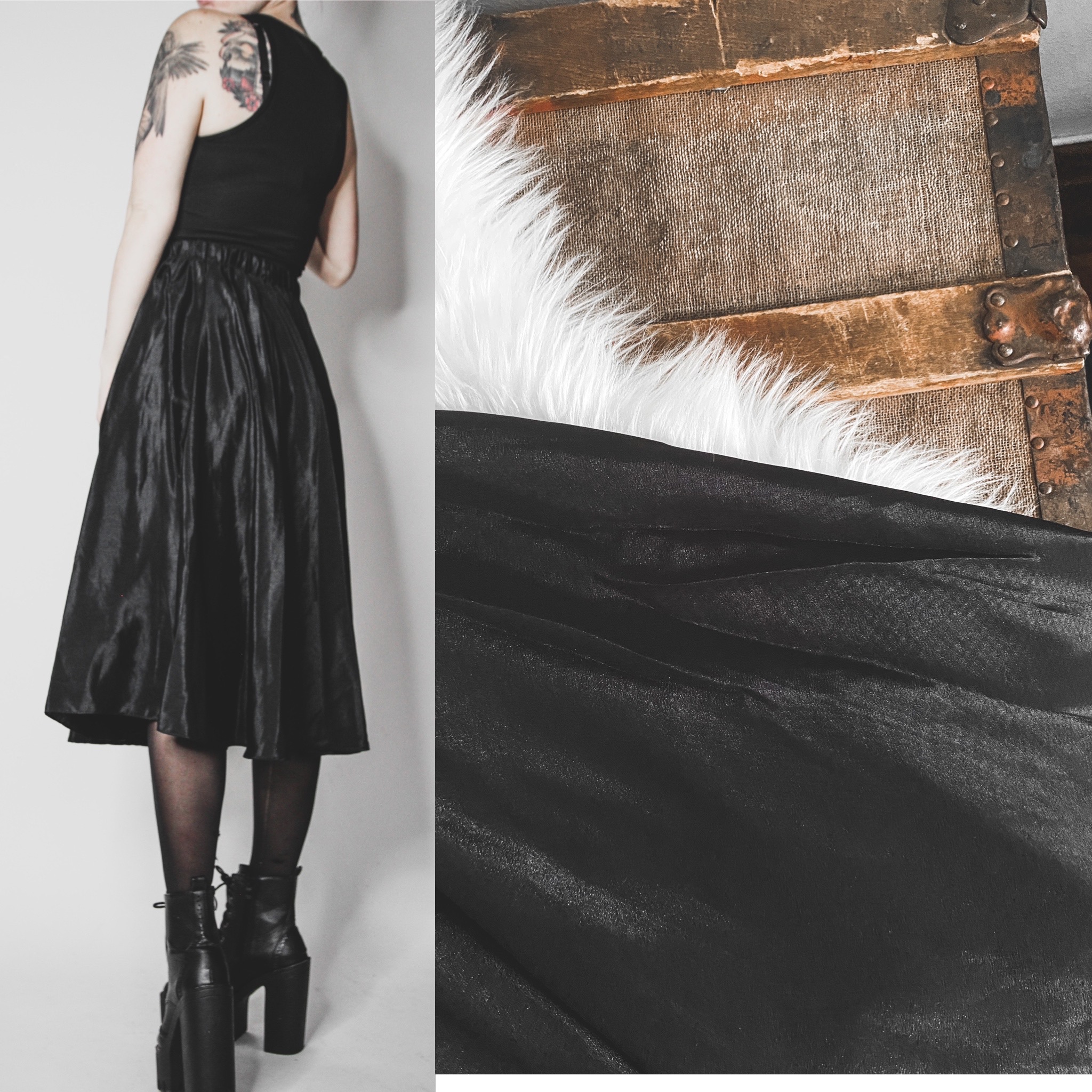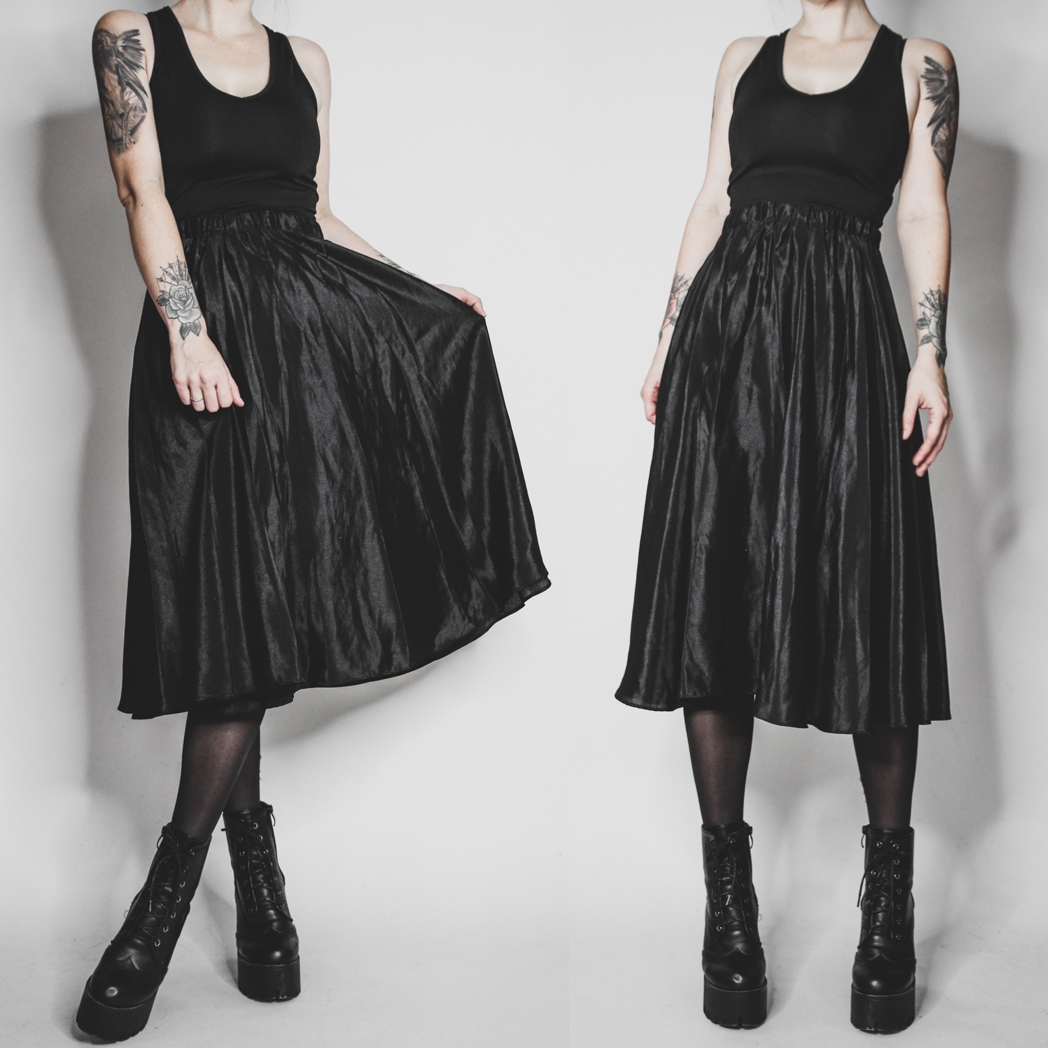 Vintage 80s shiny midi skirt. Pleated flared A-line cut, pull-on style. Two layers of fabric - inside is a slightly more stiff poly satin and outer layer is a flowy poly satin. Ruched elastic waistband has lots of stretch (very comfortable!), please refer to measurements. Meant to be worn high waisted.