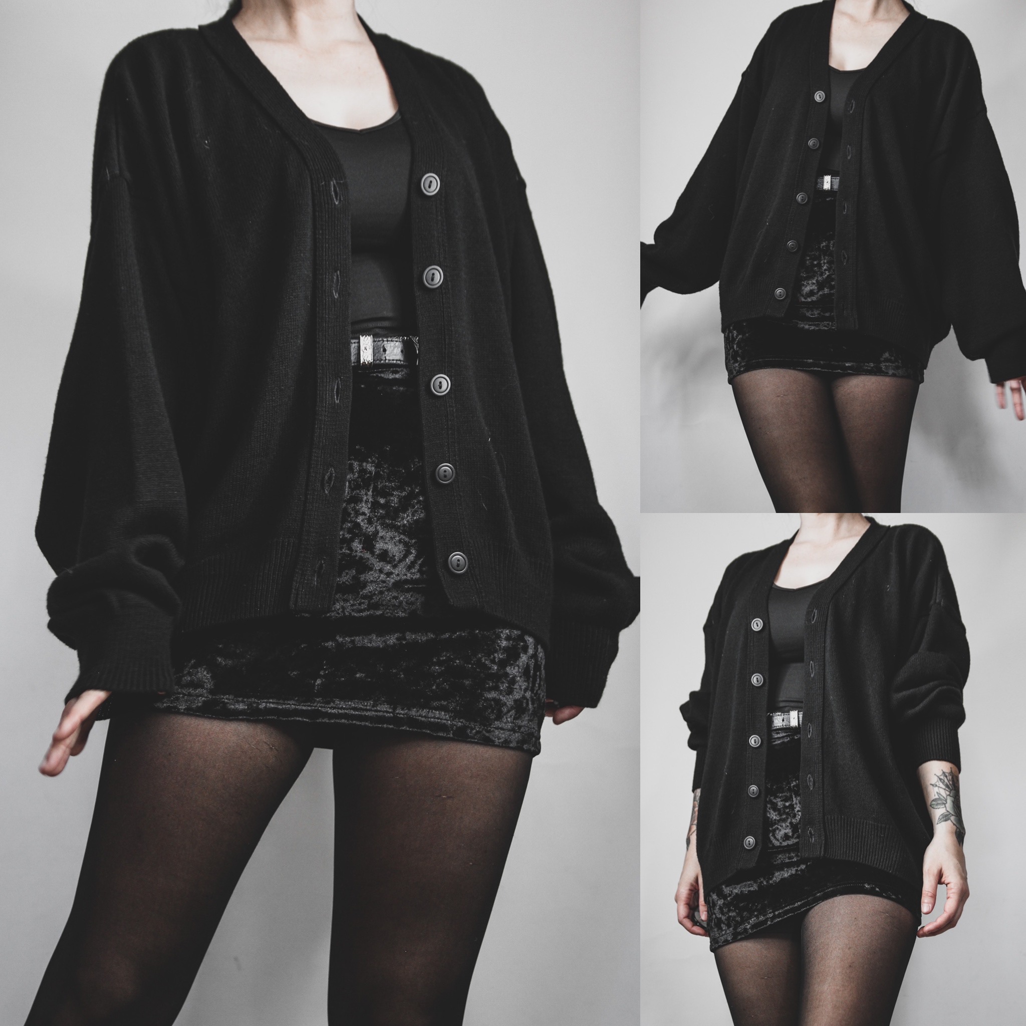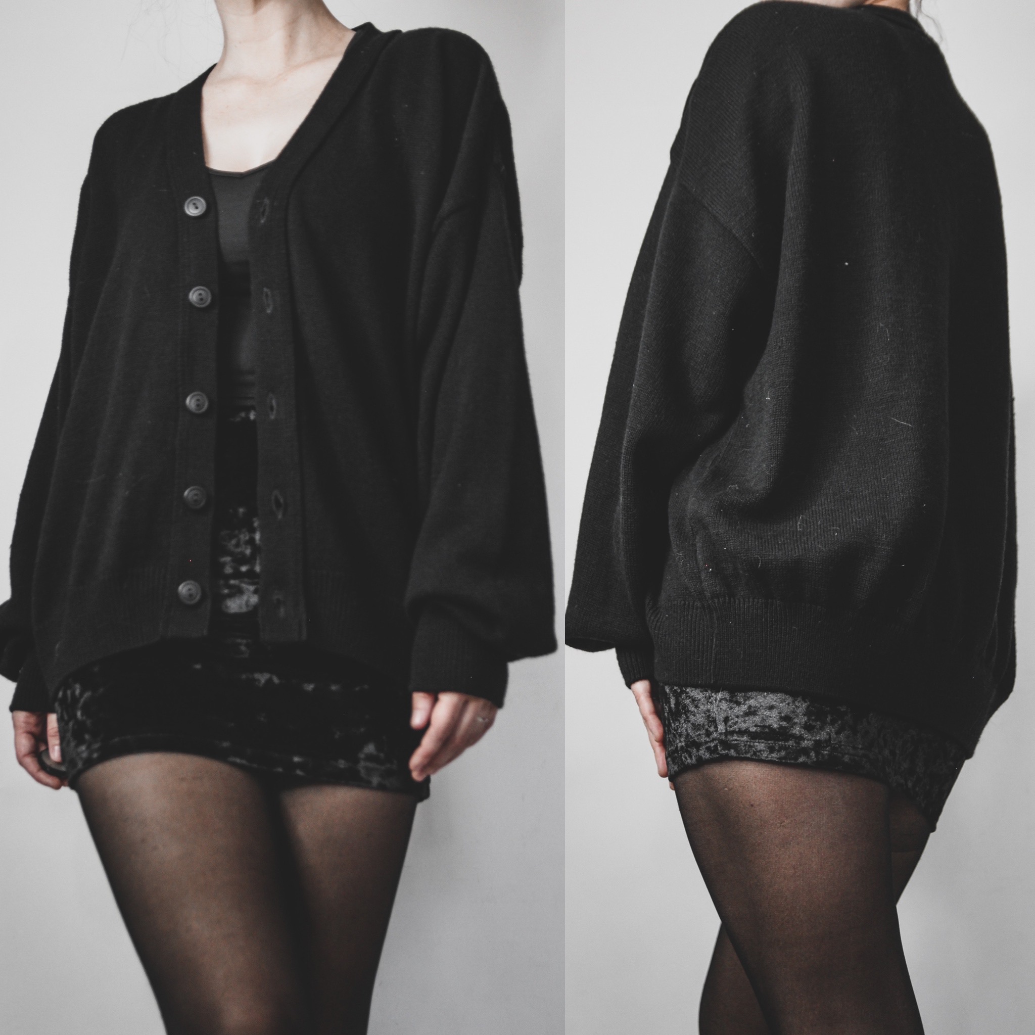 Vintage signature cardigan. All Last Rites sweaters are one-of-a-kind unisex finds, straight out of the 70s, 80s and 90s! This one is a classic mid-weight knit in classic deep black. 100% acrylic. May have a bit of itch factor for some folks, especially if you're sensitive to knits, but layer up with a thermal or turtleneck underneath and you should be fine! Perfectly broken in, slouchy and cozy. V-neck, balloon sleeves, boxy cut with a fitted hem and cuffs for that perfect bubble shape. It is on the cropped side and will not cover your hips unless you are under 5'0"! Fabric may show a tiny bit of pilling in some spots due to age.