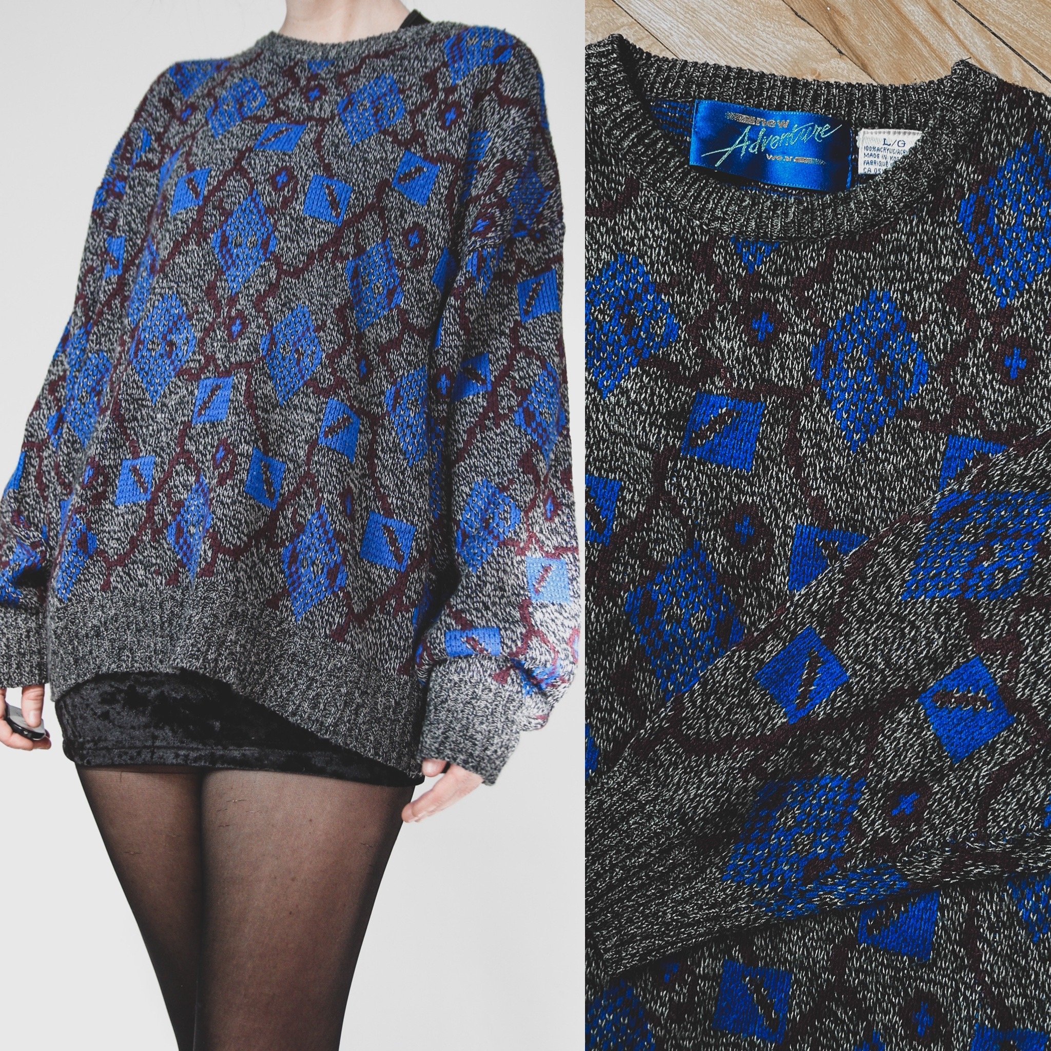 Vintage signature sweater. All Last Rites sweaters are one-of-a-kind unisex finds, straight out of the 70s, 80s and 90s! This one is a chunky geometric knit with a fun 80s geographic print in blue and purple on gray/black. 100% acrylic. May have some itch factor if you're sensitive to knits, but layer up with a thermal or turtleneck underneath and you should be fine! Perfectly broken in, slouchy and cozy. Crew neck, balloon sleeves, boxy cut and easy to tuck in!