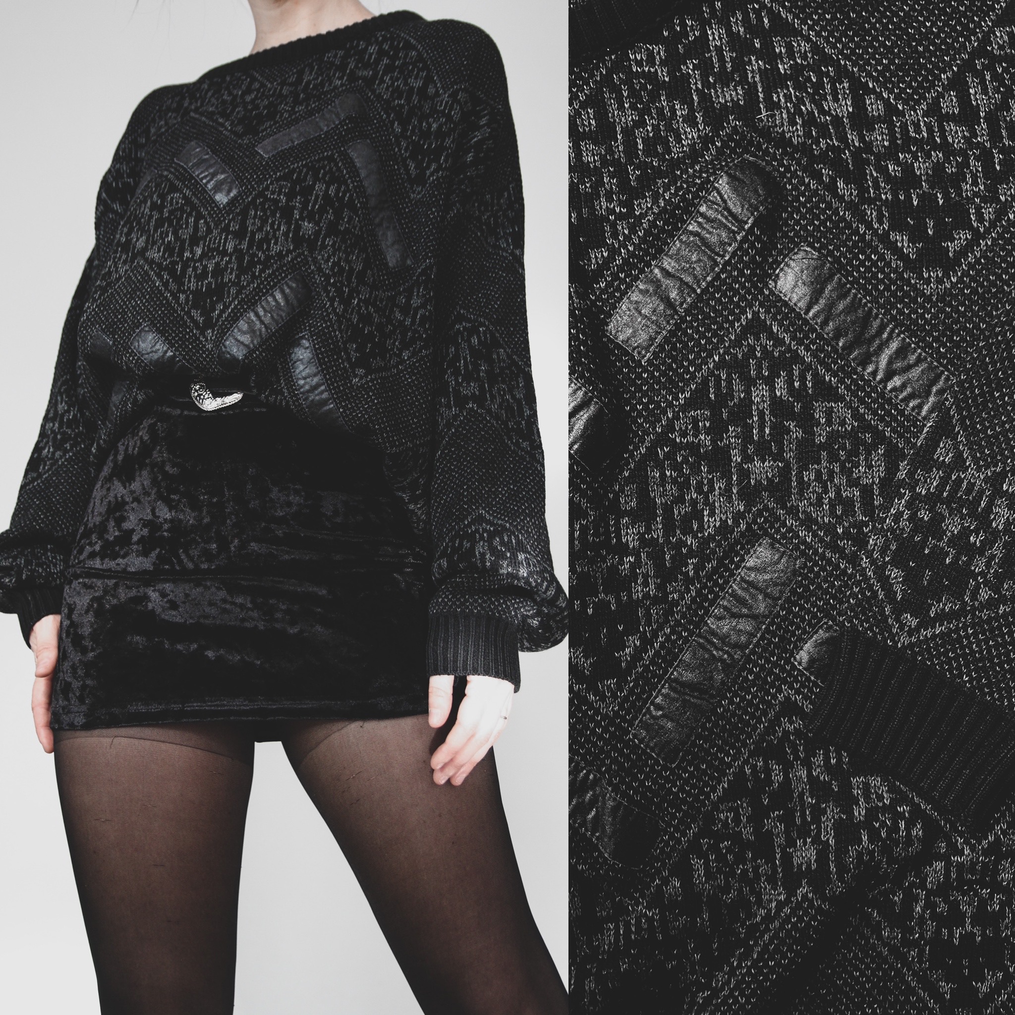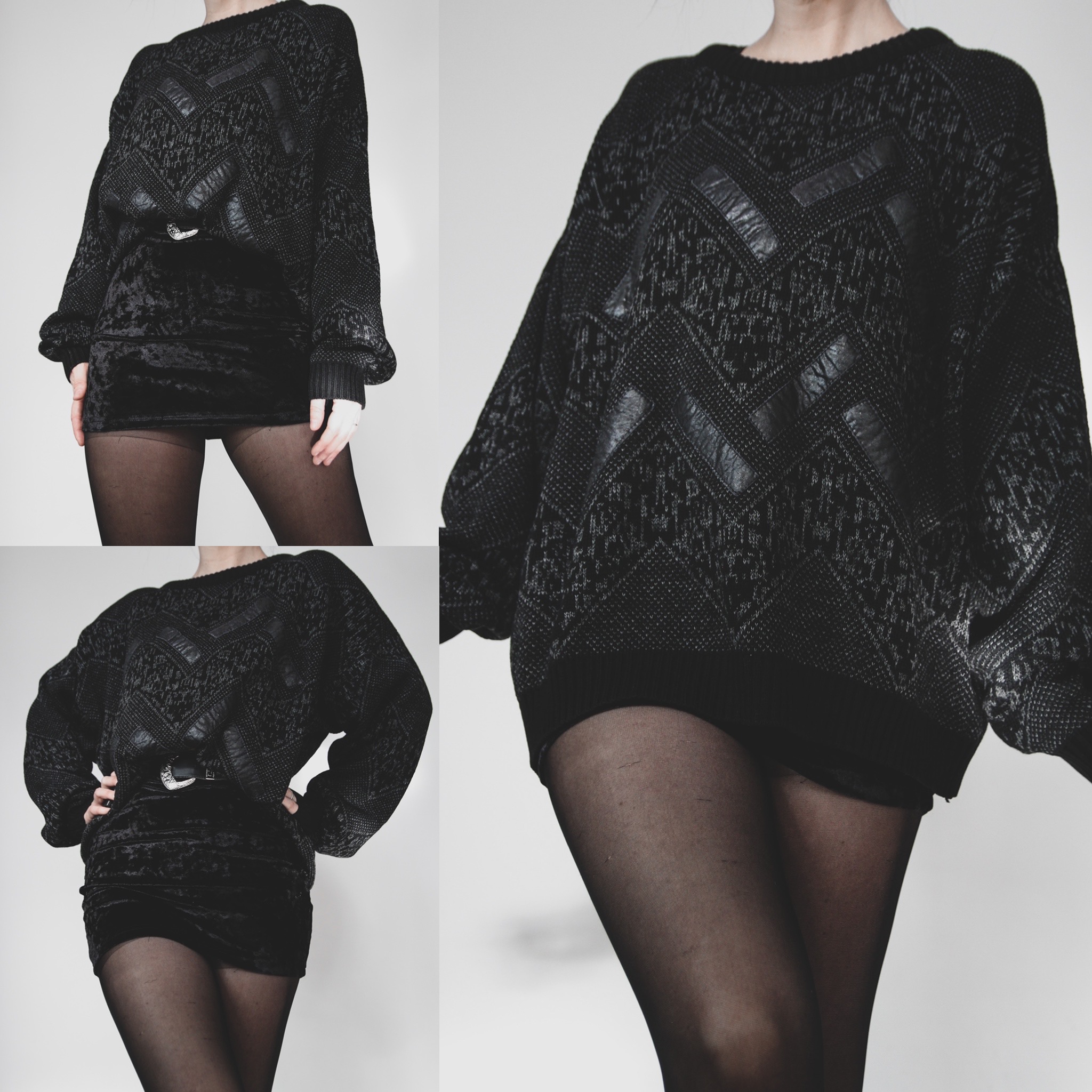 Vintage signature sweater. All Last Rites sweaters are one-of-a-kind unisex finds, straight out of the 70s, 80s and 90s! This one is a chunky knit in dark gray and black, a geometric print and cool 3D faux leather accents on the front. No fabric tag but feels like an acrylic blend. Soft with minimal itch factor - may have some itch if you're very sensitive to knits, but layer up with a thermal or turtleneck underneath and you should be fine! Perfectly broken in, slouchy and cozy. Crew neck, balloon sleeves, boxy cut with a slightly fitted hem for that perfect bubble shape and easy to tuck in!