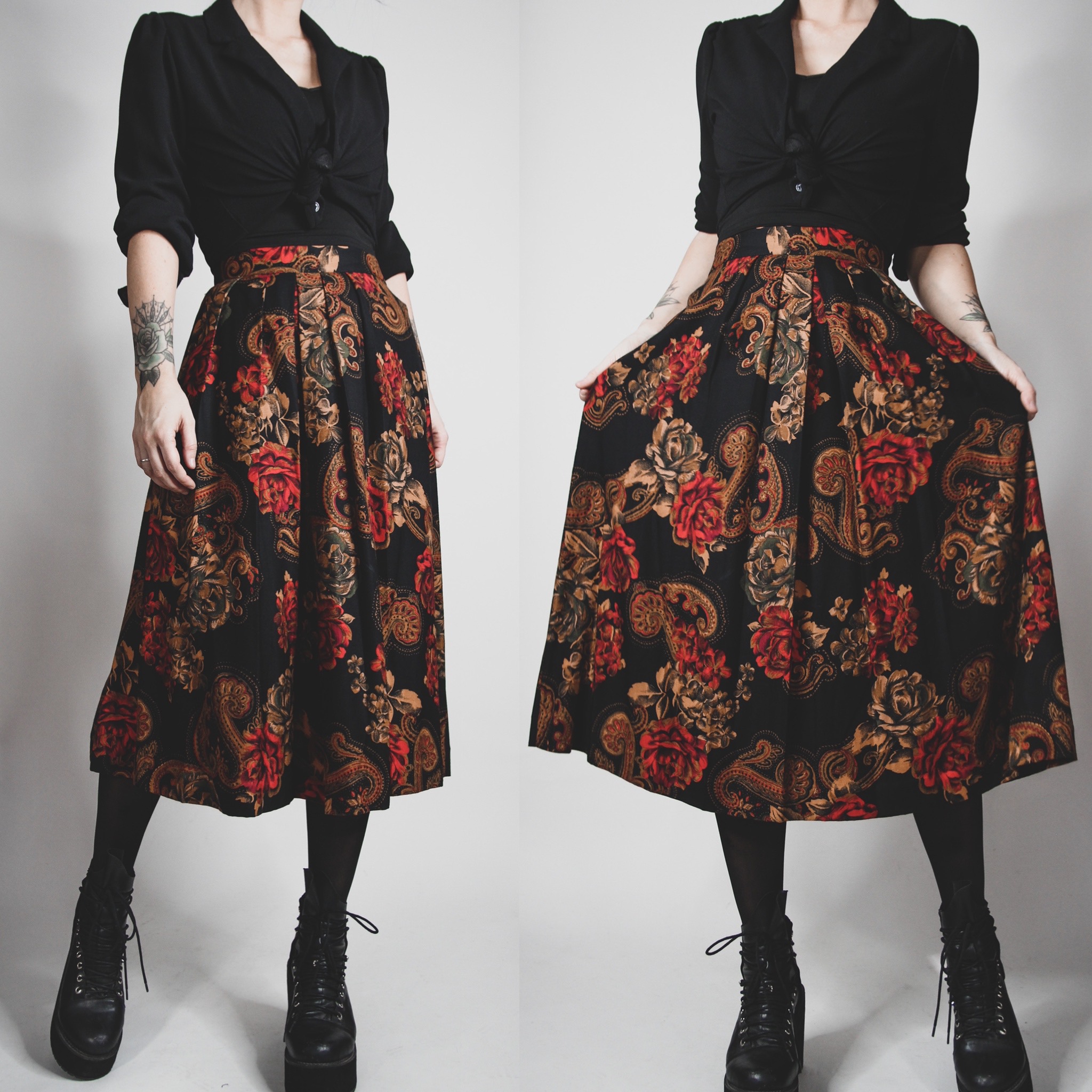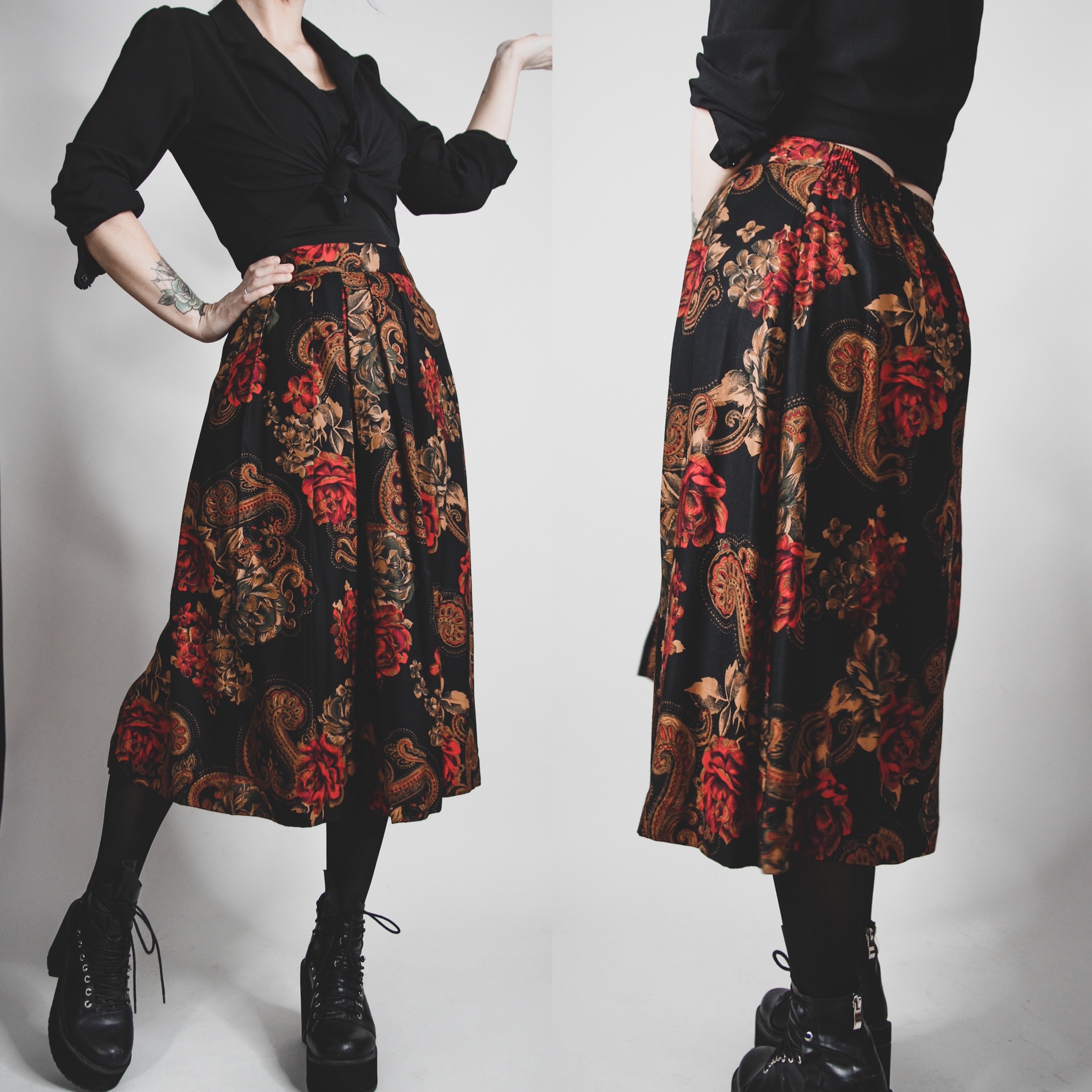 Vintage 90s midi skirt. Gorgeous bold floral paisley pattern on black. 100% viscose, super soft and perfectly broken in. Unlined, pull-on style with a wide ruched elastic waistband - so comfortable!