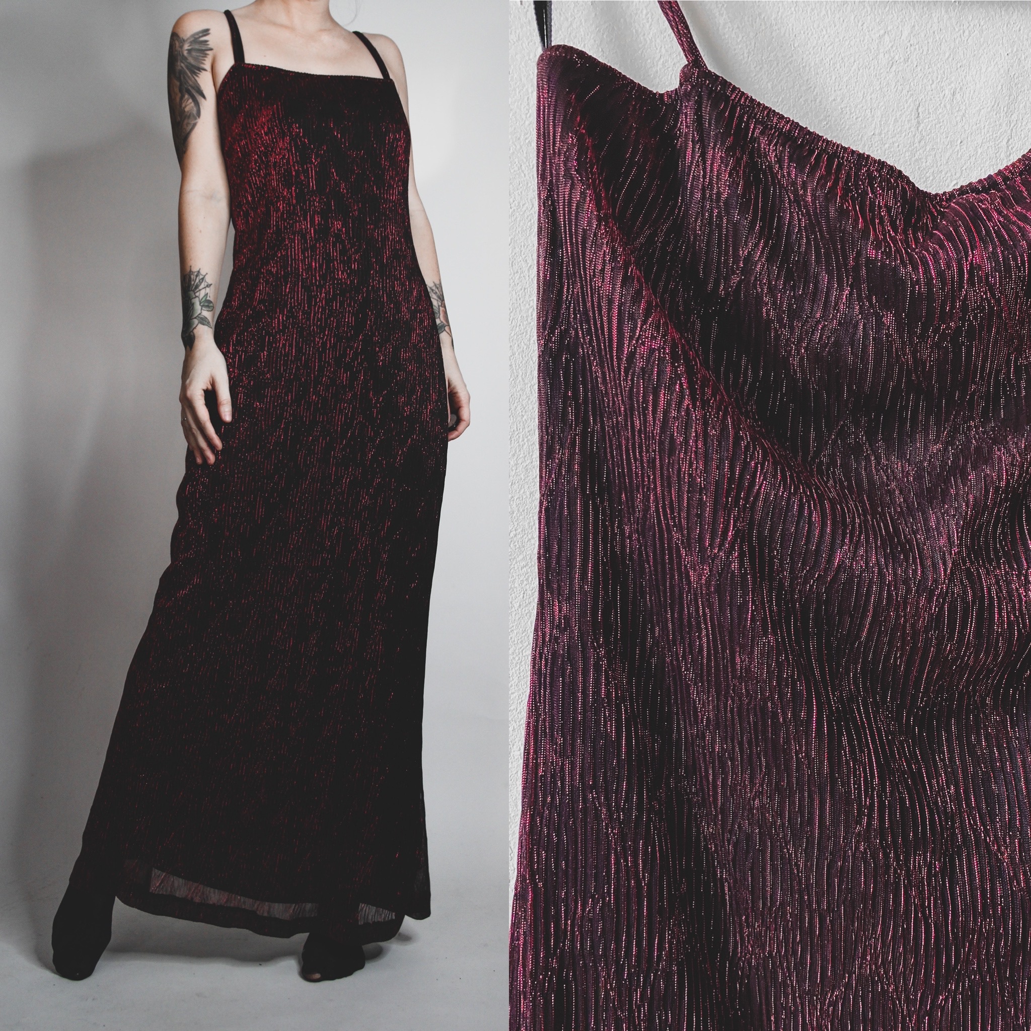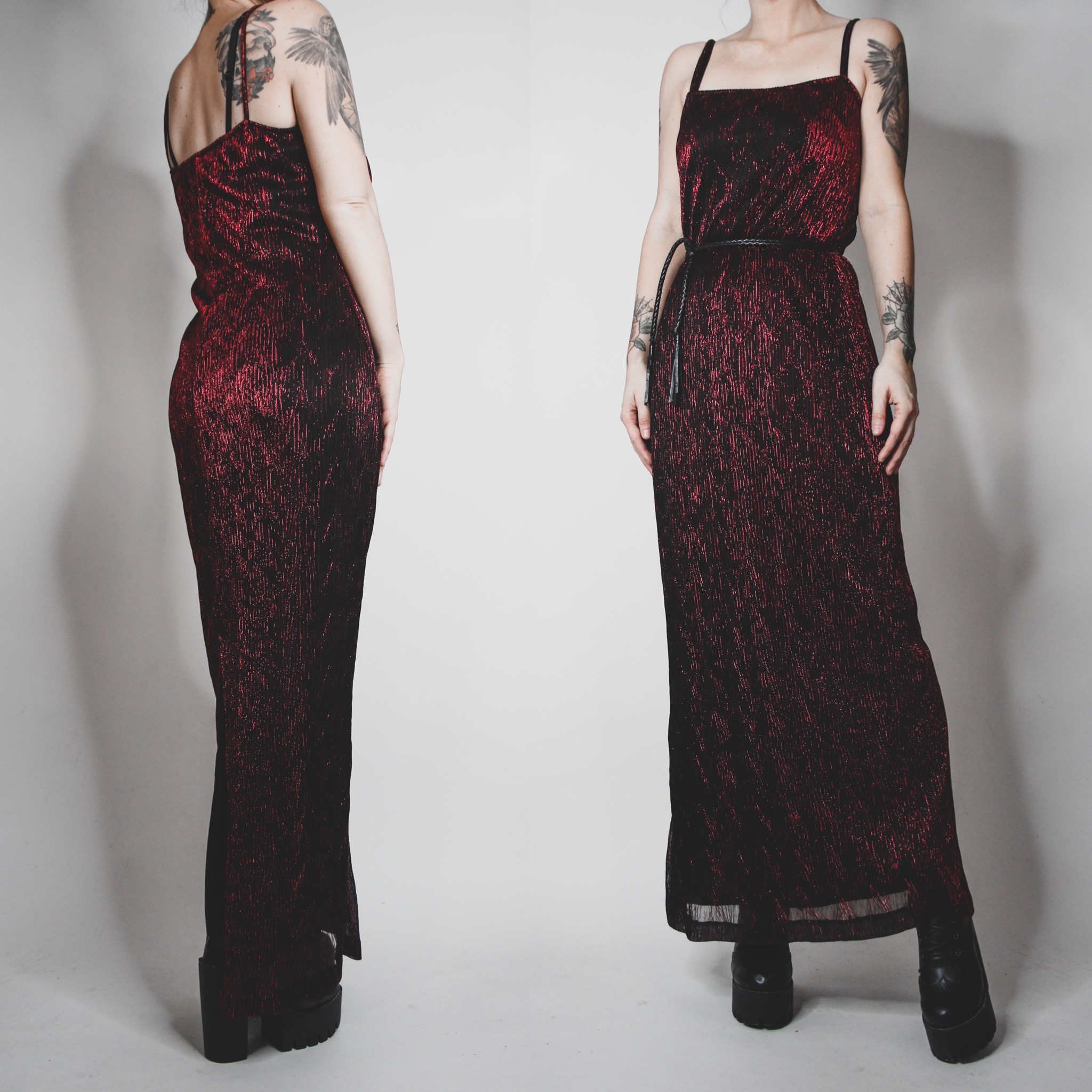 Vintage 90s Garage metallic red gown. Scream Queen at prom realness! Fully lined in black with an outer layer of textured metallic red. Straight cut bust with thin straps. Stretchy all over with elasticized trim. Pull on style. Perfect for fancy holiday events!