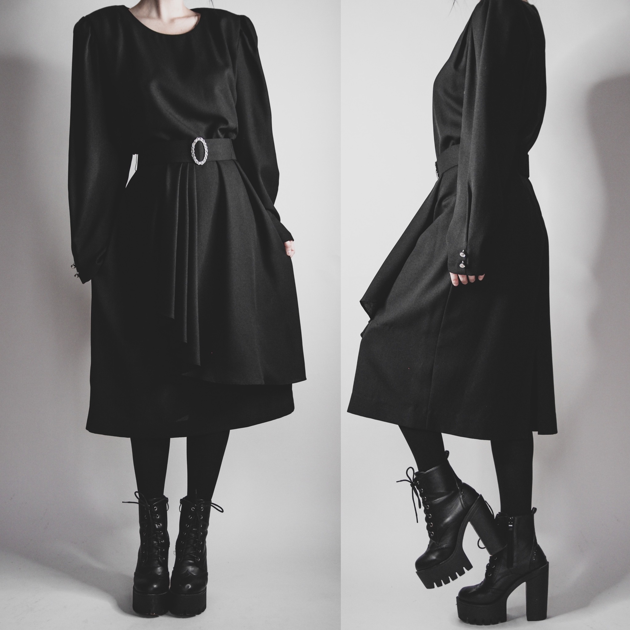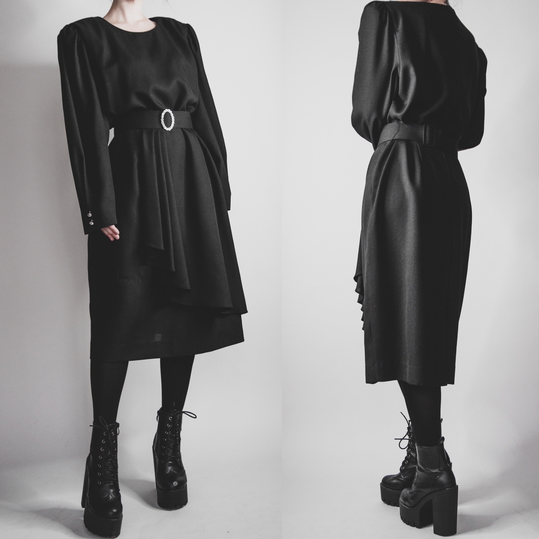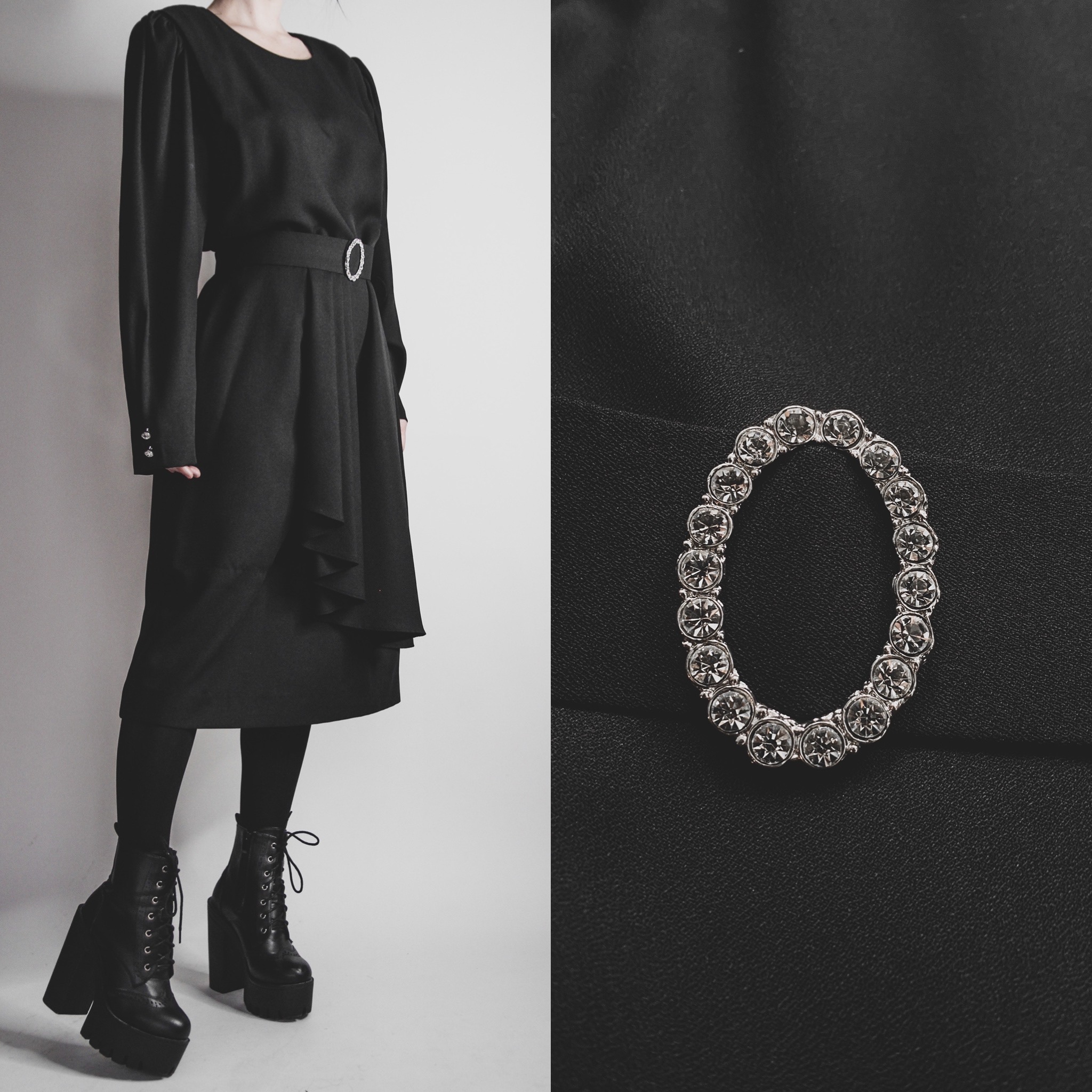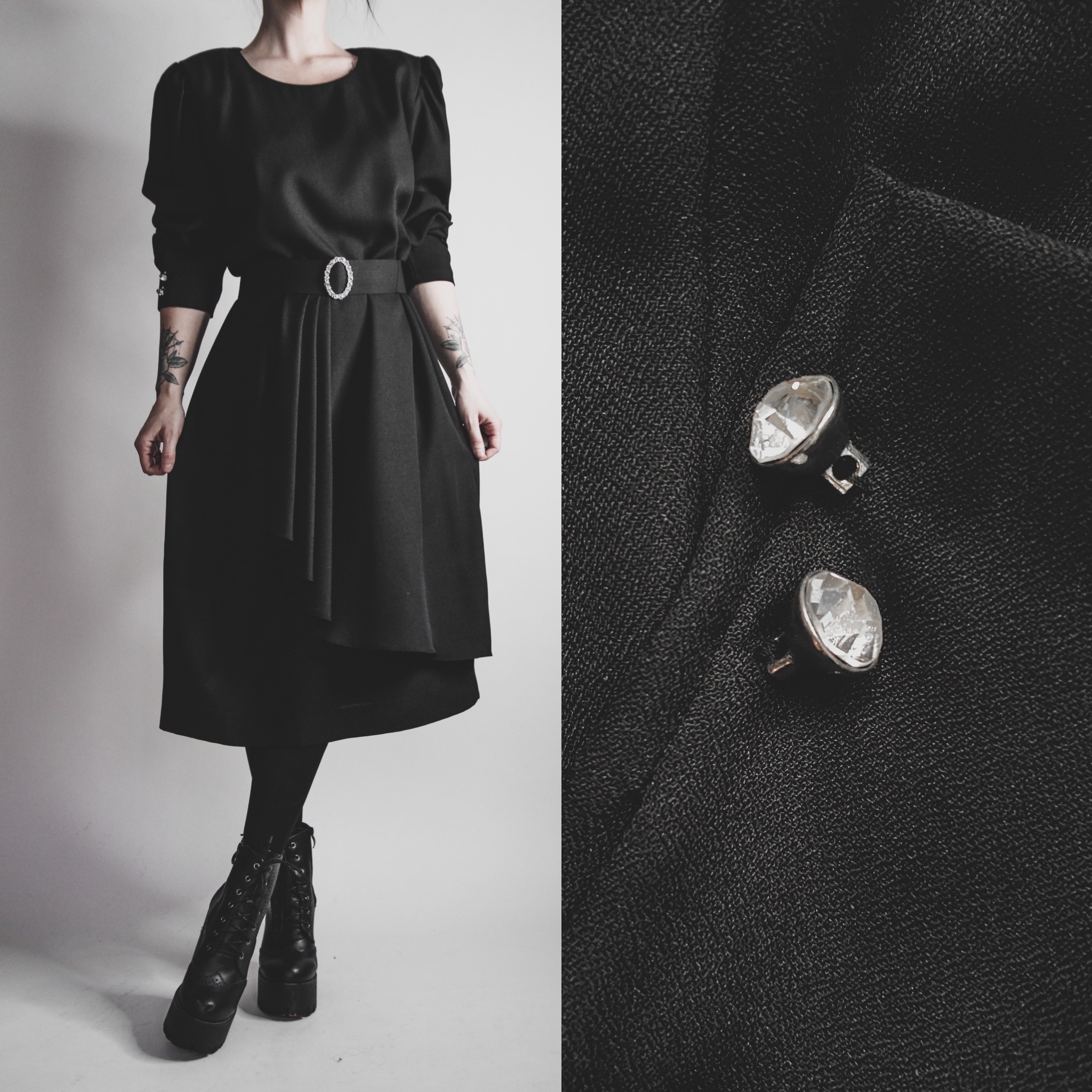 Vintage 80s/ early 90s Algo Boutique cocktail dress. Such a stunner, perfect for holiday events! Back zip, pencil cut with a nipped waist and straight sleeves, waterfall panel detail on the skirt. Removable belt with a black square buckle and sparkly rhinestone faux buckle detail (the square one is for closure but the rhinestone accent is removable). Puffed shoulder detail and oversize non-functional diamante buttons on the cuffs. Original oversize shoulder pads intact but can be easily removed if they're not your thing. Lightweight polyester, no stretch whatsoever, meant to drape loosely. Lined in a soft poly satin.