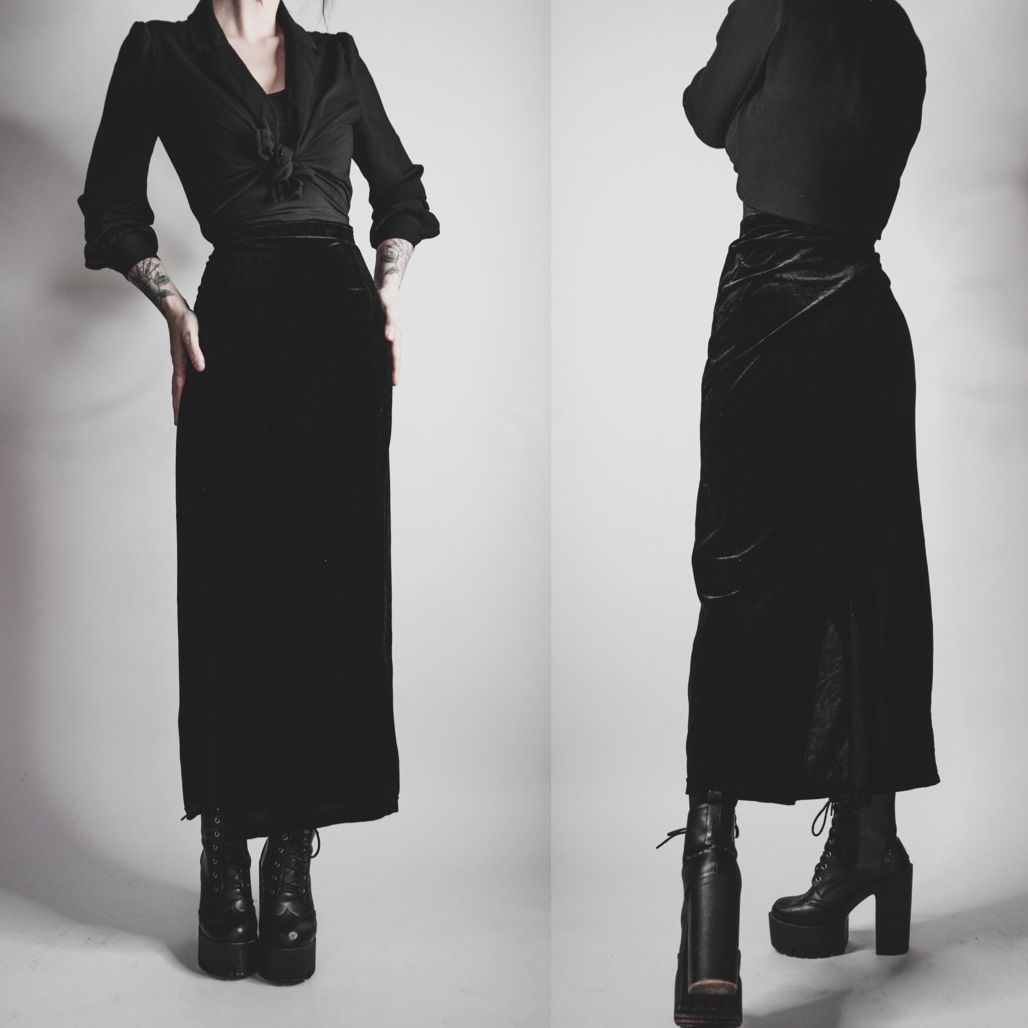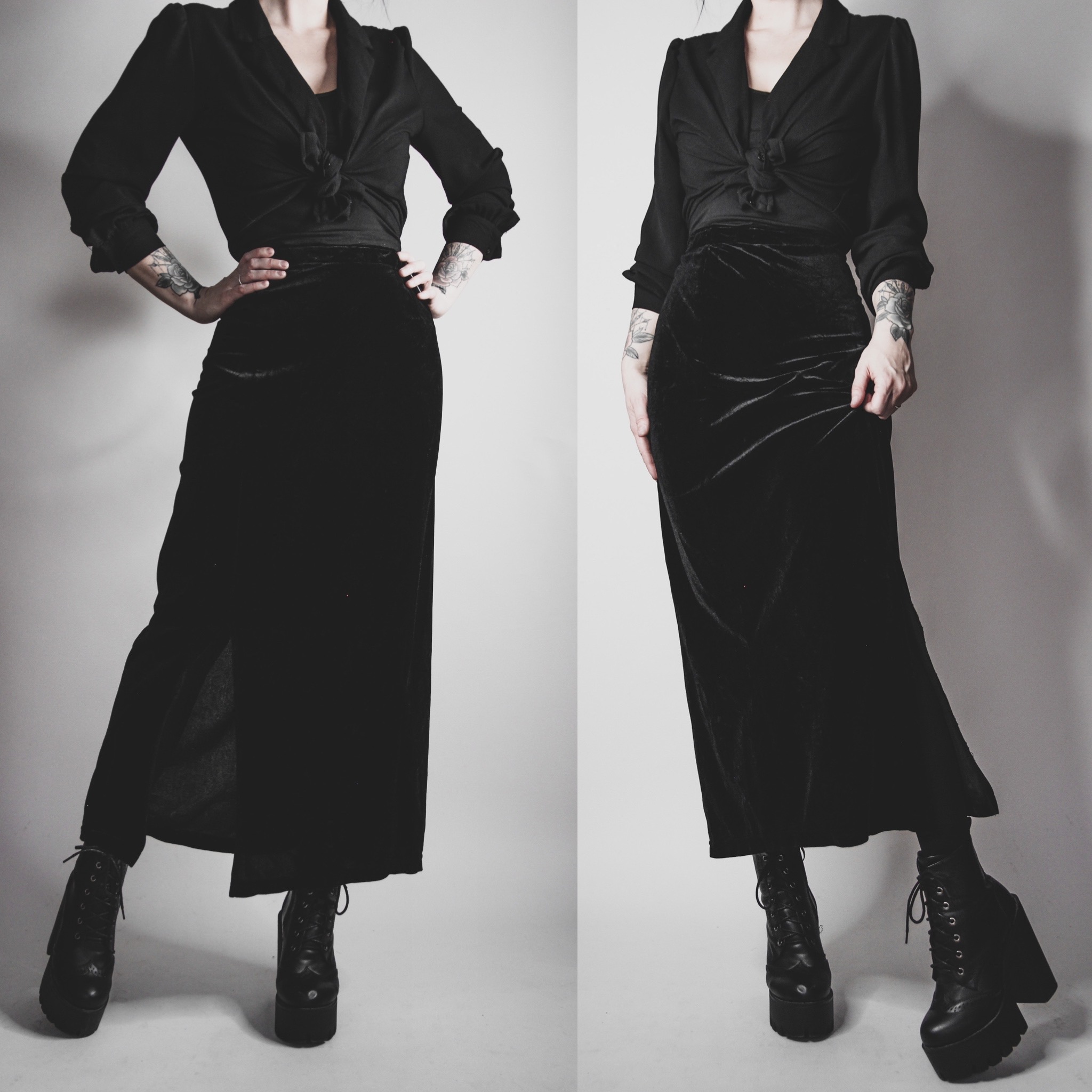 Classic black velvet maxi skirt. No tags, most likely modern but could be vintage. Stretchy all over with an elastic waistband, meant to be worn high waisted. Unlined, pull on style. Straight cut with a high side slit. Listed at a discount as fabric shows some creasing due to age, gives it a textured effect but does not affect wear.