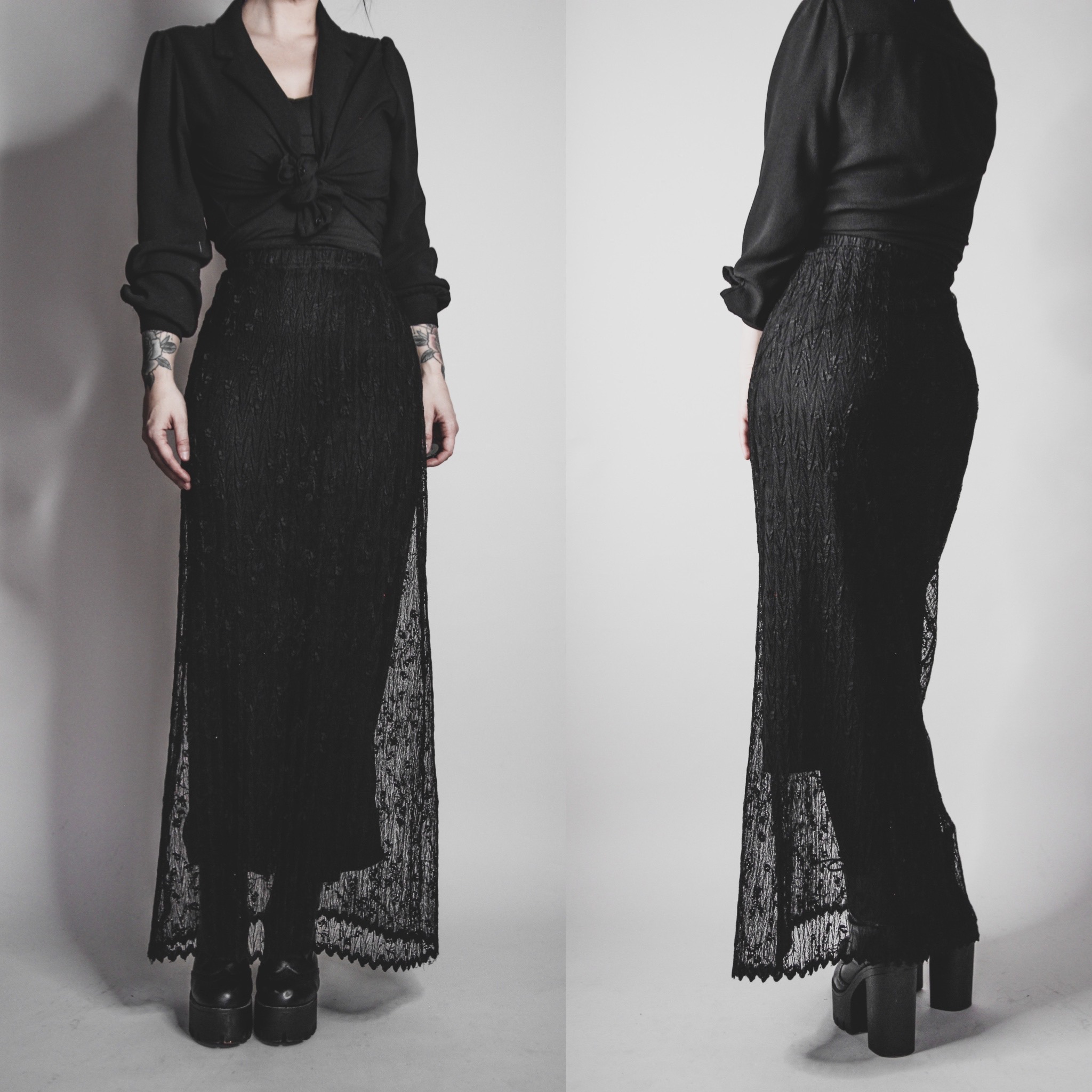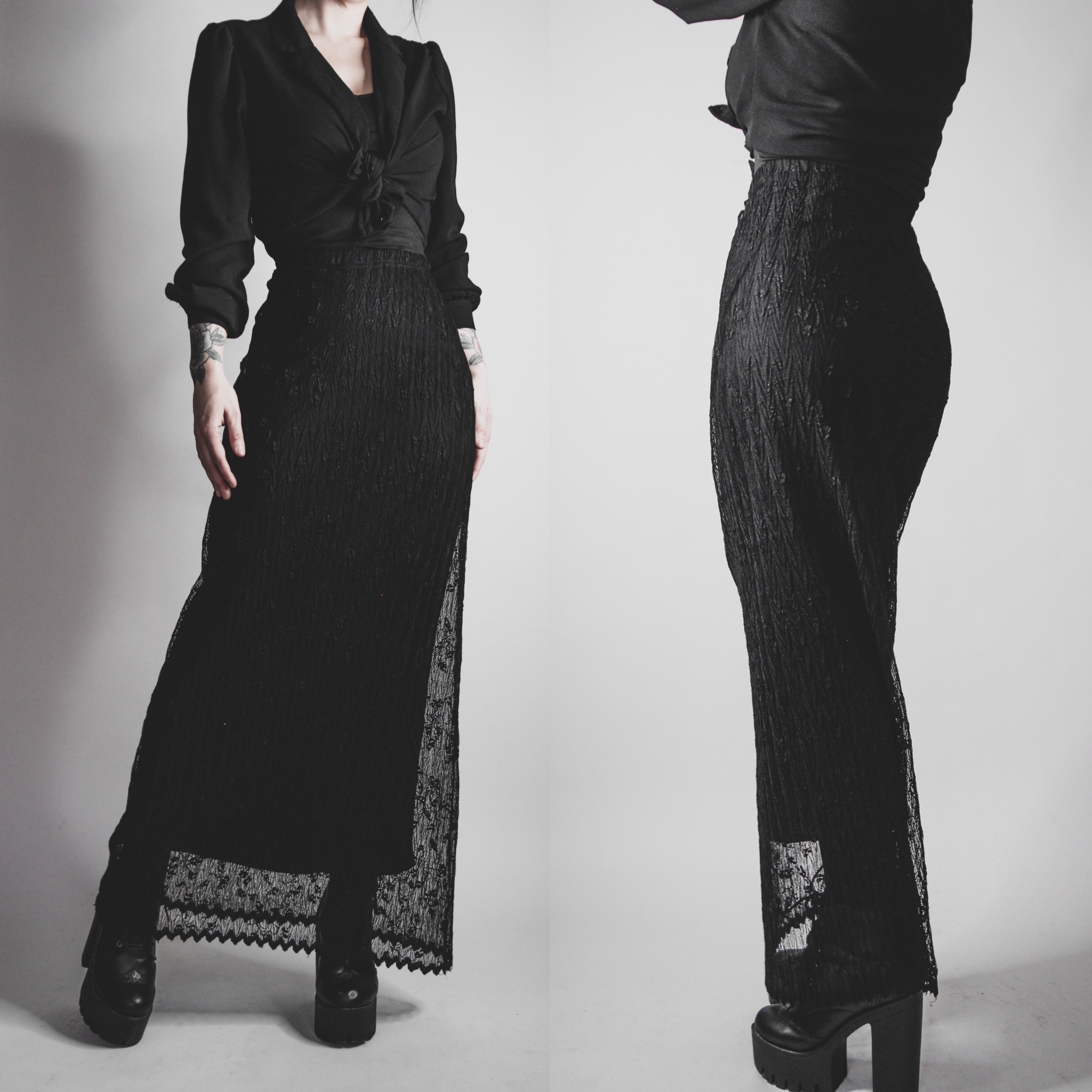 Vintage 90s black lace overlay skirt. Fully lined in slightly shorter black poly satin, beautiful mesh lace on top. Ruched elastic waistband. Has a bit of stretch all over. Meant to be worn high waited. Pull on style.