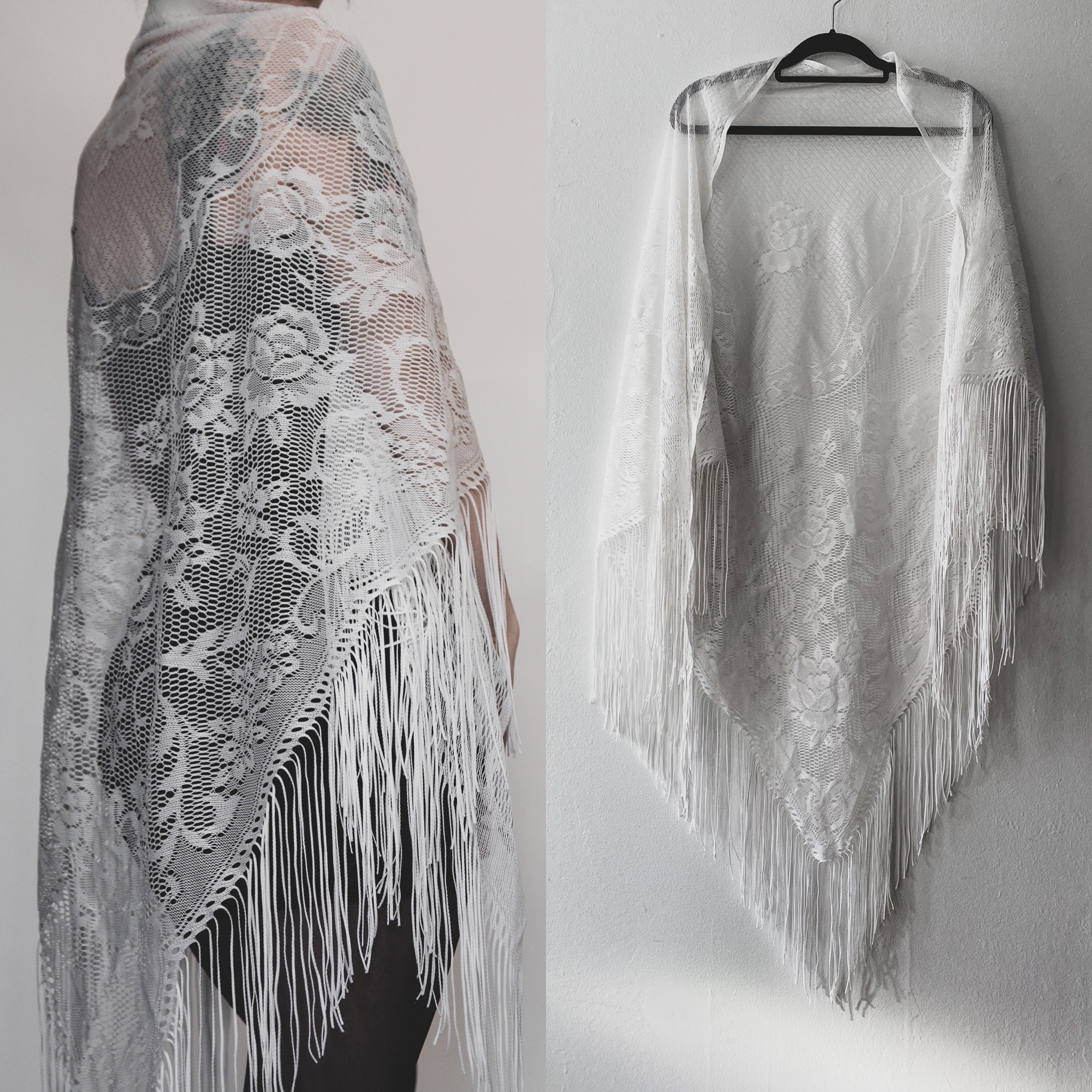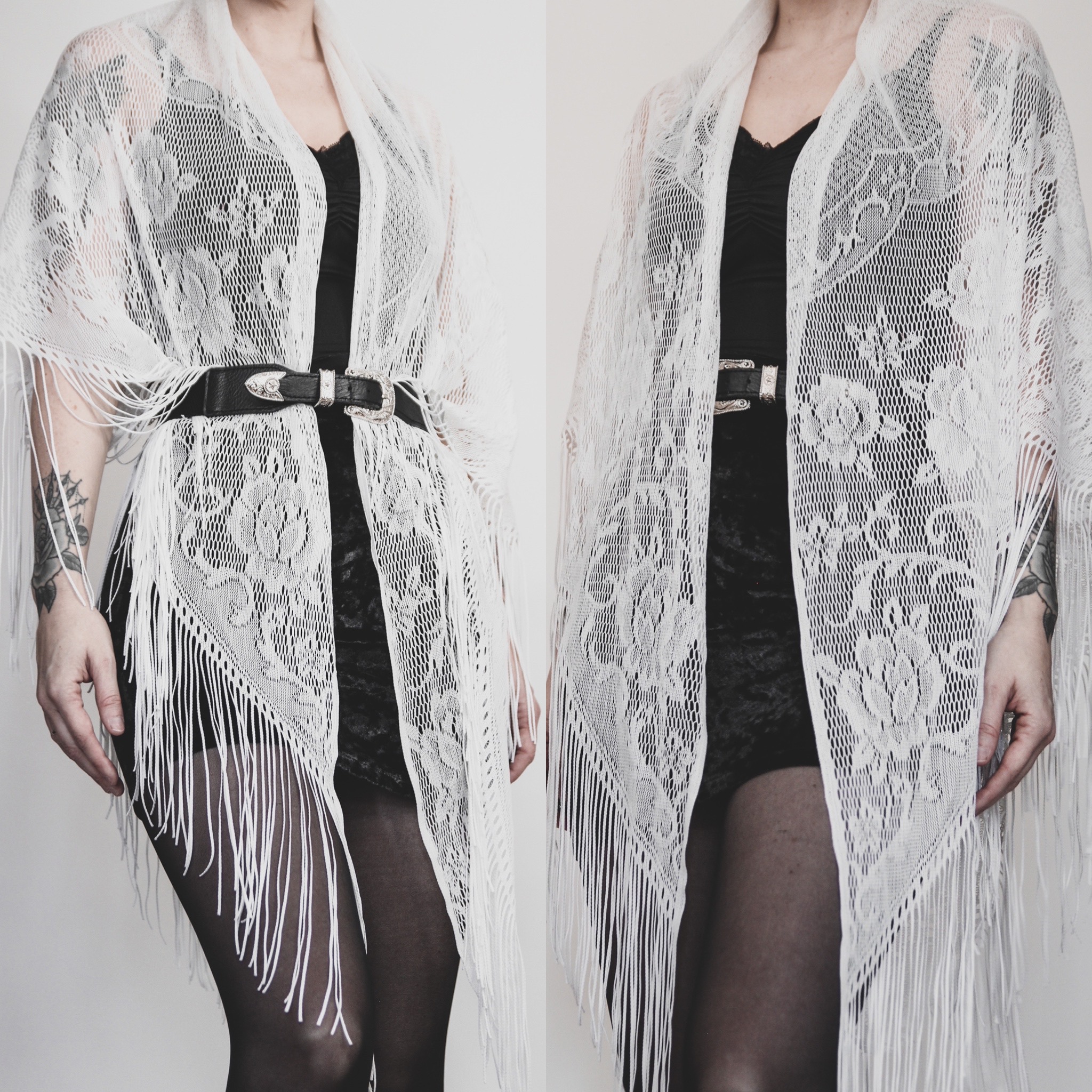 Vintage white lace fringed shawl. This is a Last Rites signature piece in a XXL oversize style for extra drama. All Last Rites signature shawls are one of a kind with unique colors, patterns and lace! No two are alike. This one is triangular in true snow white with beautiful floral lace and long delicate fringe on two sides.