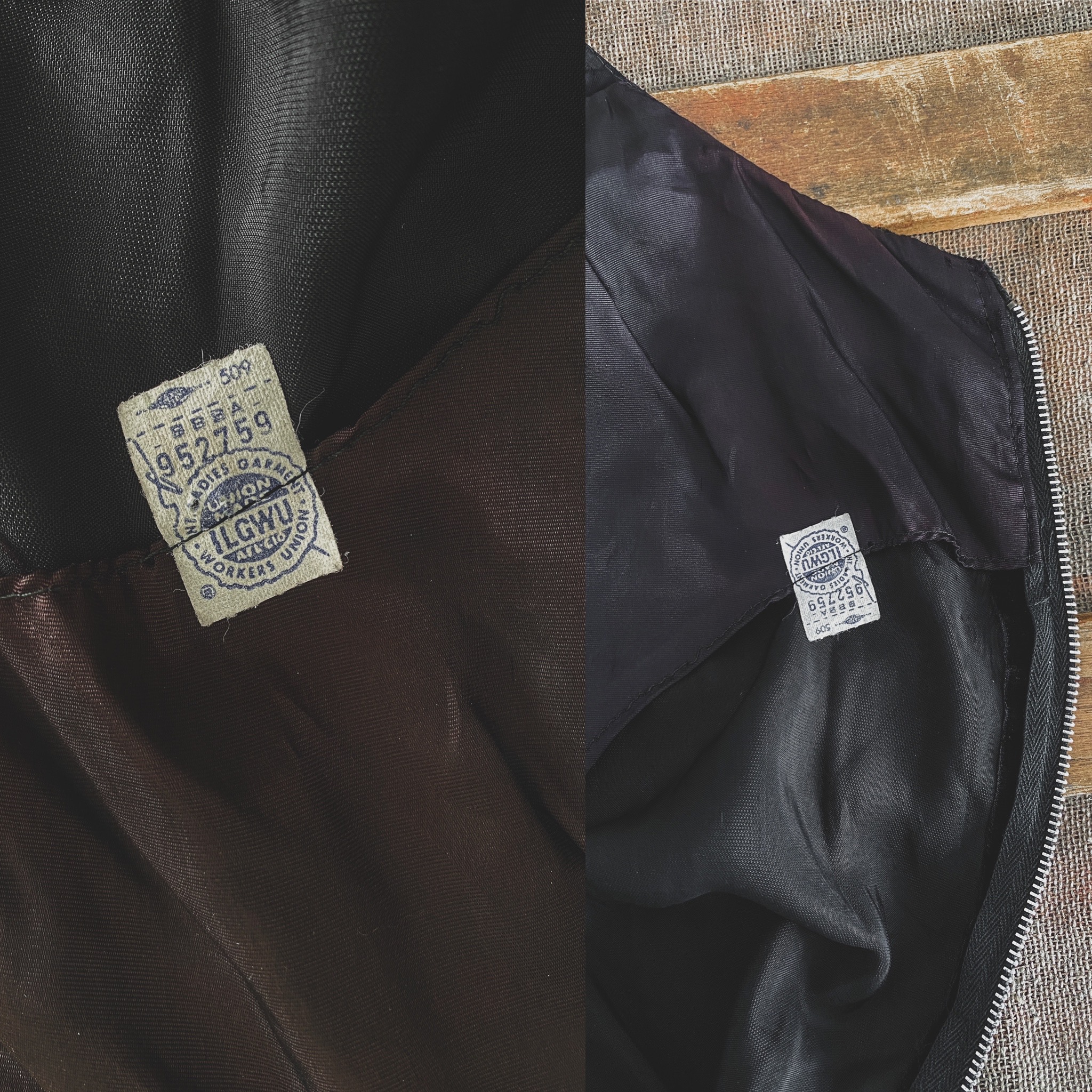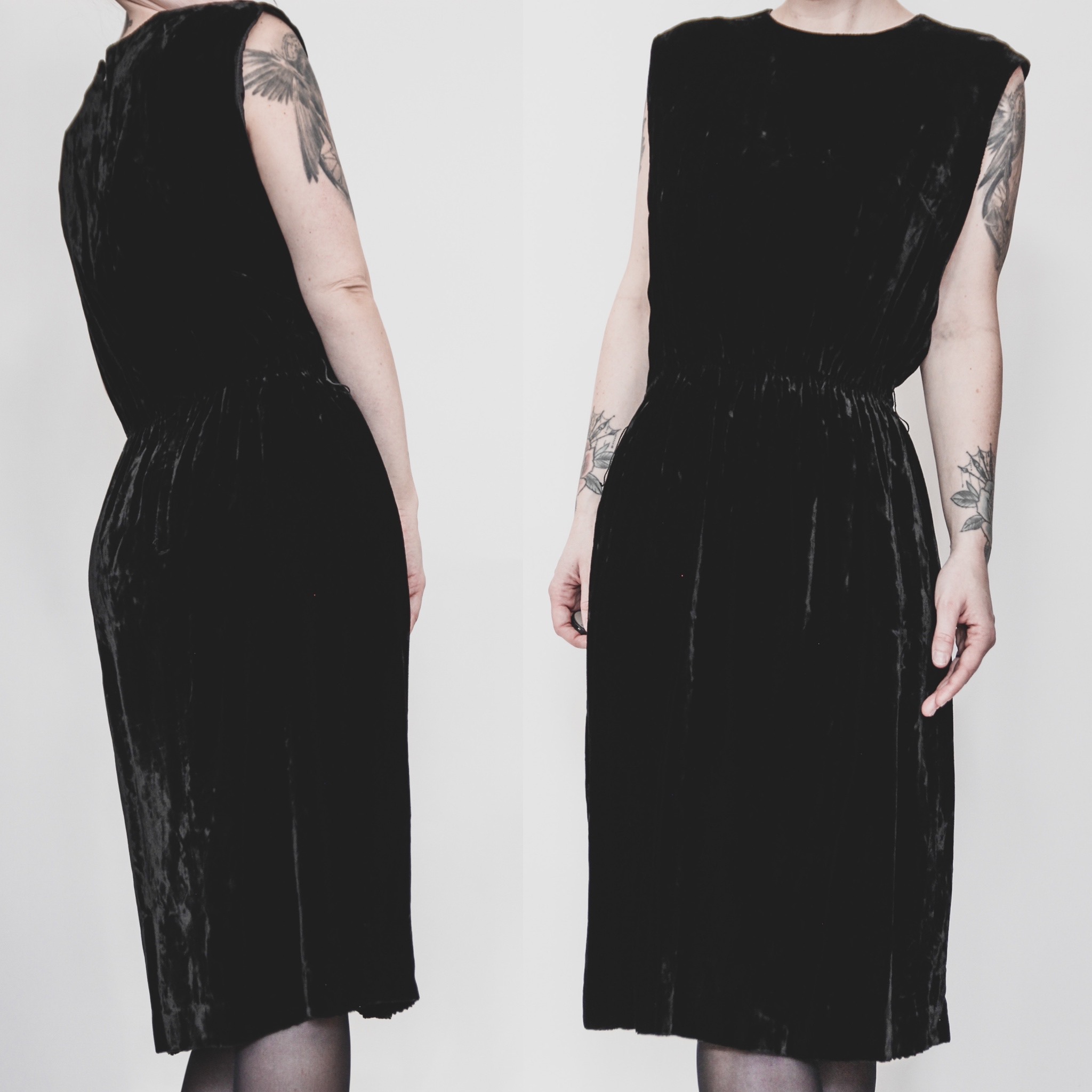 Vintage union-made cocktail dress. ILGWU union tag style dates it between April 1964 and 1973, metal back zipper puts it most likely before 1970. Textured crushed black velvet. Minor discoloration on the lining under the arms and at the back, no outer imperfections. Elastic waist, no stretch other than the waist.