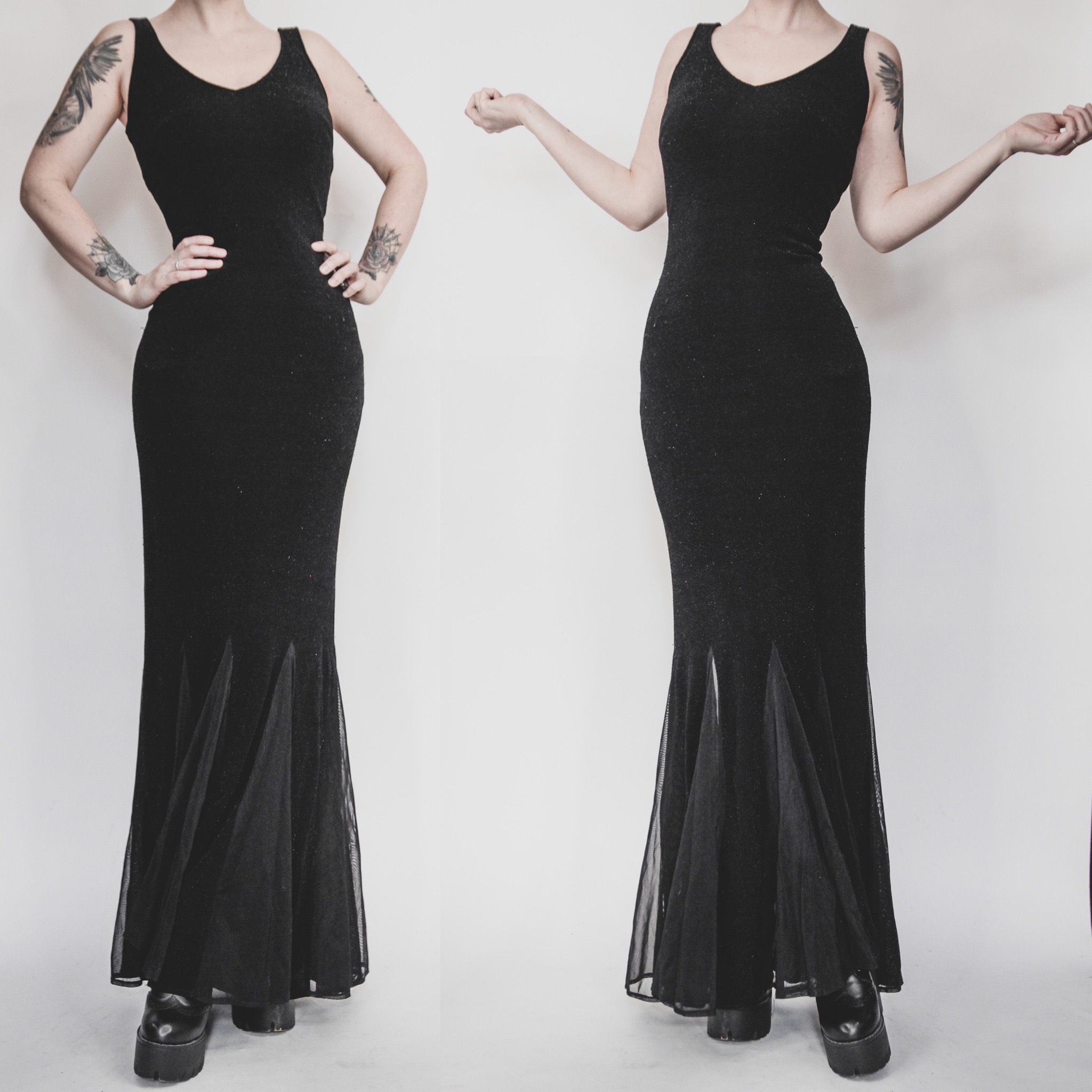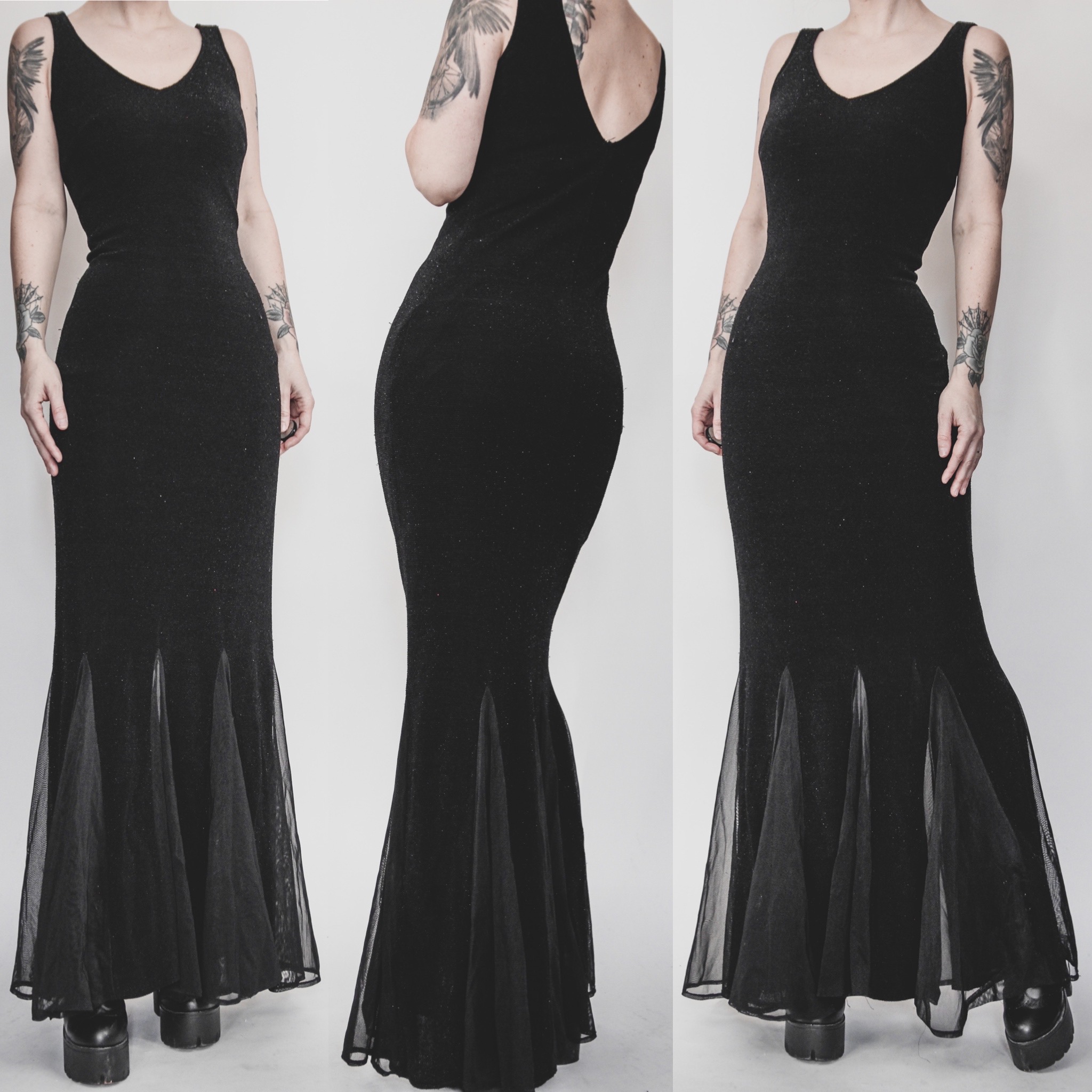 Vintage 80s/90s Algo glitter mermaid gown. V-neck and back, sleeveless fitted bodycon cut with sheer mesh inset skirt that flares out from the knee down. Hugs your curves! Glam villlainess vibes, the perfect subtle statement gown for fancy events. Nylon/metallic/spandex blend - has a bit of stretch all over. Fully lined in a separate layer of nylon satin. Pull-on style.