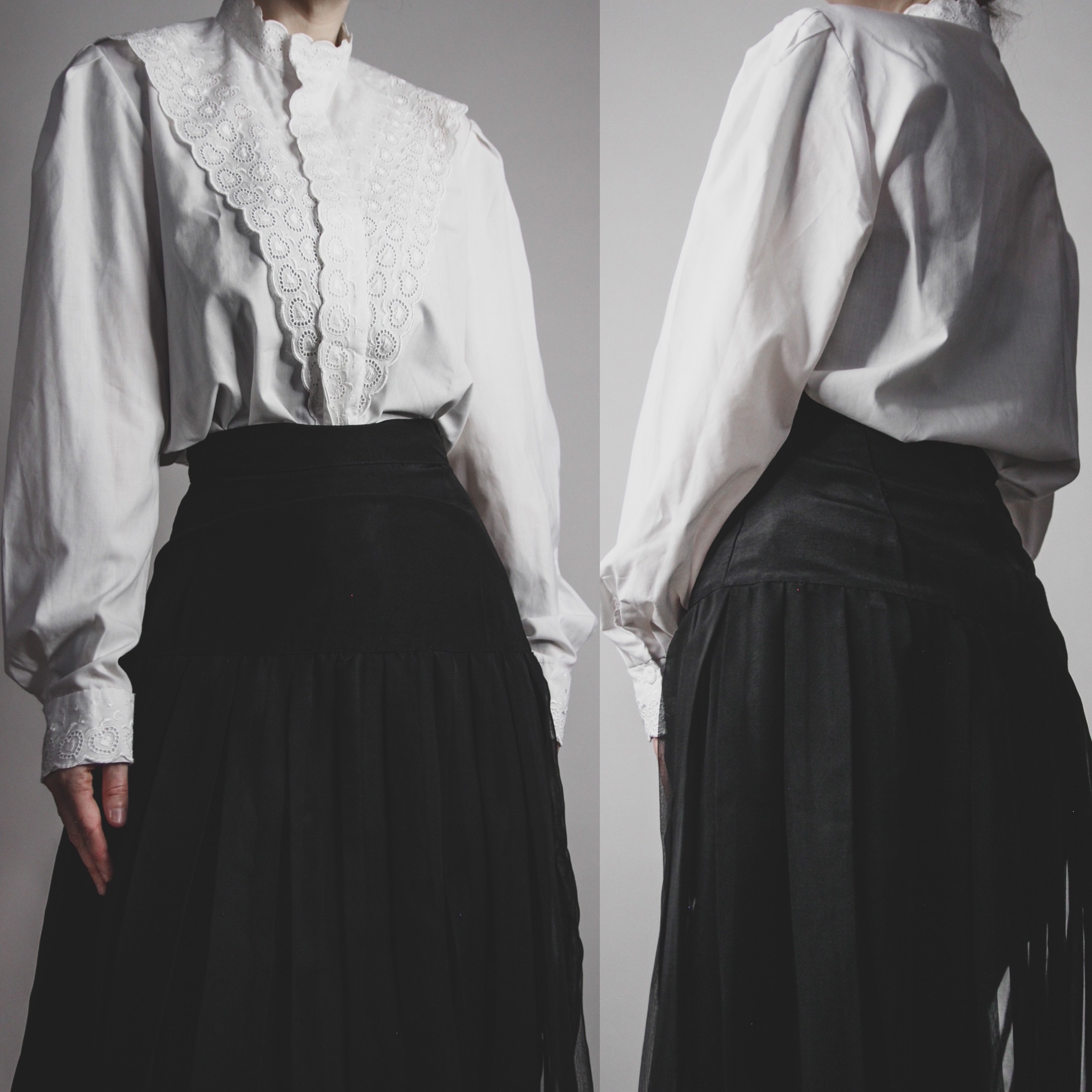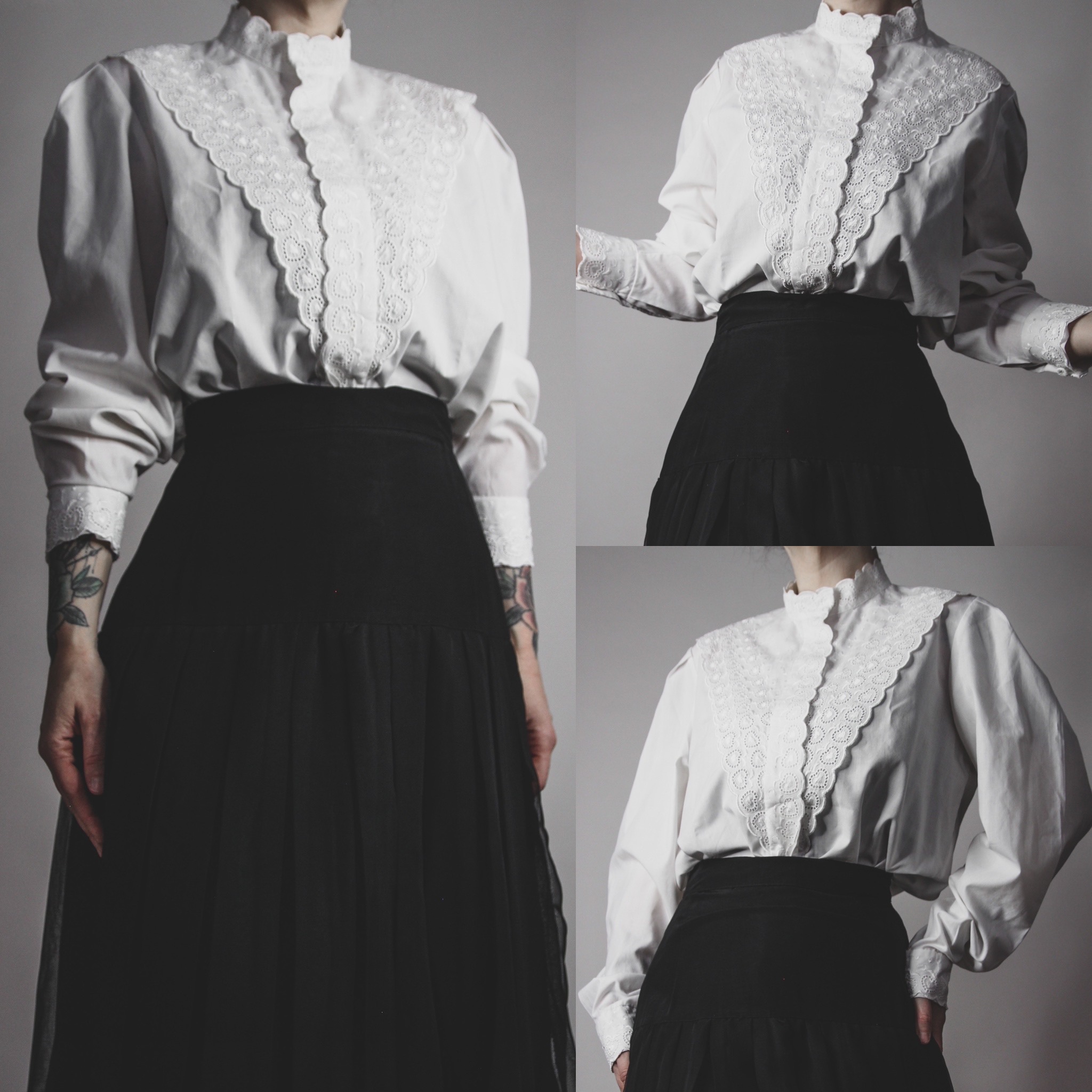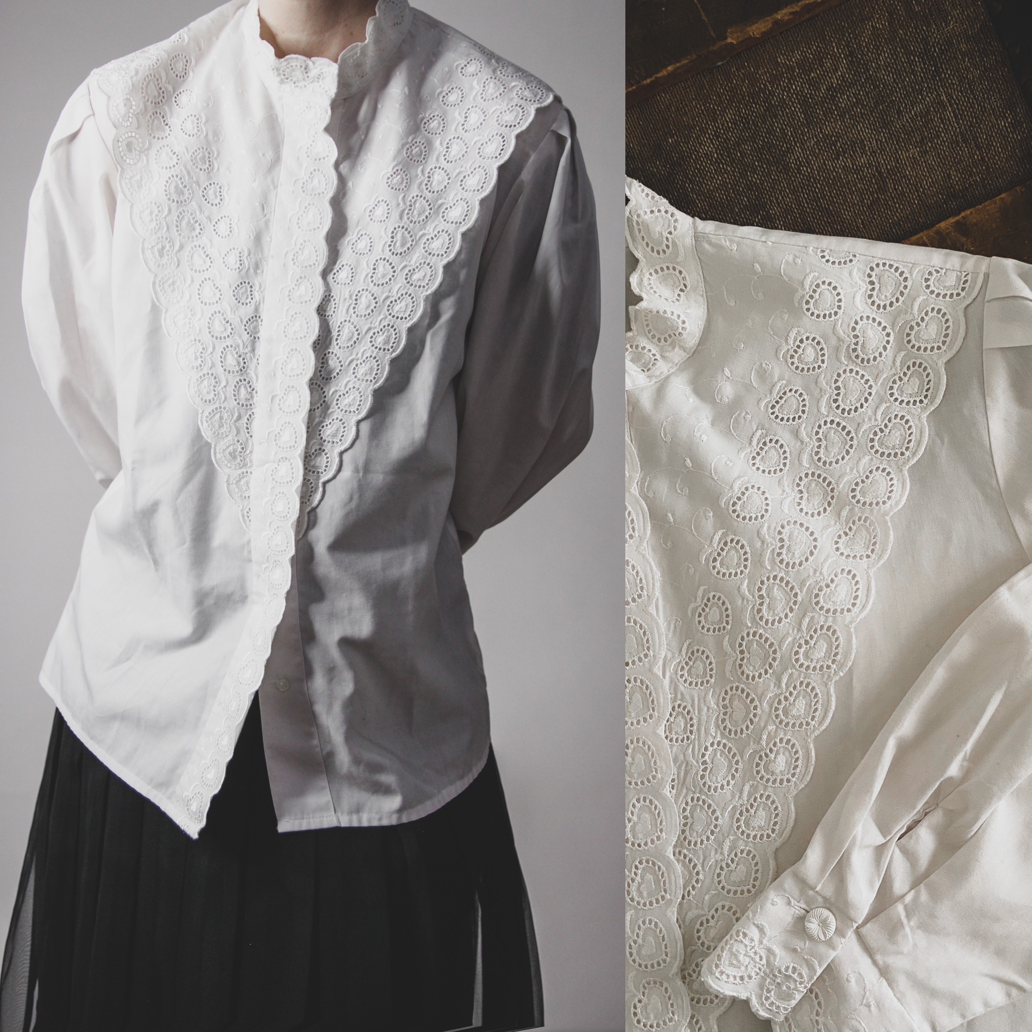 Vintage 80s Coranit white blouse. Gorgeous heart motif embroidered detailing, bib front and high collar with scalloped trim. Puffed shoulders, balloon sleeves with buttoned cuffs, and a boxy cut. Unlined, no stretch whatsoever. 65-35 poly-cotton blend. Comes with extra buttons. 80s meets 1800s vibes!