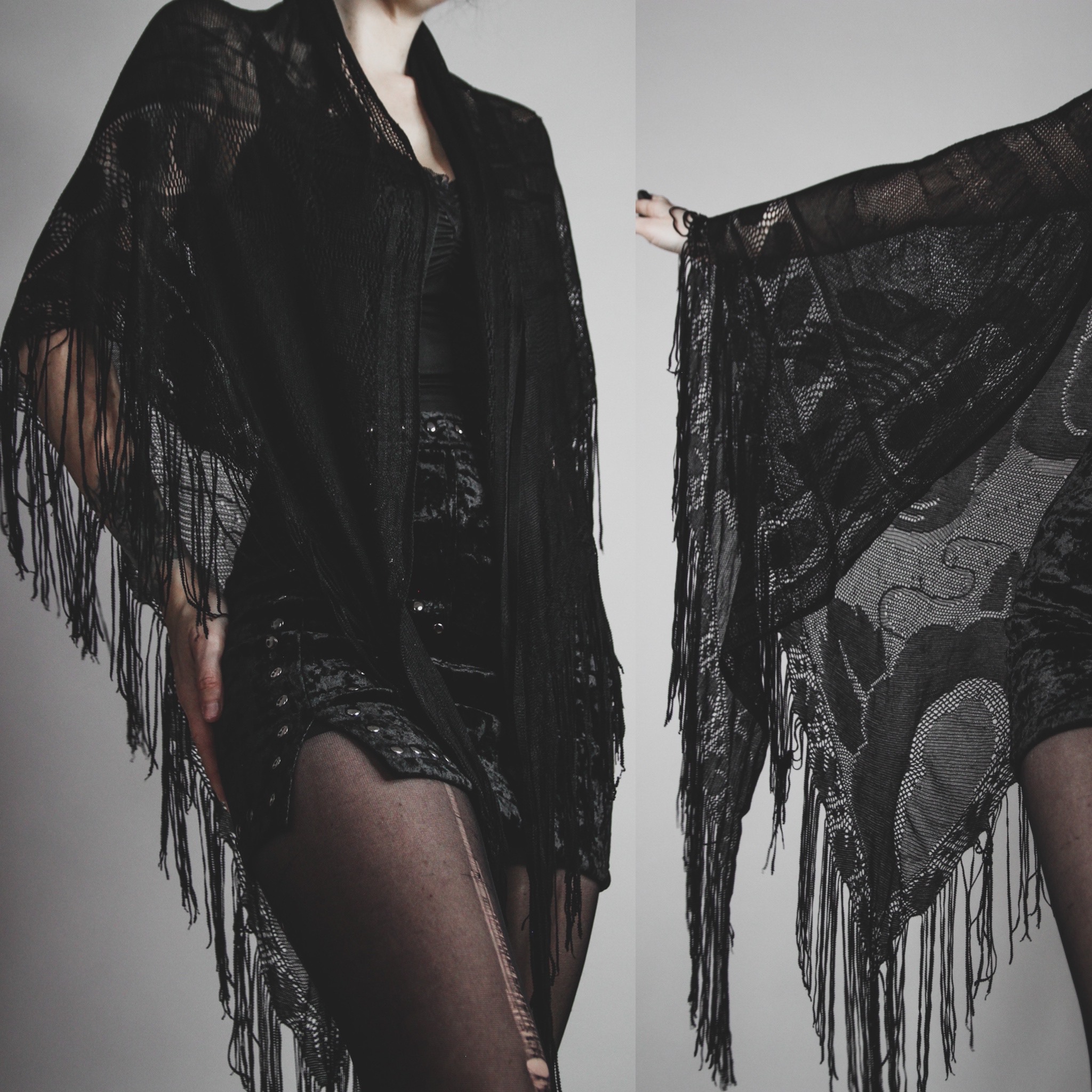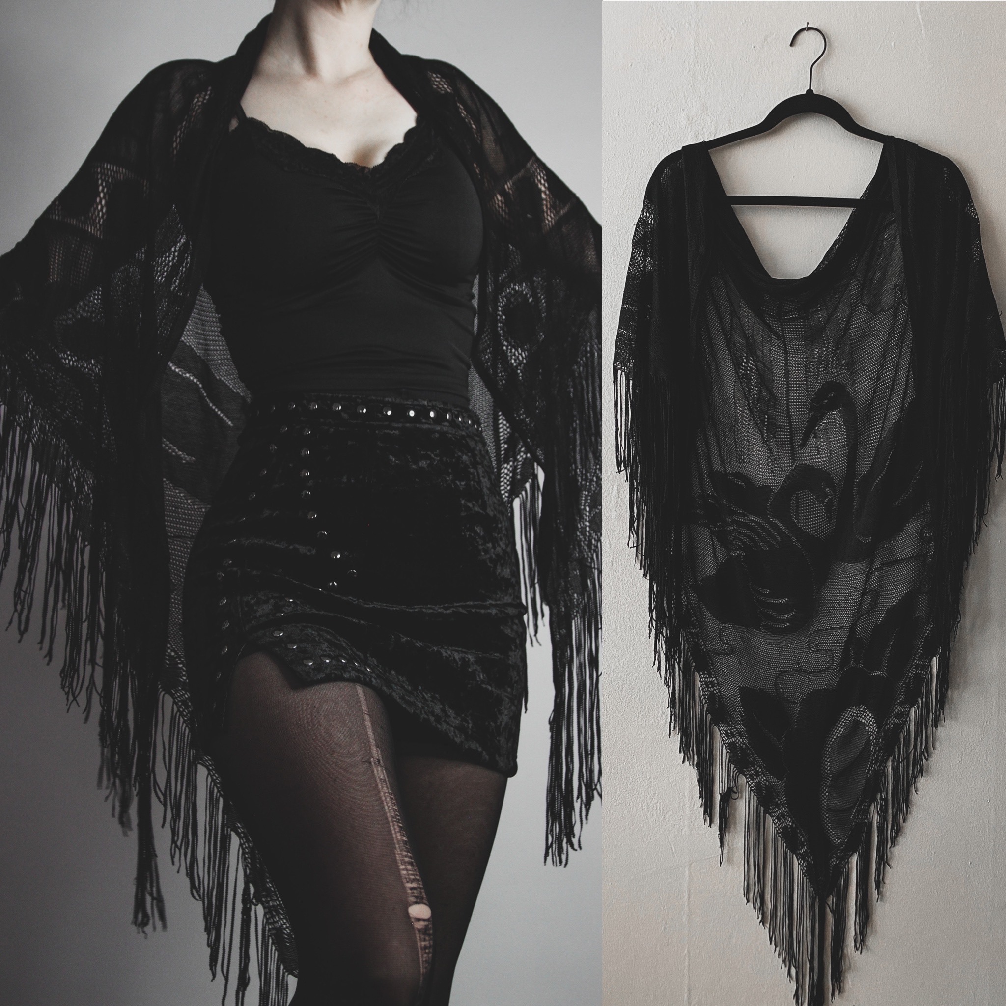Vintage black lace fringed shawl. This is a Last Rites signature piece in a XXL oversize style for extra drama. All Last Rites signature shawls are one of a kind with unique colors, patterns and lace! No two are alike. This one is triangular with a swan motif and long fringe on two sides. Fabric is very lightweight and delicate.