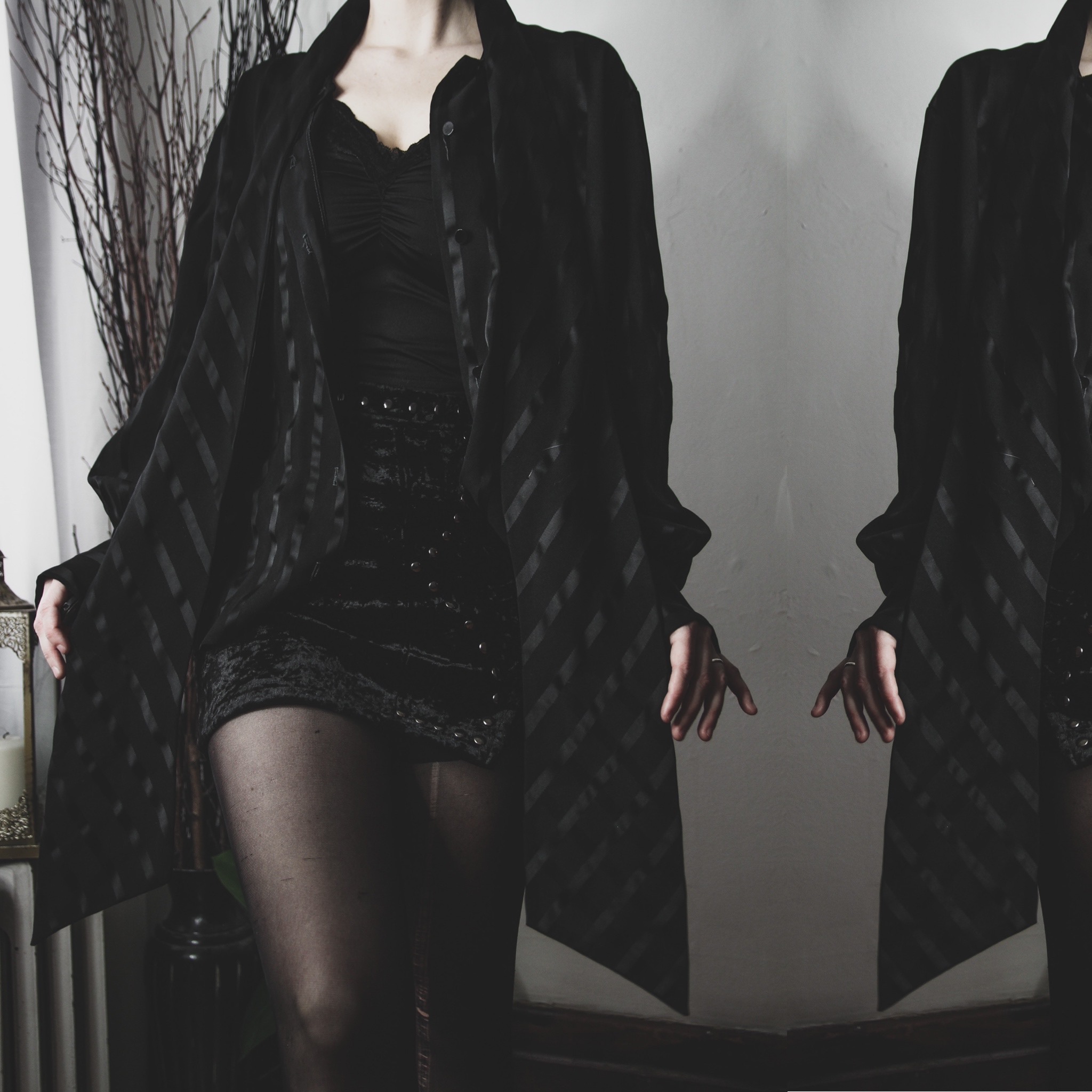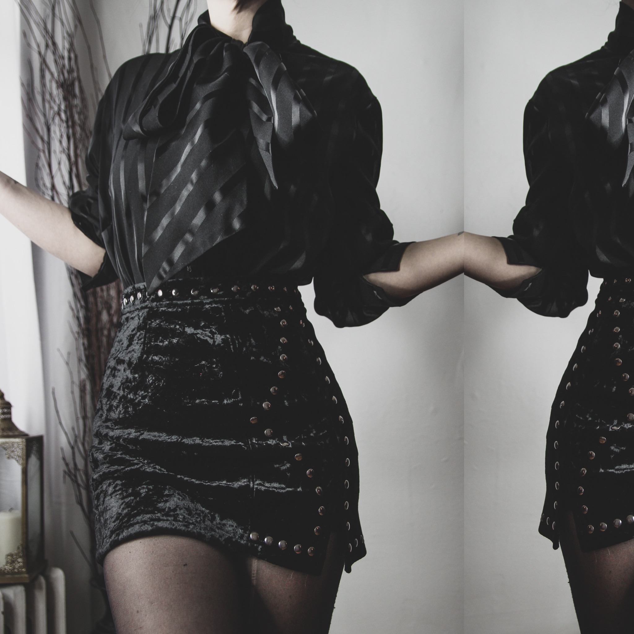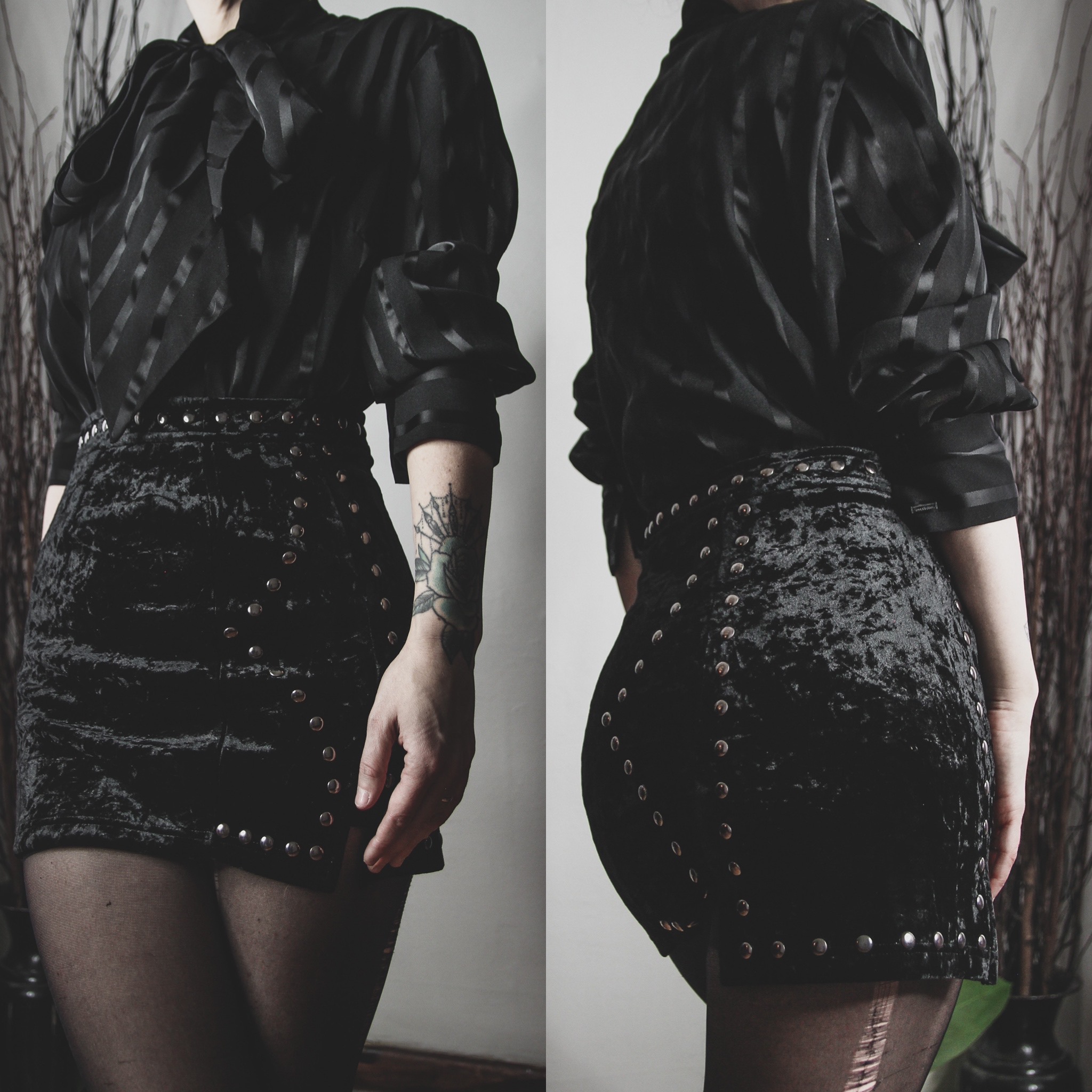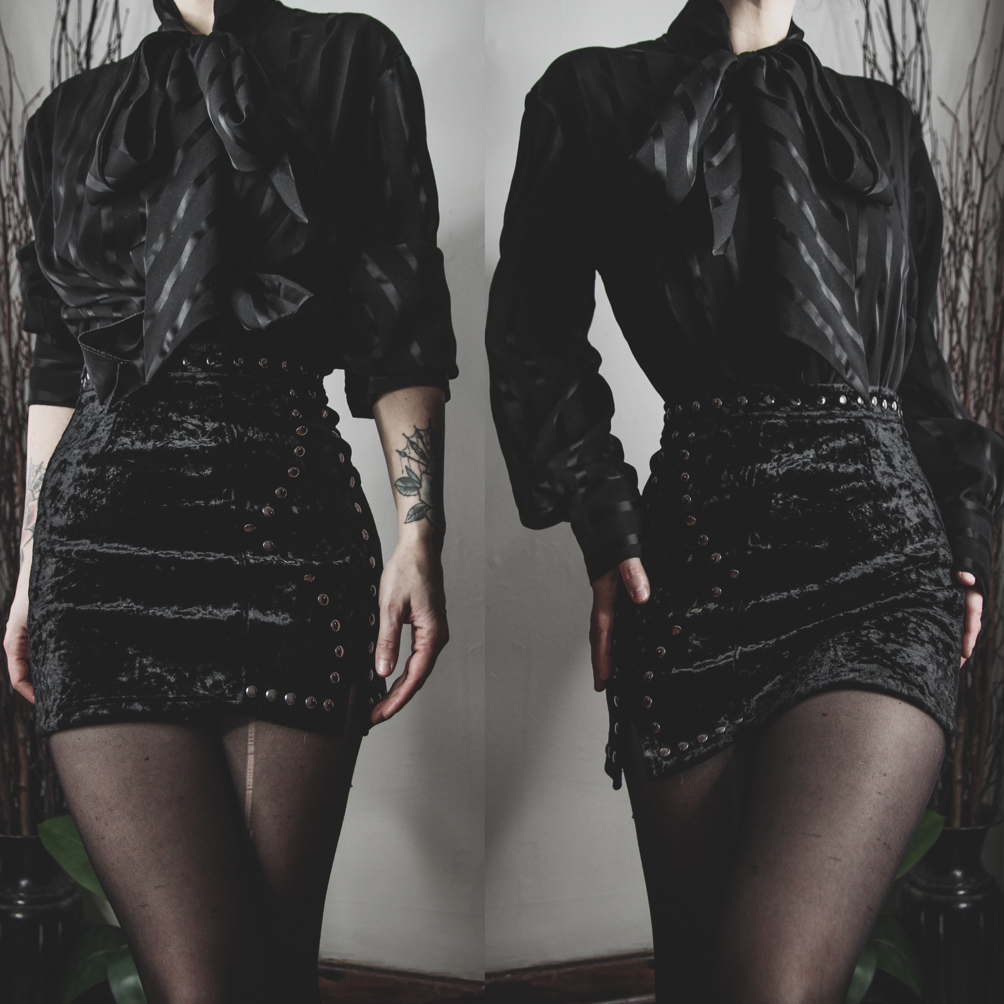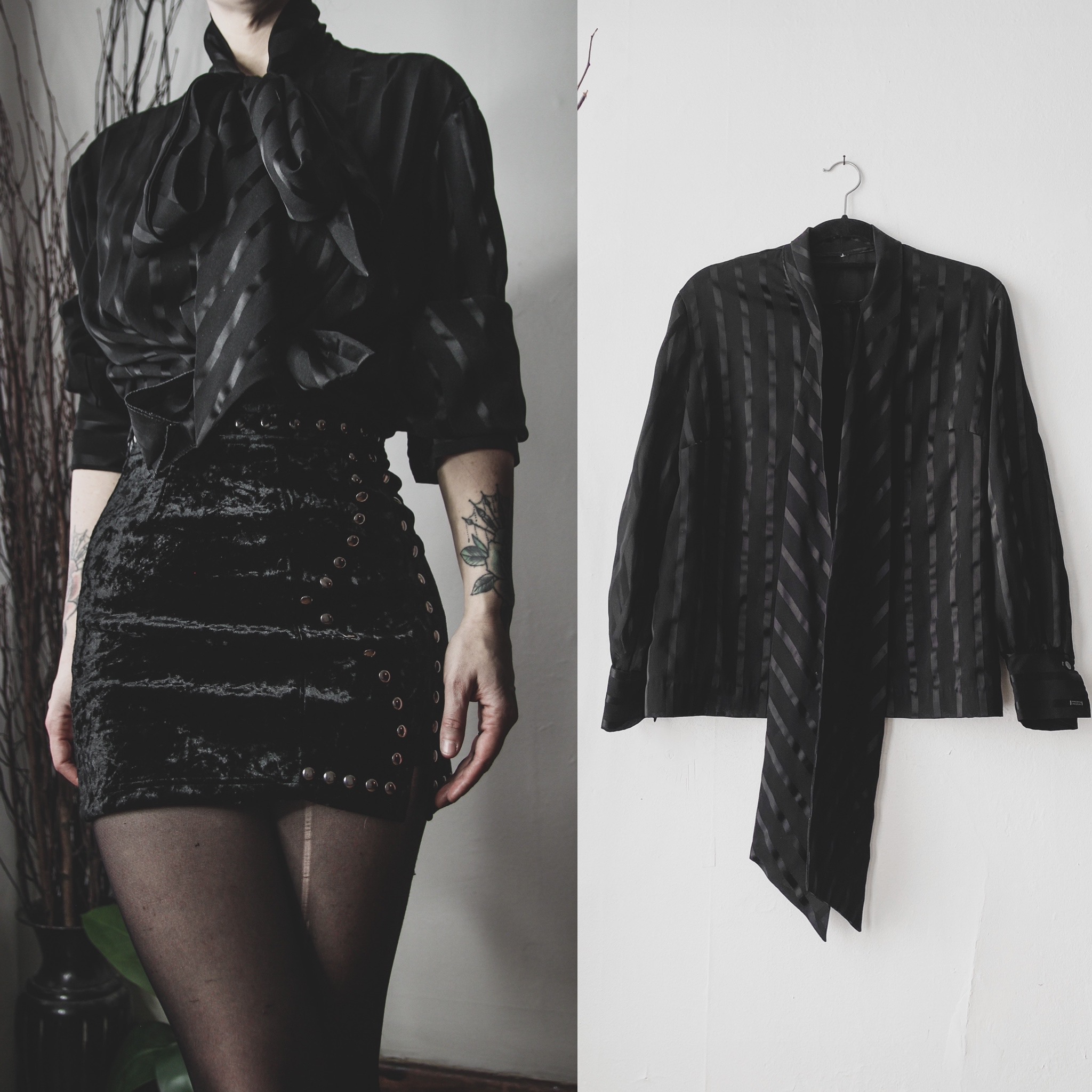 Vintage 90s satin stripe blouse. Functional buttons down the front. Oversize adjustable bow collar ties at the neck - each tie is 32" long! Semi-sheer poly blend fabric. Boxy cut, balloon sleeves with buttoned cuffs. Unlined, no stretch whatsoever. One mismatched button near the bottom, and the second buttons on each cuff are missing but can be easily replaced or repositioned.