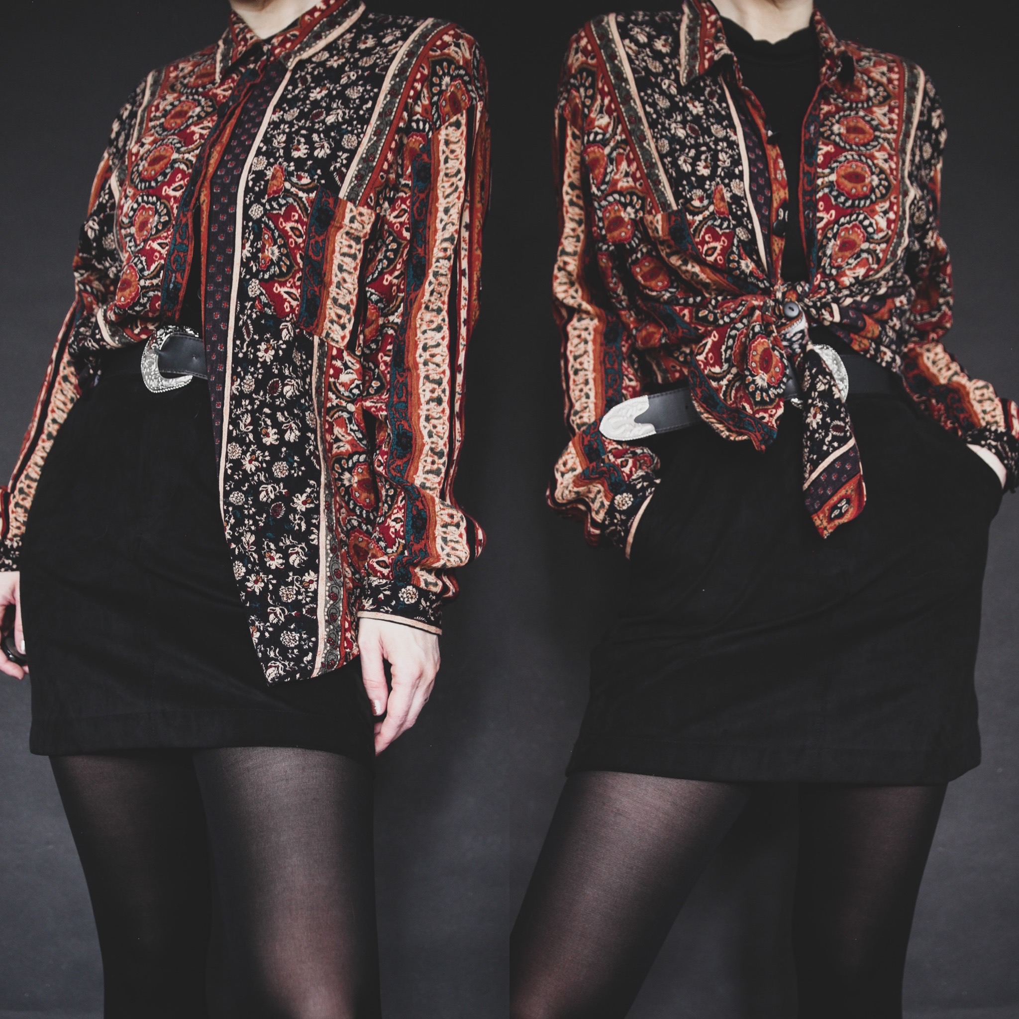 Vintage 90s Jessie floral blouse. Gorgeous print in a blend of colors (black, gray, oranges, red, burgundy, purple, blue and olive - it matches EVERYTHING!) Super soft, textured rayon fabric. Not stretchy but has a bit of “give”. Boxy cut, lightweight and flowy with a front pocket.