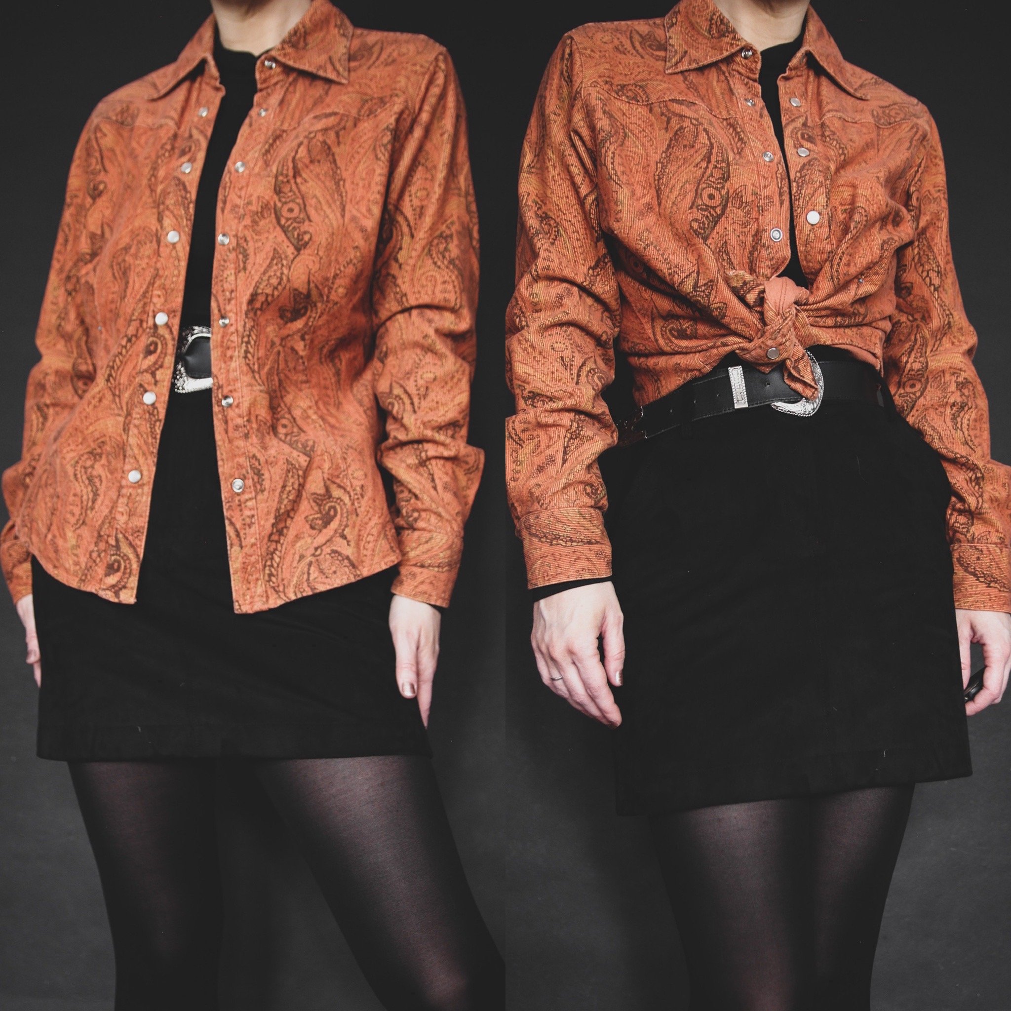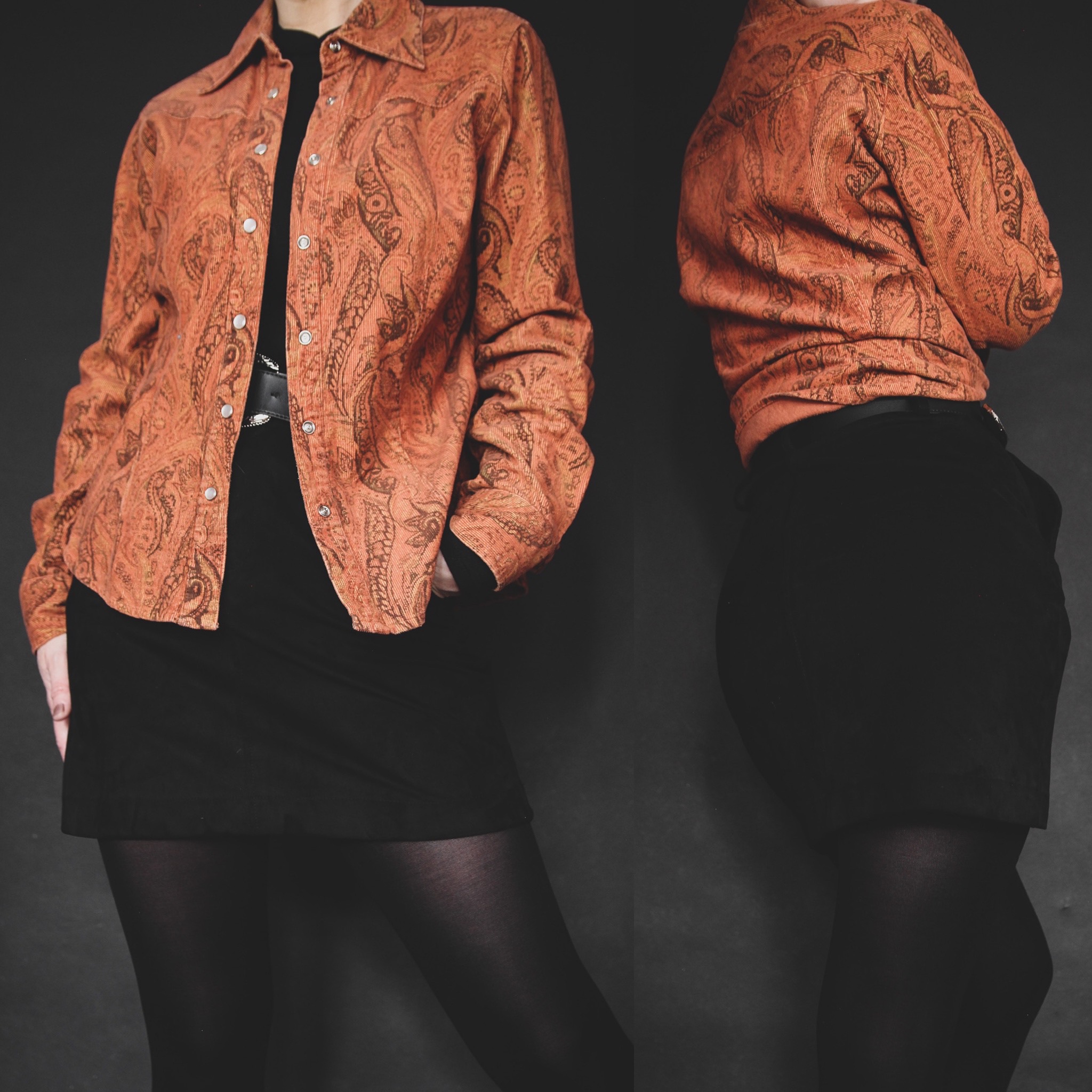 Vintage 90s orange corduroy top. 100% cotton with a faded paisley print, in the most perfect shade of pumpkin orange. Boxy, almost-cropped cut. Snap buttons. No stretch. Super soft and cozy, perfectly broken in.