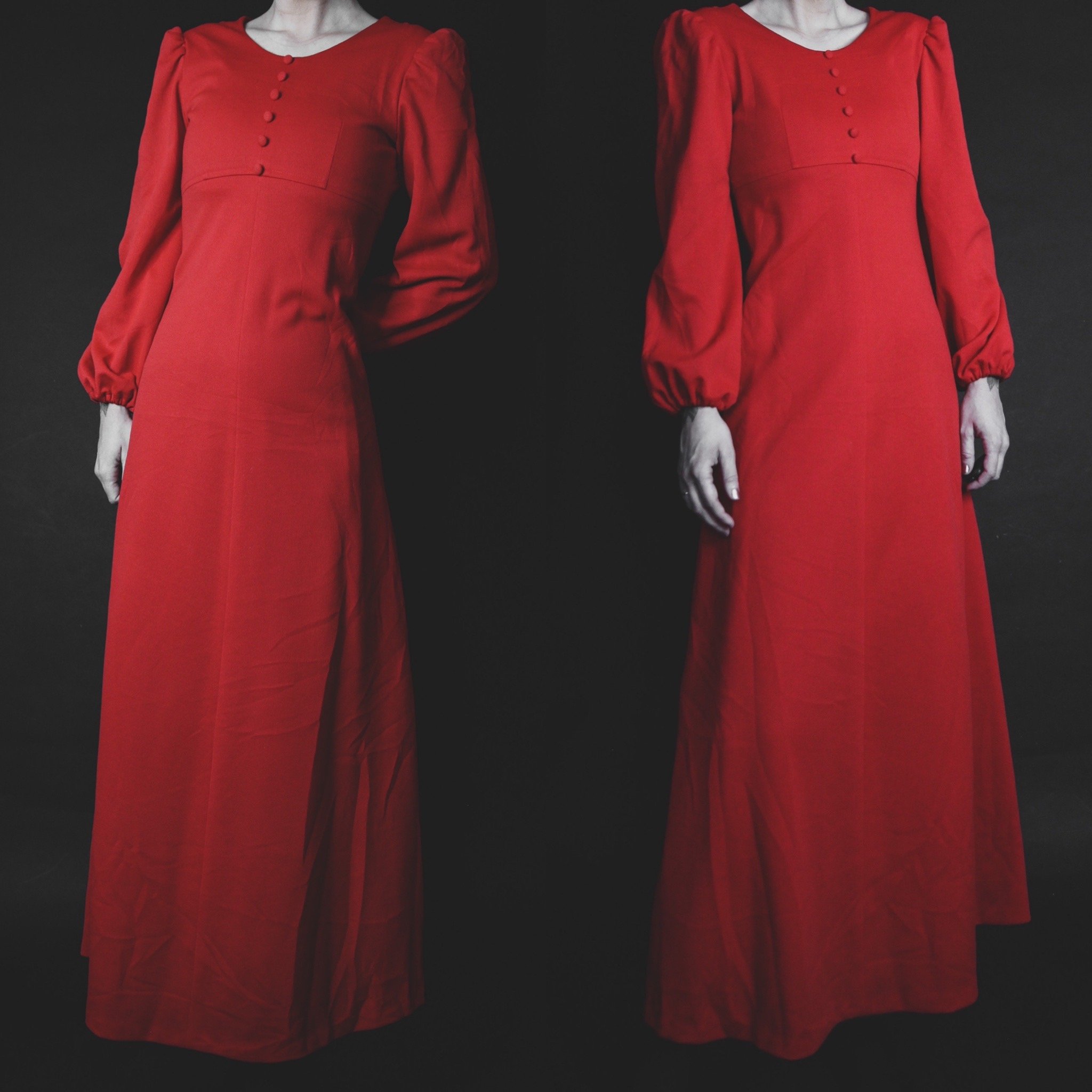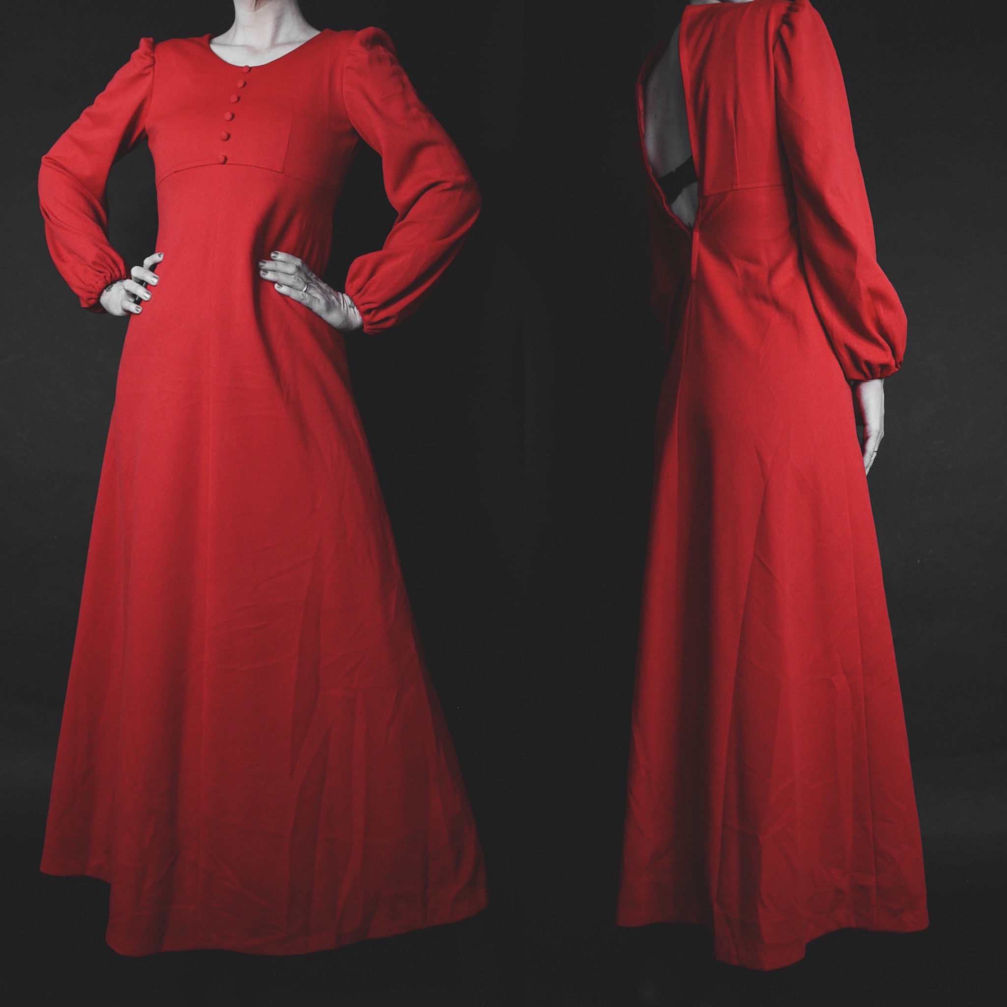 Vintage 70s handmade maxi dress. This one is a true retro collector’s item! Cherry red heavyweight polyester, fully lined in poly satin. Empire waist with button detailing, puffed shoulders, and gathered elastic sleeves. Back zip, no stretch whatsoever. She is VERY petite, especially in the top, so please refer to measurements!